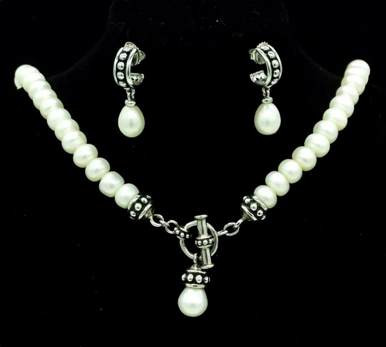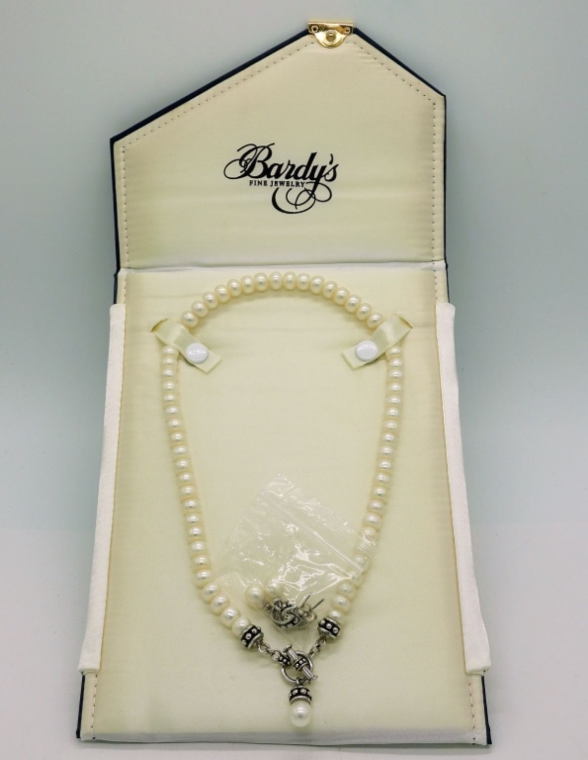 16″ Natural Pearl Necklace with matching earrings. Toggle is 925 Silver. Comes in a very nice case with “Bardy’s Fine Jewelry” Logo. Very Very Nice Set!