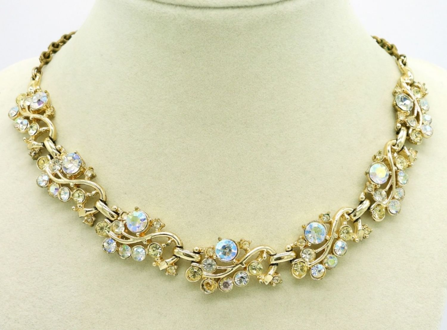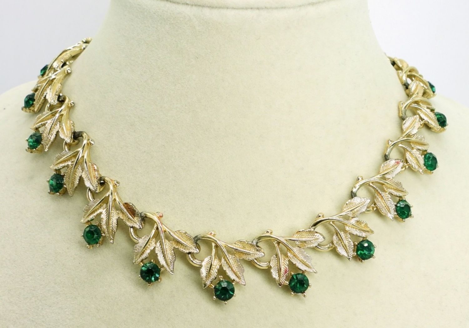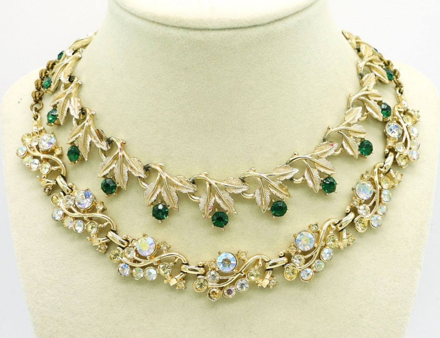 Vintage Coro Signed, Green Rhinestone Necklace, 17″. Not missing any stones. Vintage gold tone clear rhinestone necklace, 16″. Missing One Gemstone and Needs a Replacement Clasp.
