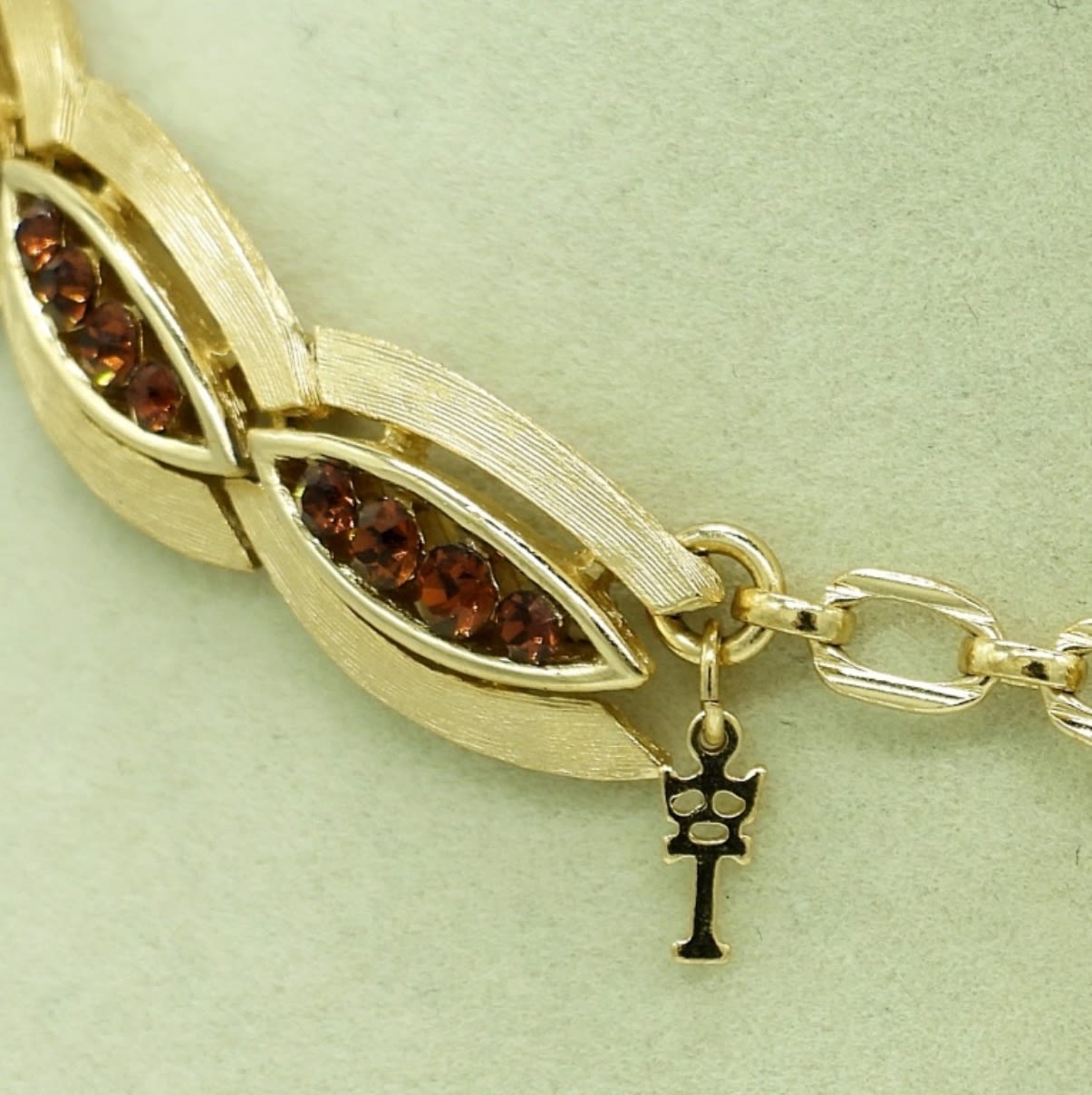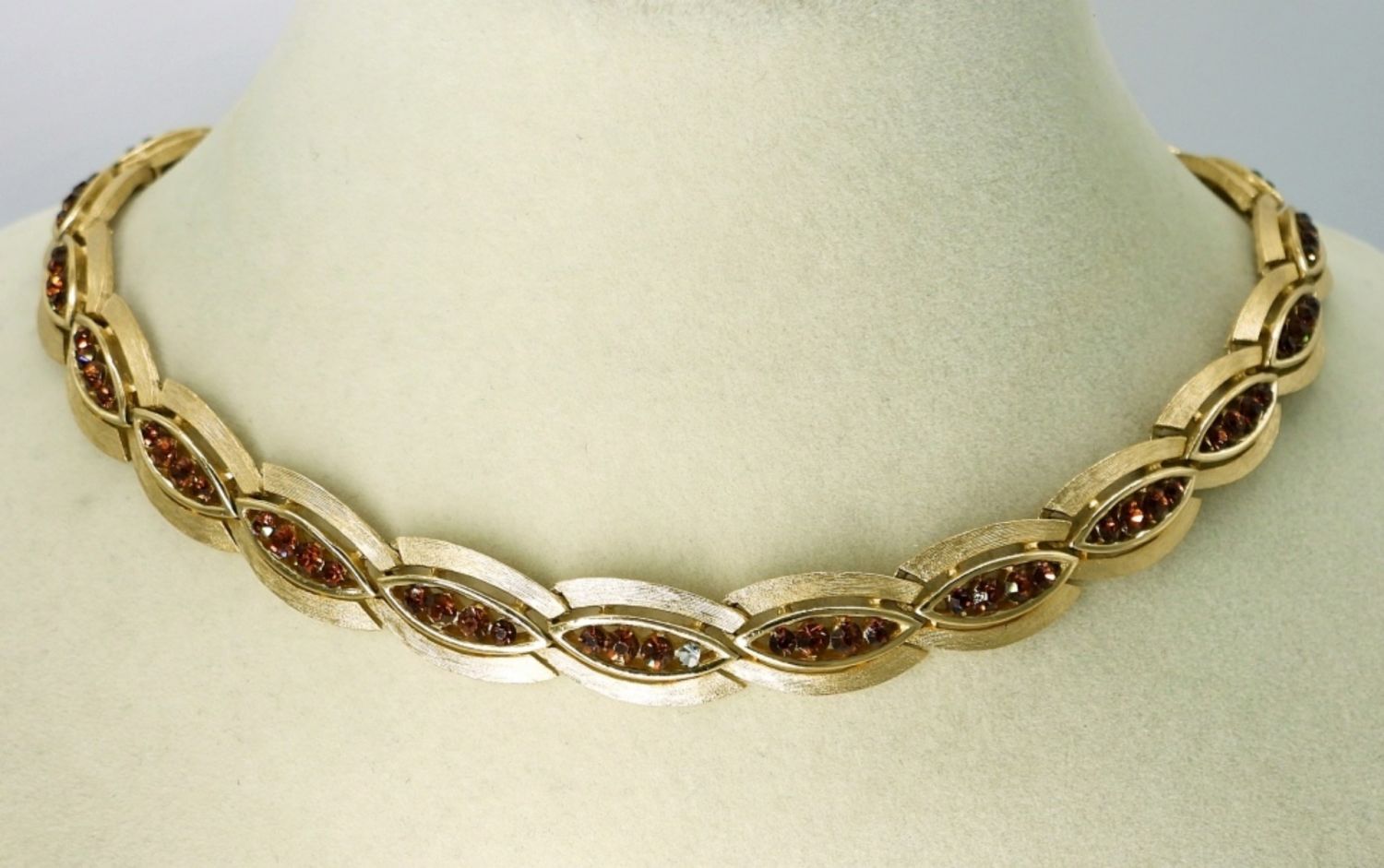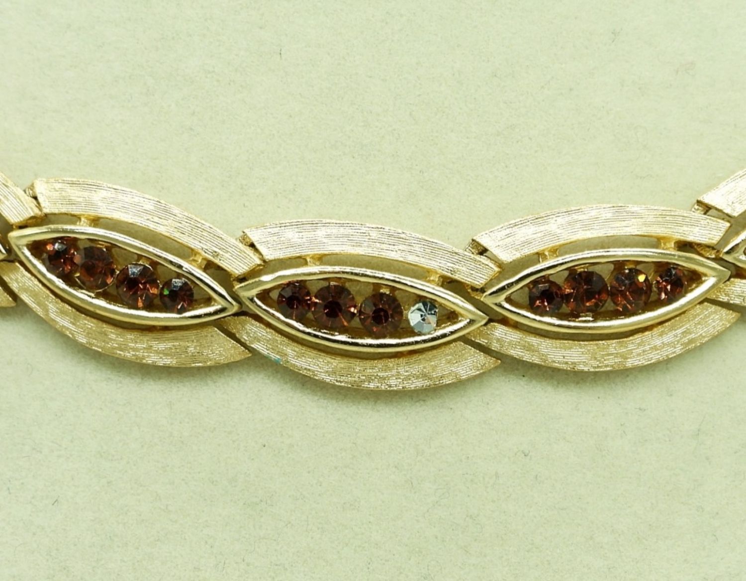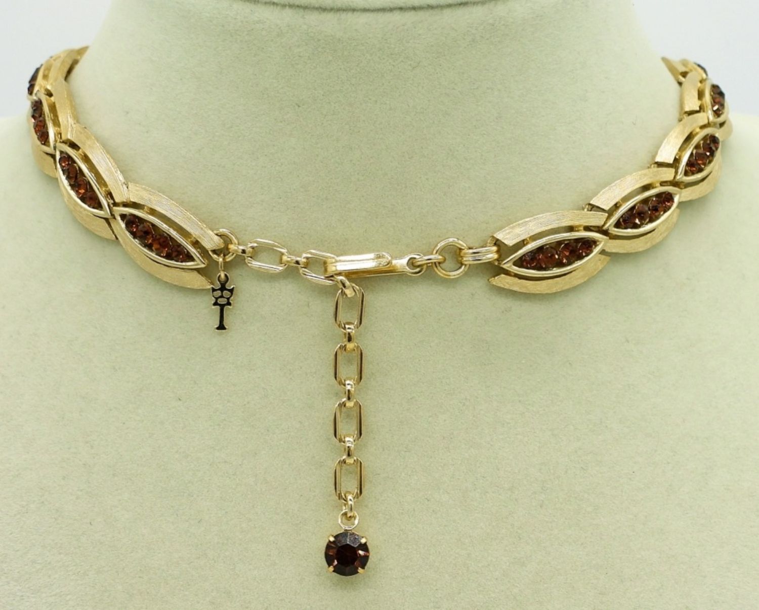 Vintage Trifari, Topaz Colored Rhinestone, Brushed Gold Tone Necklace, 16″ adjustable. Missing One Small Rhinestone.