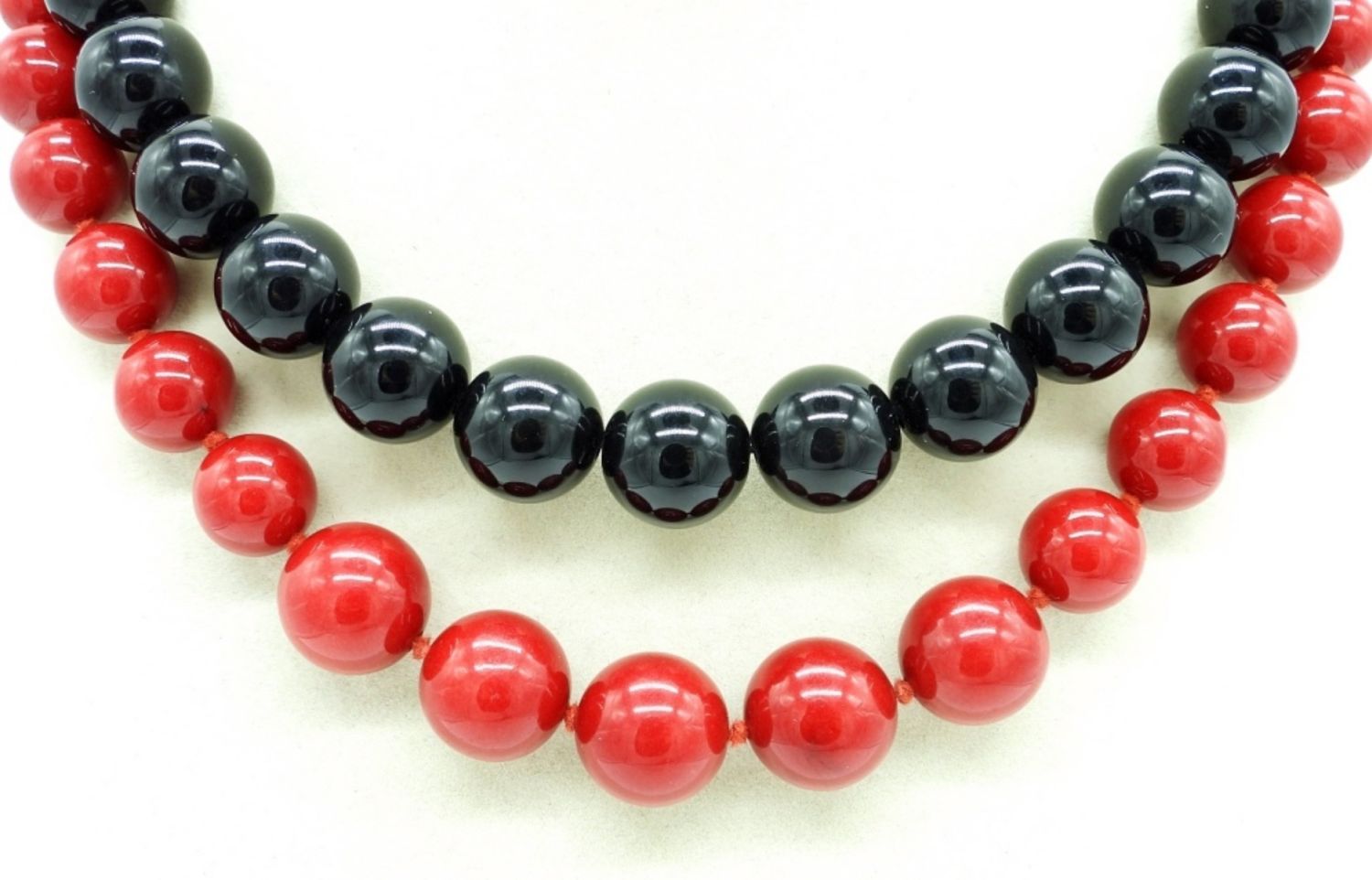 Two Vintage Bead Necklaces. Red Heavy Beaded Necklace (These are a gemstones of some sort) – 22″ with 12K Gold Clasp. Black Plastic Bead Necklace – 15″ with a 12K Gold Clasp.