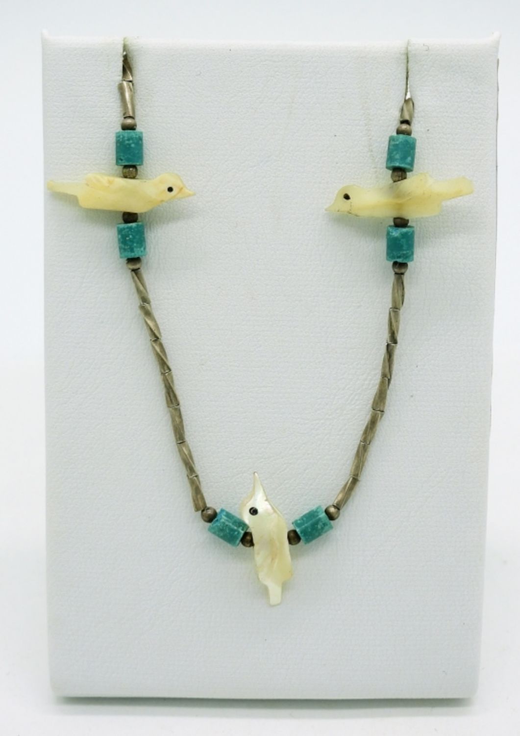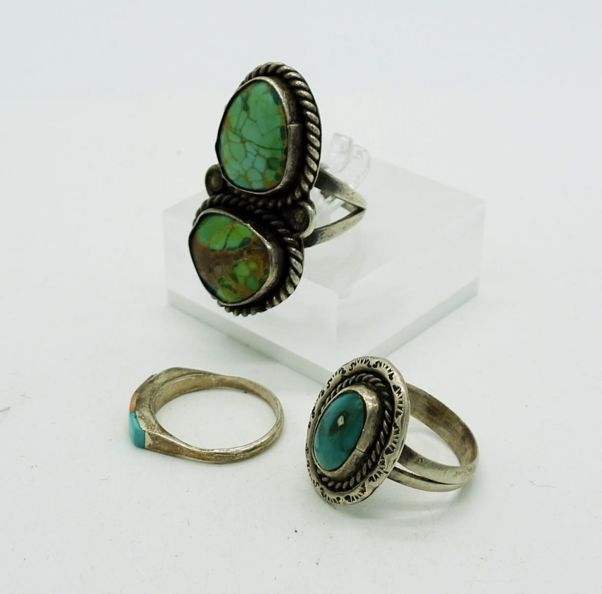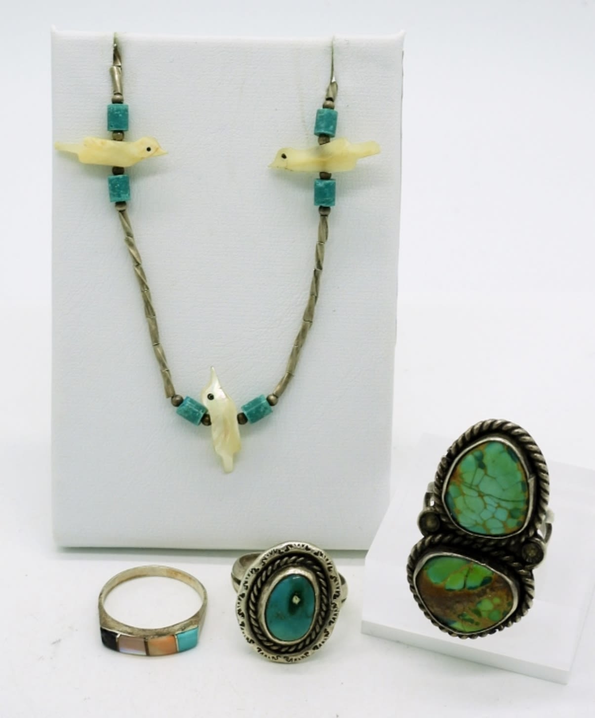 One Silver Tone Fetish necklace with Turquoise & Mother of Pearl Beads, 16.5″. Three Silver Tone Rings with Turquoise and Inlay, Sizes 6, 7, 8. None of this has any markings, Nothing is marked 925 or Sterling.