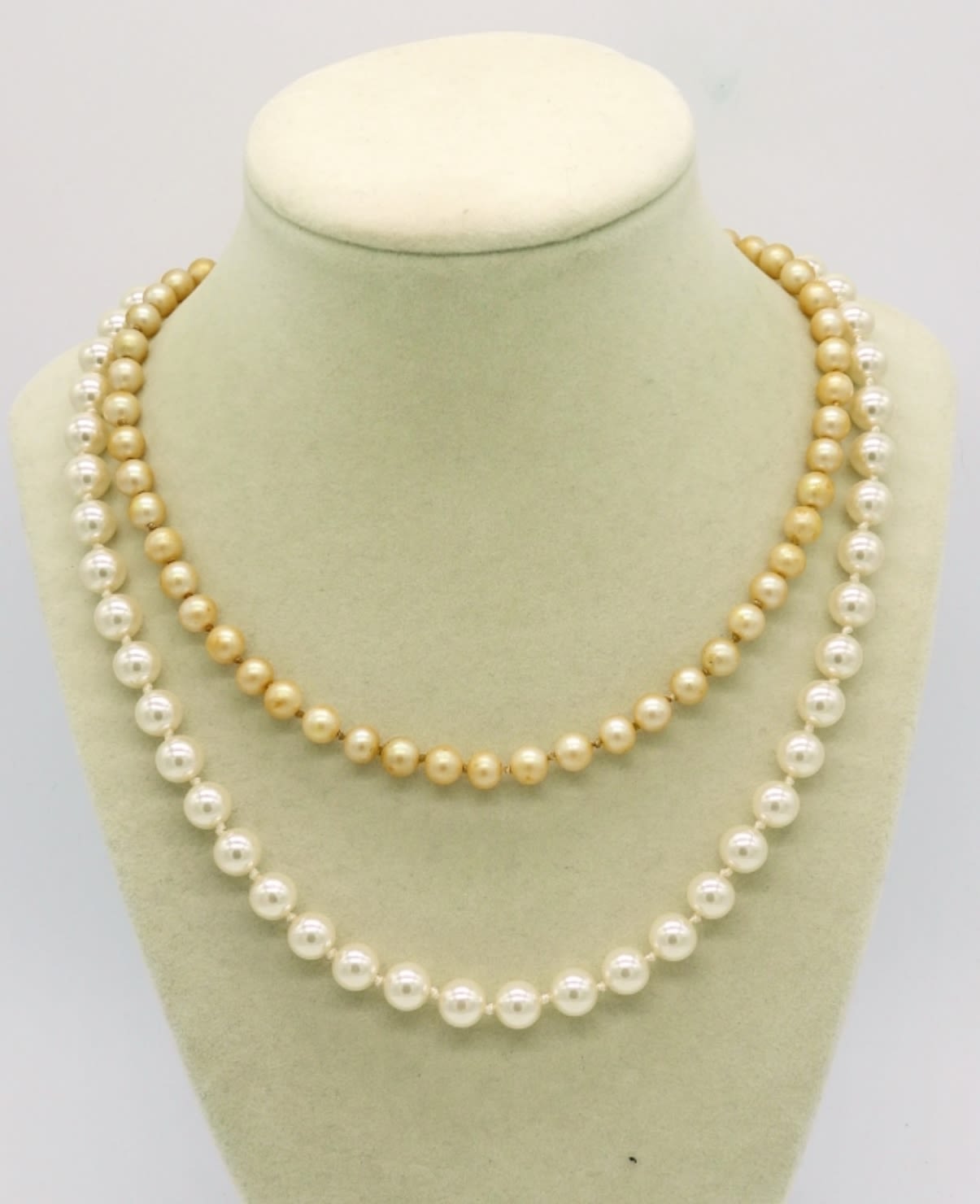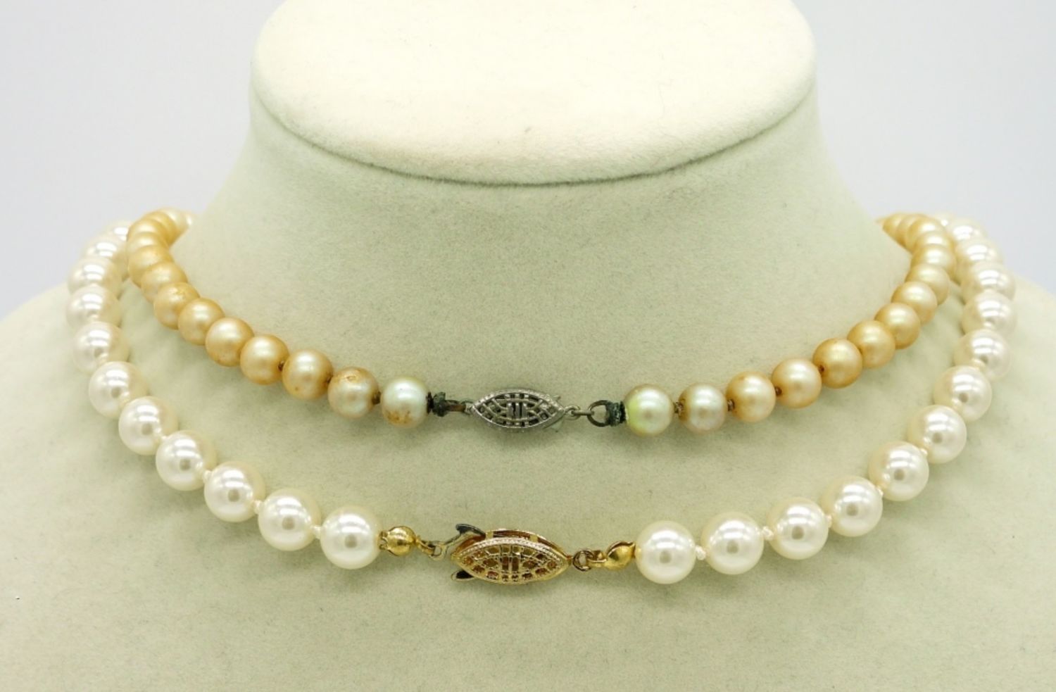 Two Vintage Strands of Pearls, Gold and Silver Tone Clasps. 18″ & 14″. Faux? Real? I don’t know.