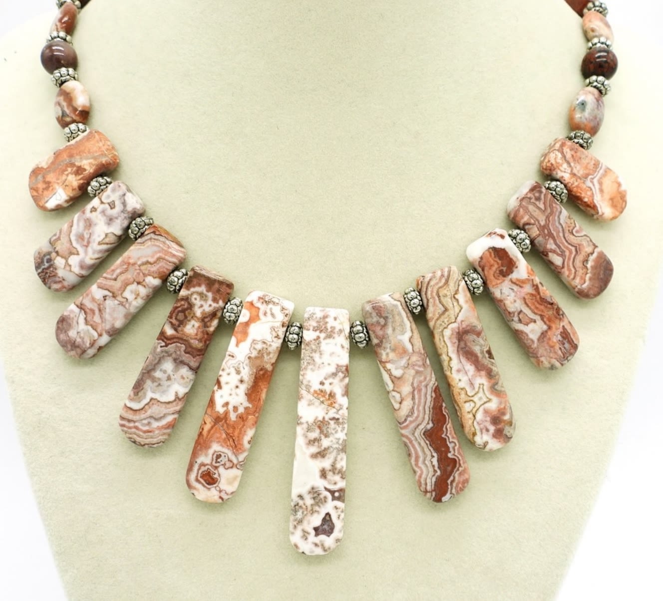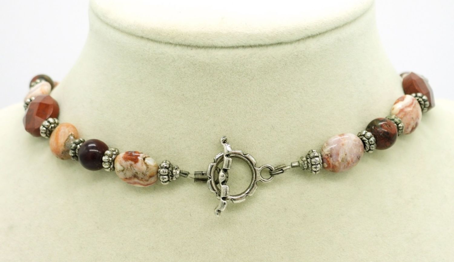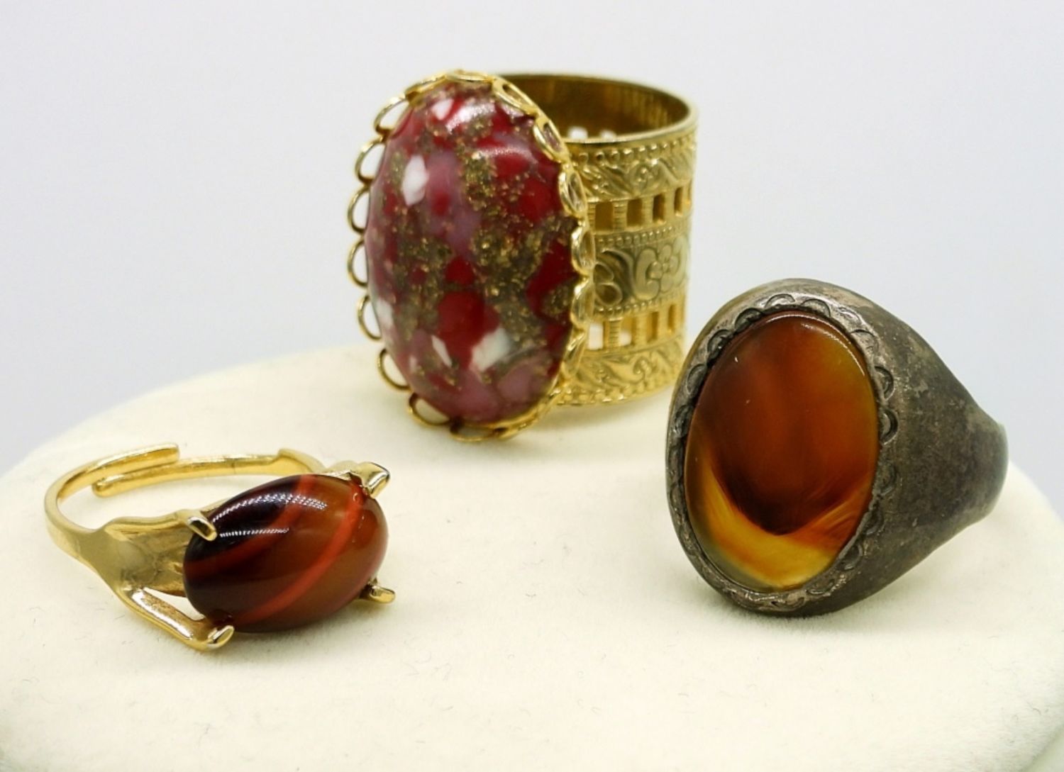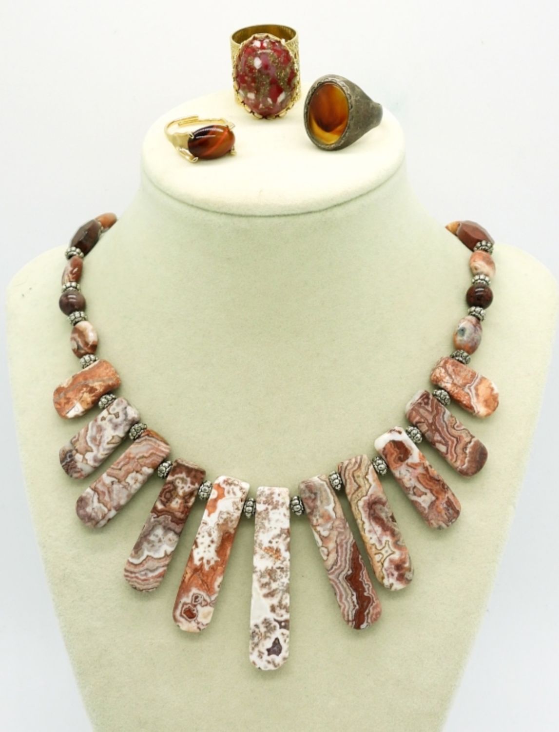 Fashion Jasper Gemstone Necklace, 20″. Three Red Gemstone Rings in Gold and Silver. Silver tone Ring is Sarah Coventry Brand. Sizes 7, 8, 9.