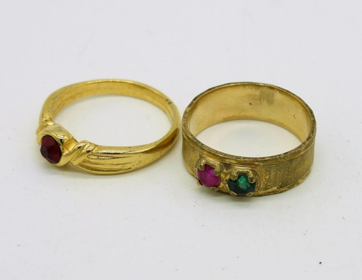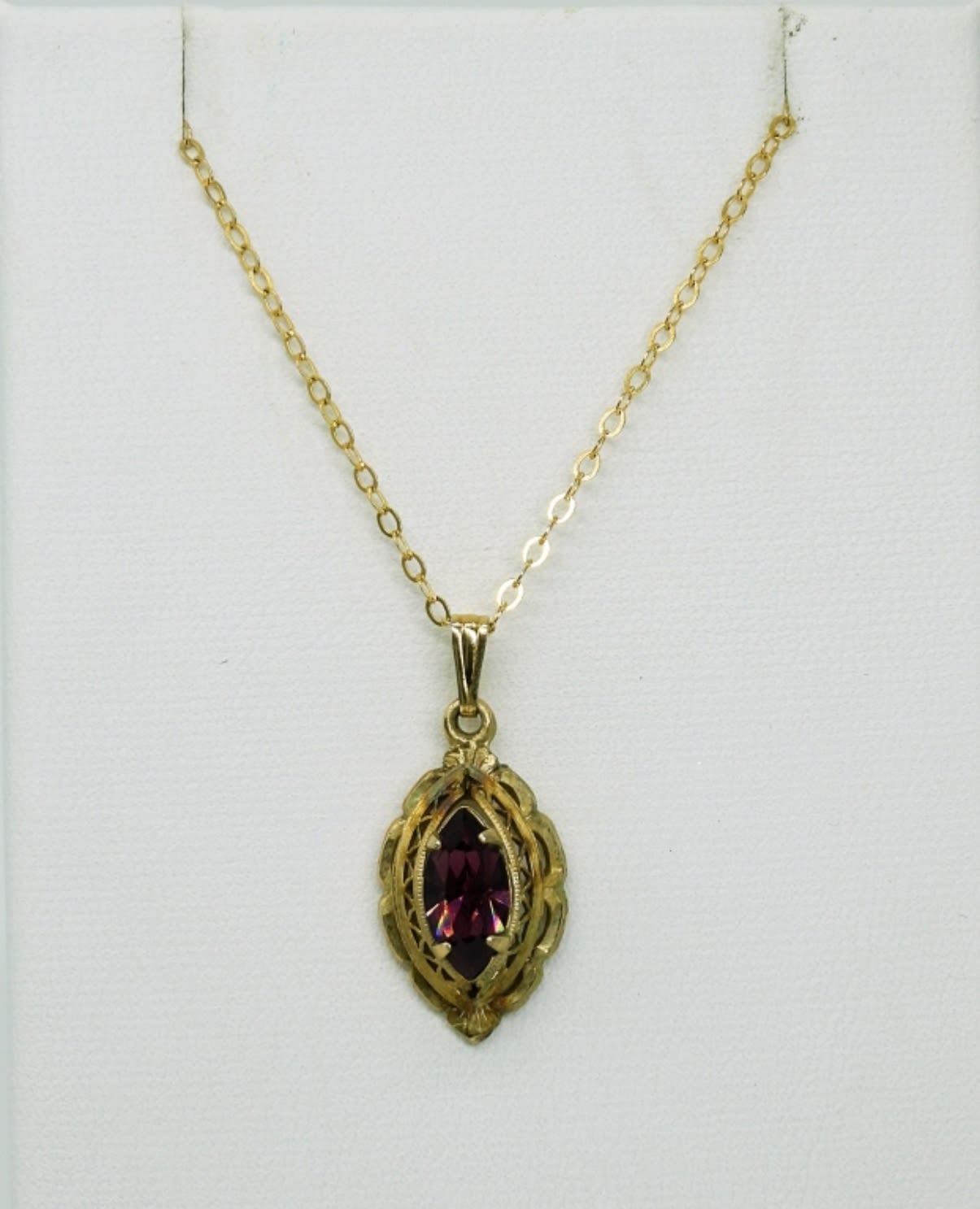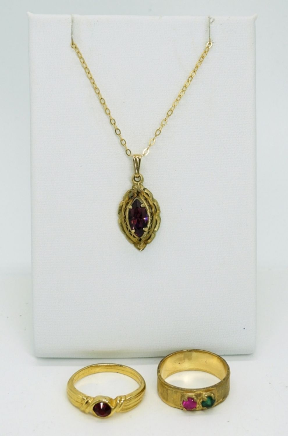 Vintage Gold Tone Necklace with a Purple Gemstone, 18″. Two Gold Tone Rings, One brushed metal with 2 gemstones. The other has a small round red gemstone. Sizes 5.5 & 6.5.
