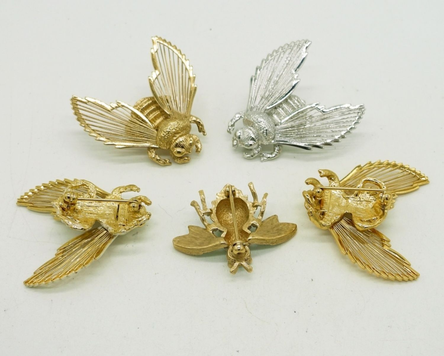 Four Monet Brand Moth Brooches, All the same except for color. 1.5″x 1″. One Gold Tone White Painted Moth Pin, 1″x 1″.