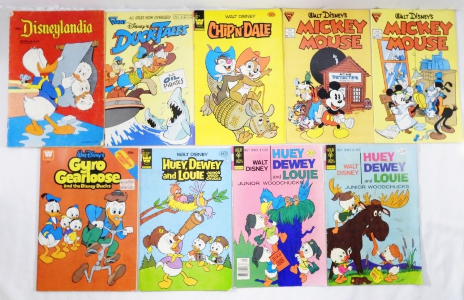 FROM GLADSTONE, GOLD KEY AND WHITMAN COMICS, ALL DIFFERENT, GOOD TO VG CONDITION, MICKEY MOUSE, CHIP’N’DALE, DUCKTALES, DISNEYLANDIA, HUEY,DEWEY AND LOUIE