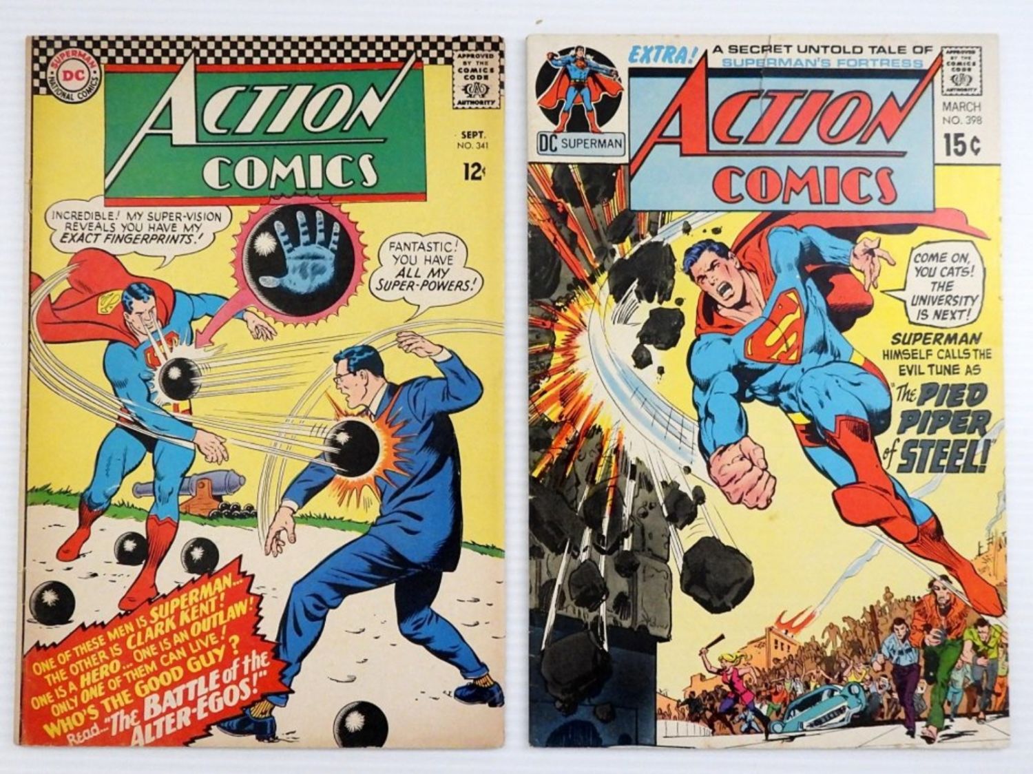 1966 ACTION COMICS ISSUE #341 SUPERMAN “THE BATTLE OF THE ALTER-EGOS”; 1971 ACTION COMICS ISSUE #398 SUPERMAN “THE PIED PIPER OF STEEL!”; VERY GOOD CONDITION SLEEVED & BOARDED