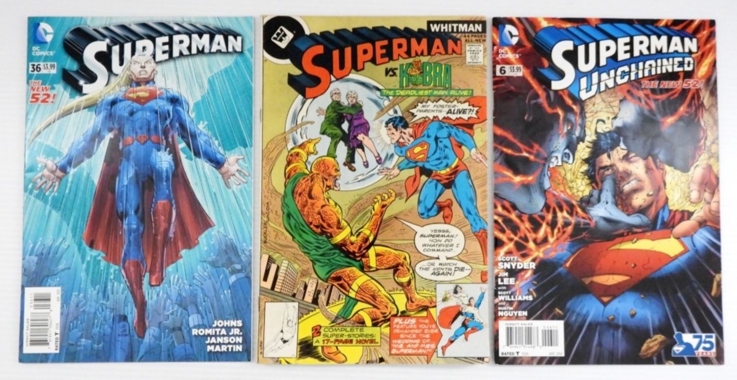1978 WHITMAN SUPERMAN VS. KOBRA ISSUE #327; 2014 DC SUPERMAN UNCHAINED THE NEW 52! ISSUE #6; 2015 DC SUPERMAN THE NEW 52! ISSUE #36; VERY NICE CONDITION & SLEEVED