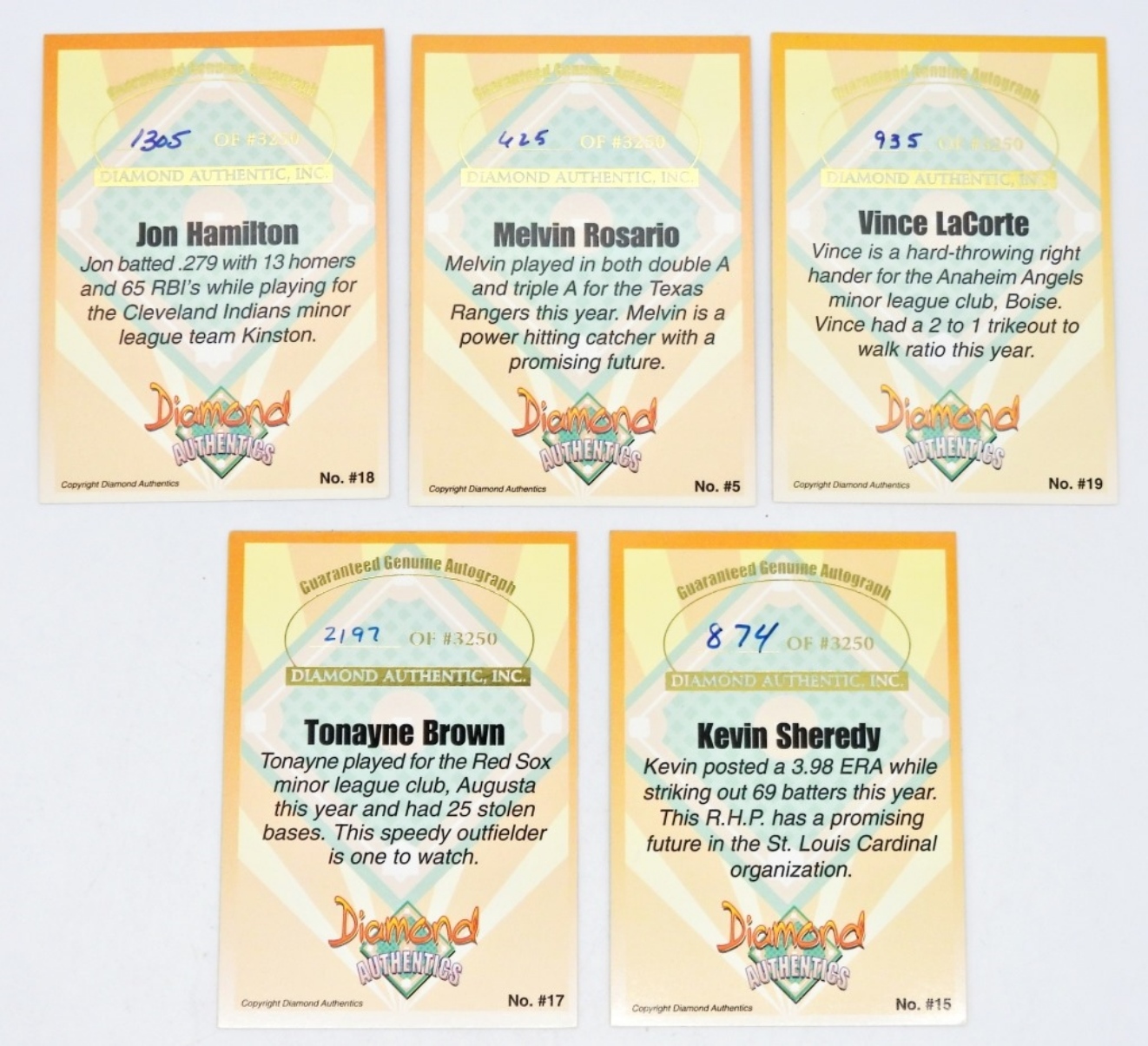 DIAMOND AUTHENTICS AUTOGRAPHED BASEBALL CARDS INCLUDING: JON HAMILTON, TONAYNE BROWN, MELVIN ROSARIO, VINCE LaCORTE, & KEVIN SHEREDY; VERY NICE CONDITION