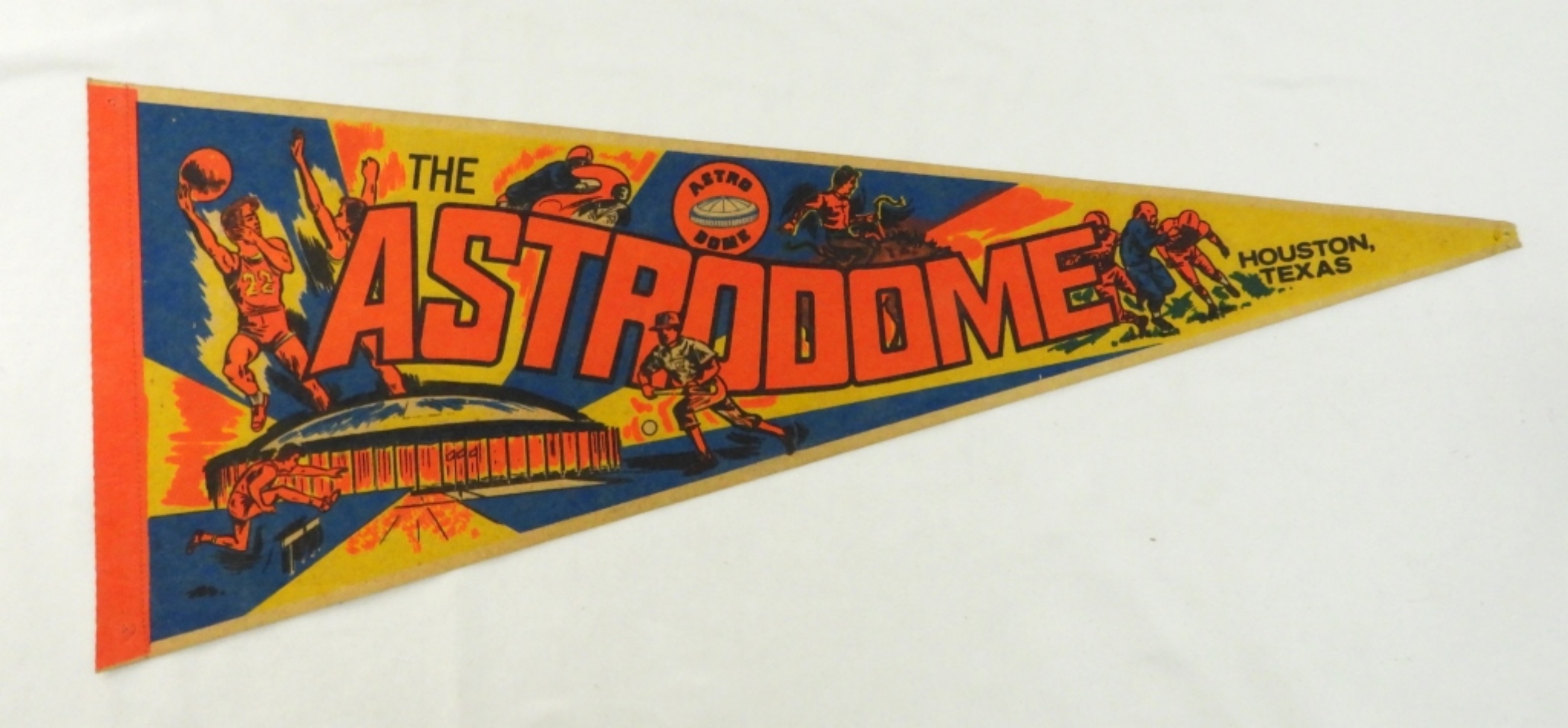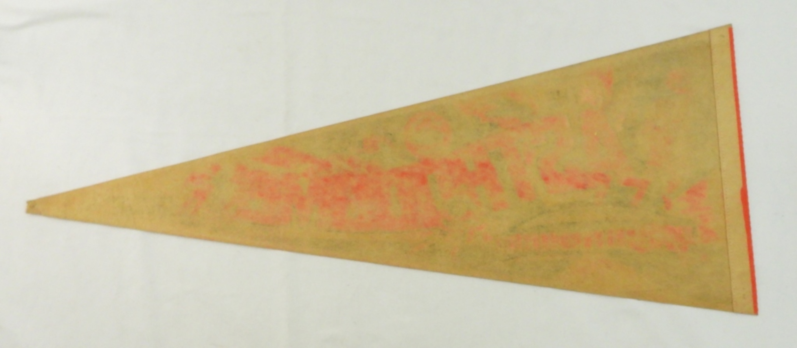 30X12, DOES HAVE FADED FROM THE YEARS AND DOES HAVE PIN HOLES IN SOME SPOTS, RIP AT END POINT OF PENNANT, IN A PENNANT SLEEVE