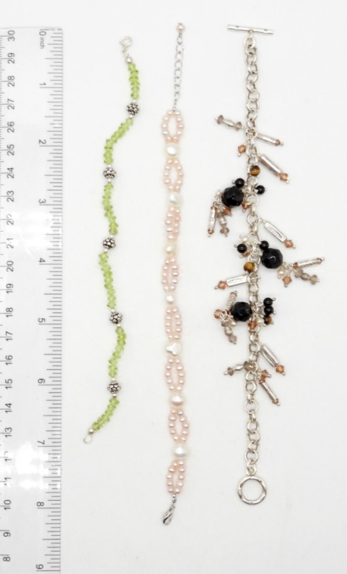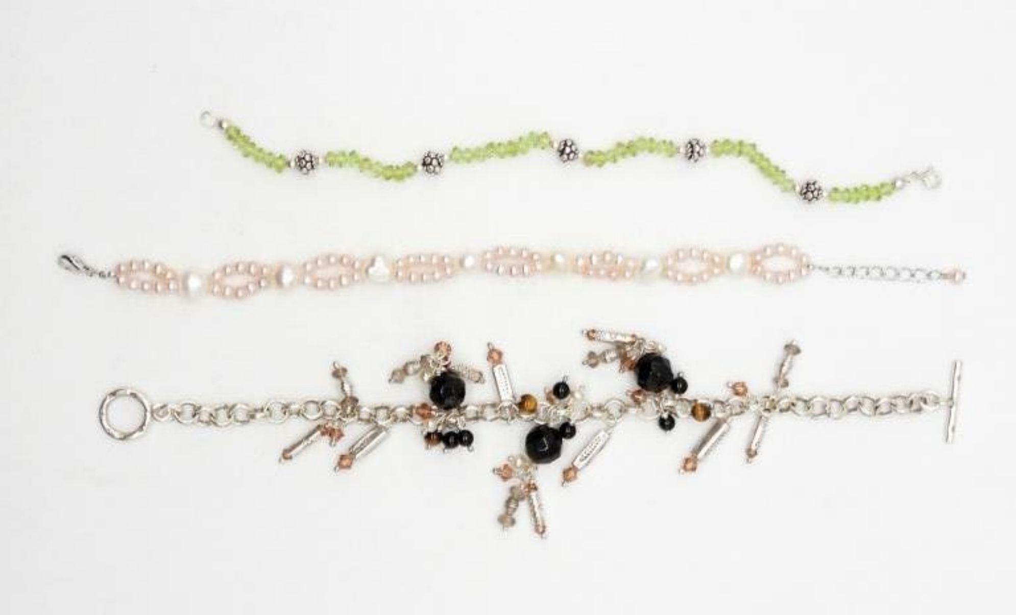 8″ STERLING & BEADED BRACELETS WITH MOTHER OF PEARL, ONYX, & GEMSTONES