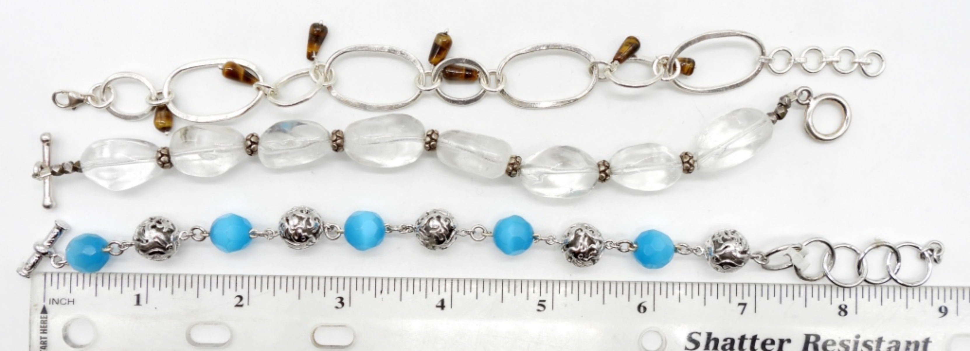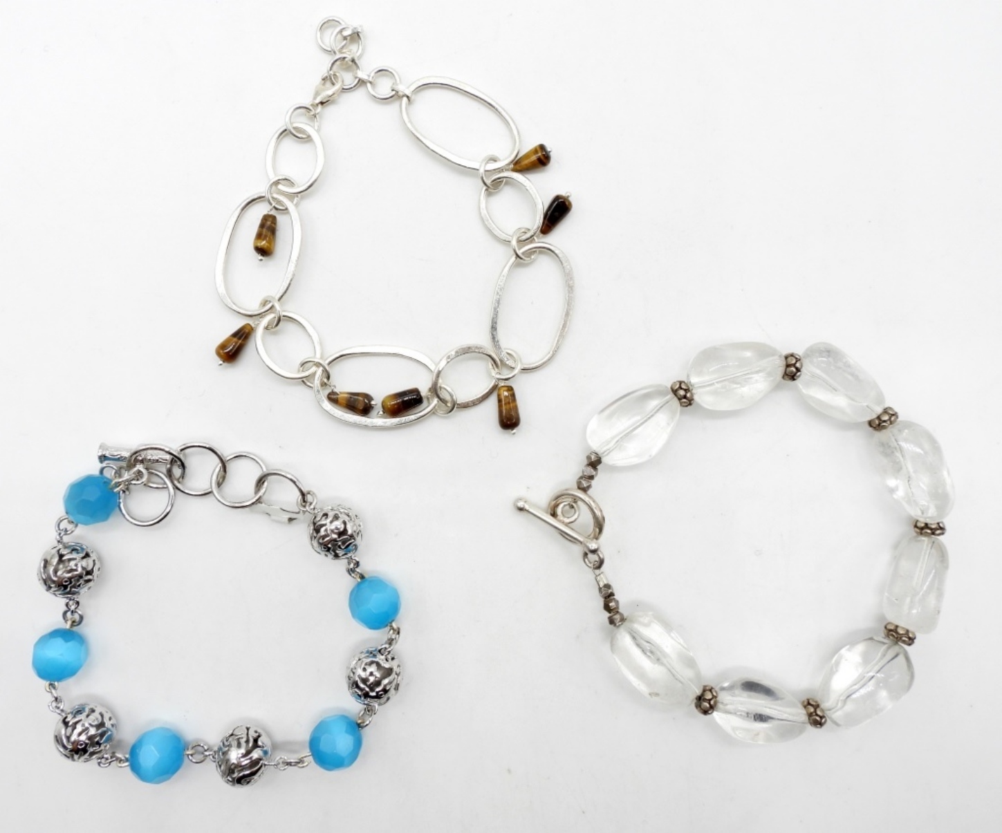 23.5DWT, 1 CLEAR NATURAL STONE WITH STERLING BEADS WITH TOGGLE CLASP 8 1/2IN LONG, 1 9IN LONG WITH STERLING AND BLUE BEADS, TOGGLE CLASP STAMPED 925, TIGER EYE BEADS LOBSTER CLASP 8IN LONG STAMPED 925