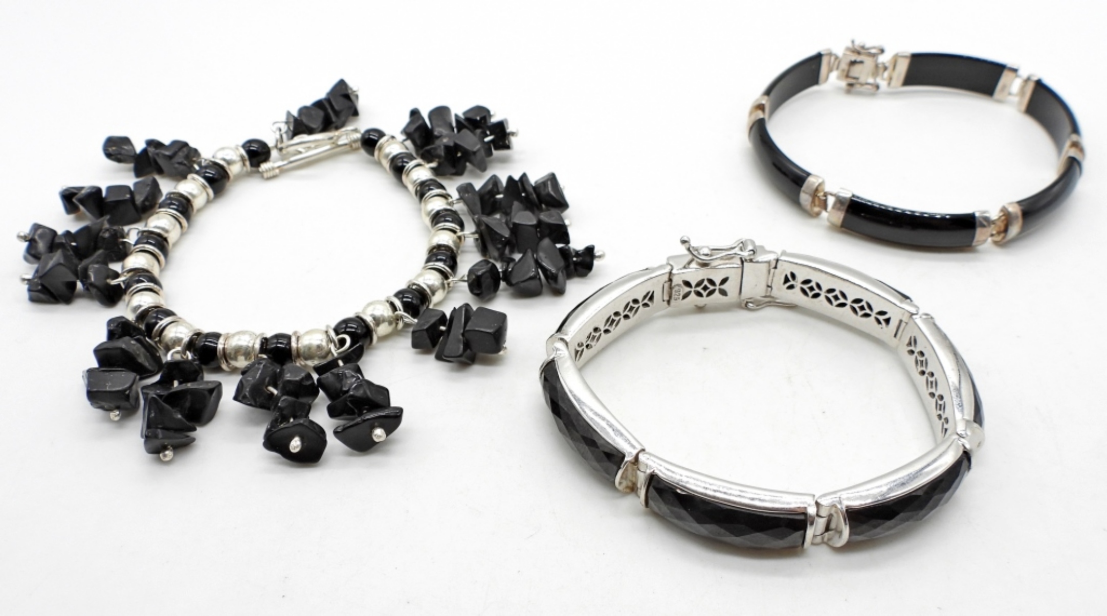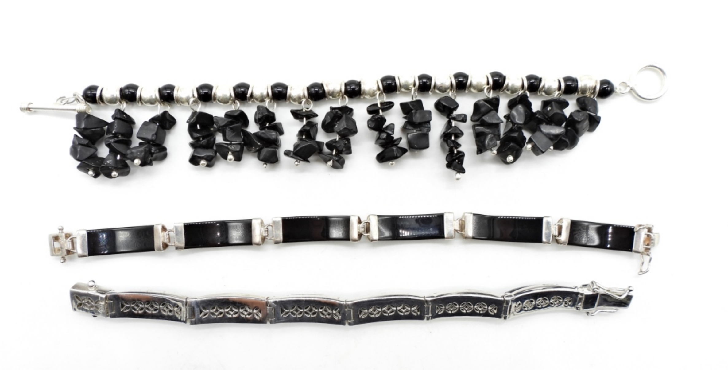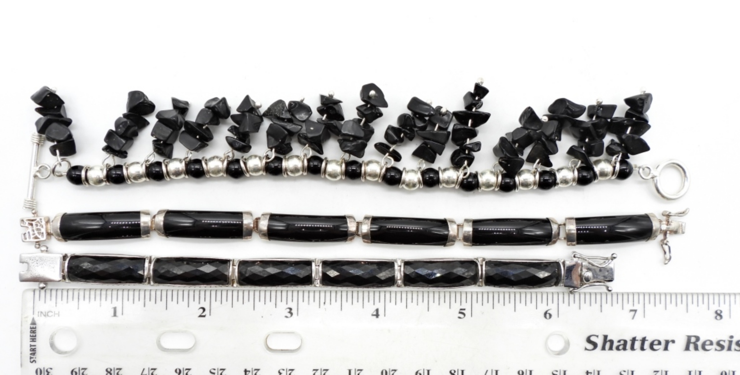 28DWT, 8 1/2IN LONG BLACK INLAY WITH BOX CLASP, STAMPED 925 ON THE BACK, 1 6 1/2IN LONG BLACK AND STERLING BRACELET WITH BOX CLASP STAMPED 925 ON THE BACK, 1- 7 1/2IN LONG DANGLED BLACK ONYX CHUCKS WITH STERLING AND BLACK BEADS WITH TOGGLE CLASP, NO STAMPING FOUND