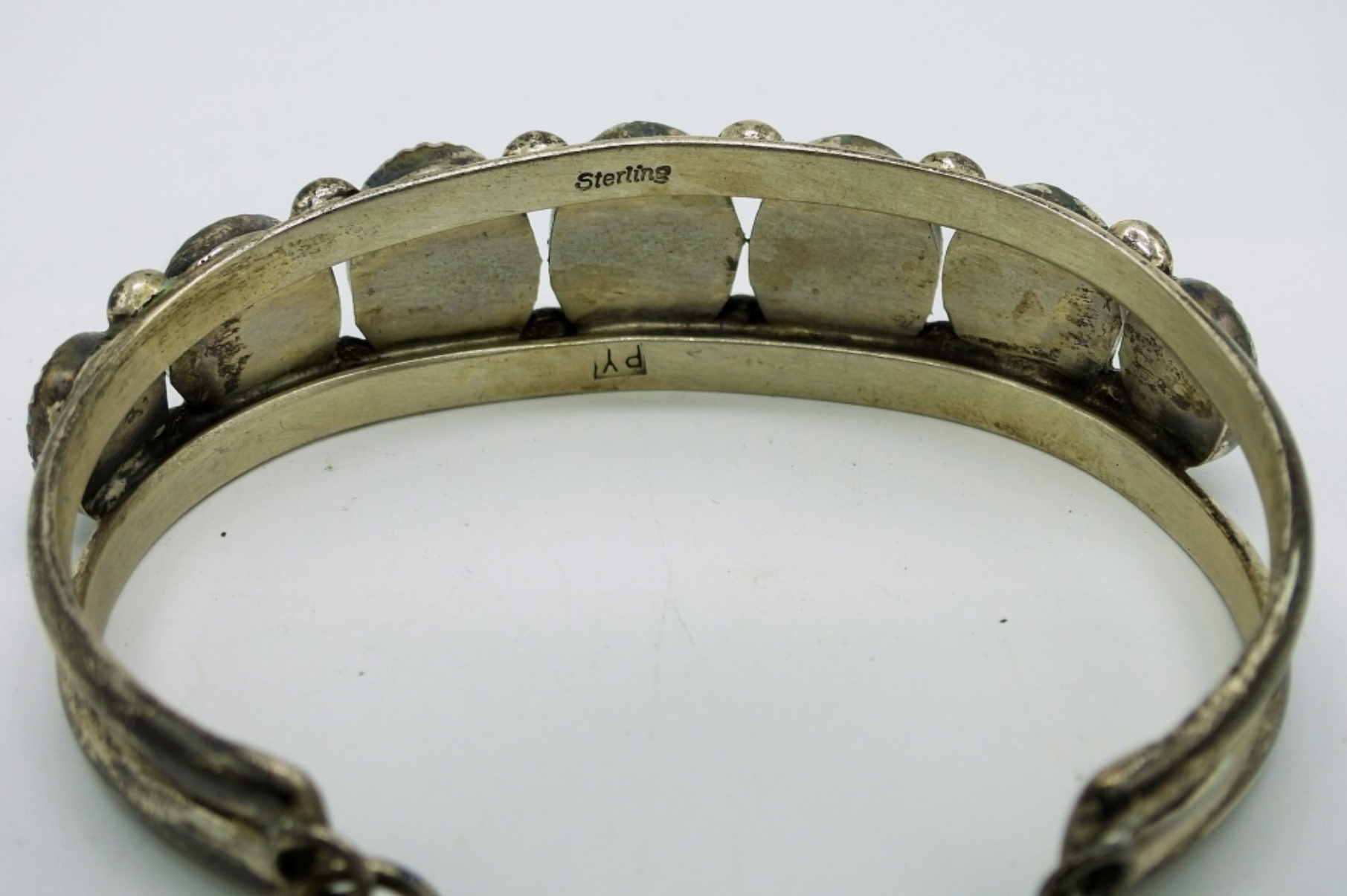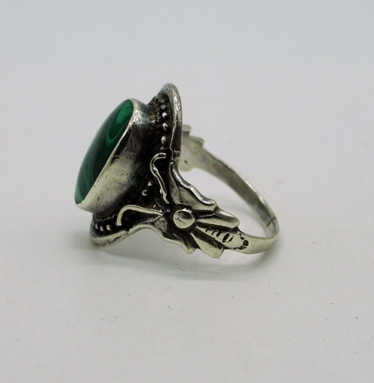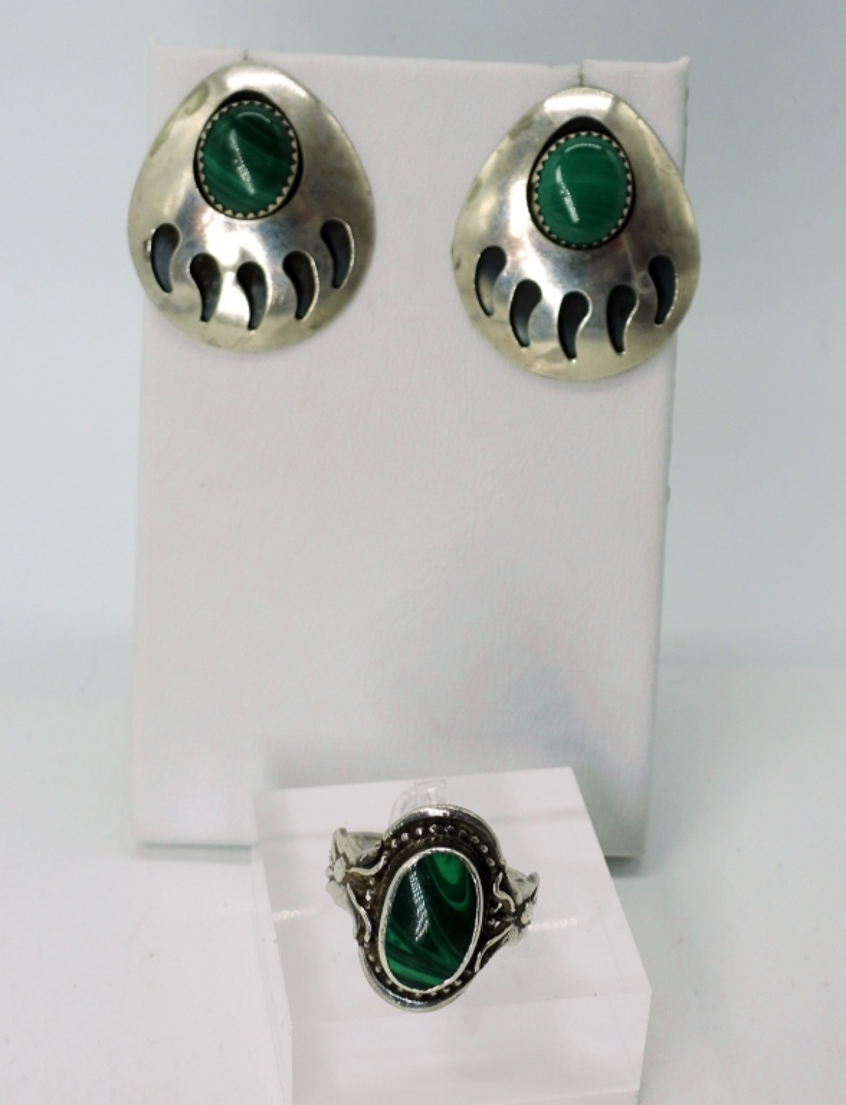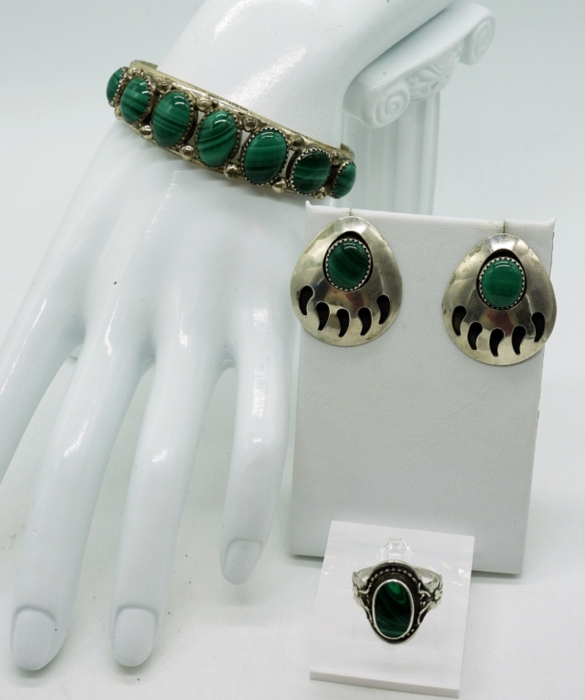 Vintage Sterling Silver Malachite Bear Claw Earrings, 1″x 1 1/4″. Malachite Ring Size 7.5. Vintage 7 Stone Malachite Sterling Bracelet, Cuff Style with safety clasp, 6″. 32 DWT