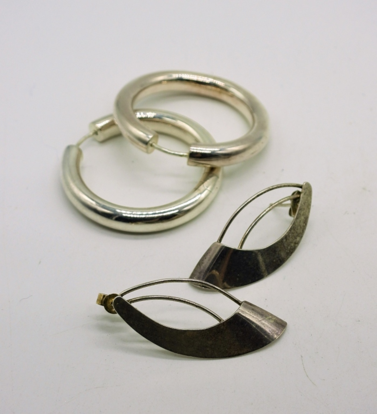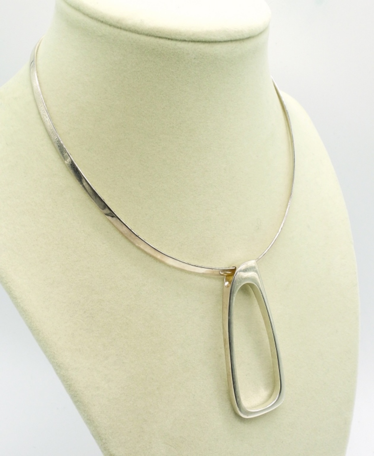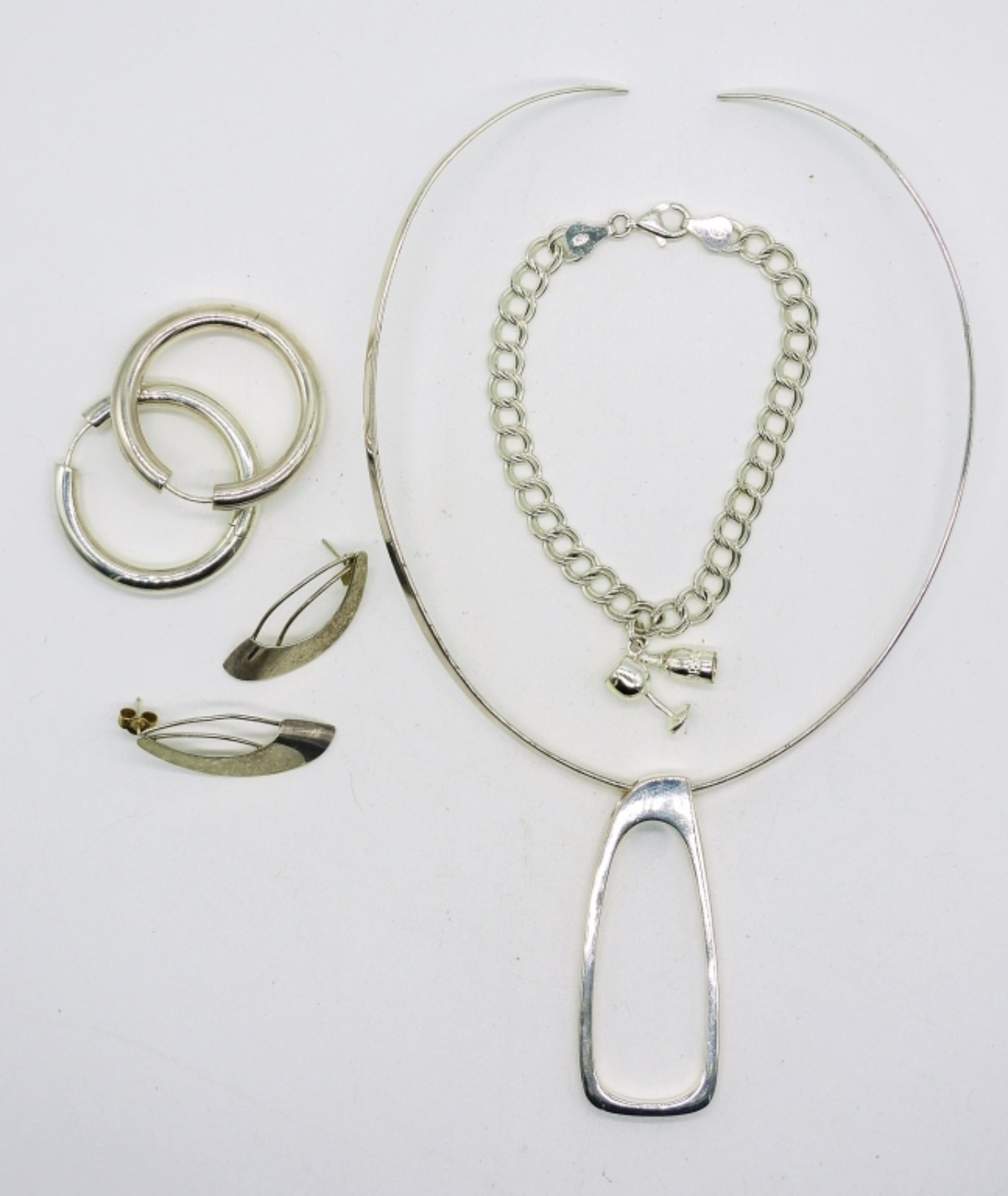 Choker Length solid Necklace with Large Sterling Modernist Pendant. Two Pair of Sterling Pierced Earrings and a 7 in charm bracelet with one sterling wine glass charm. 27.9DWT