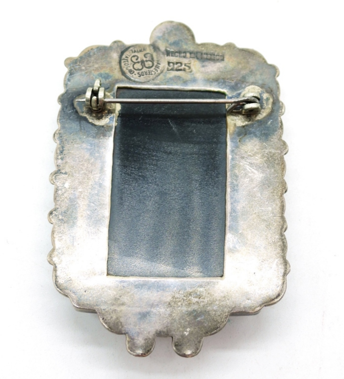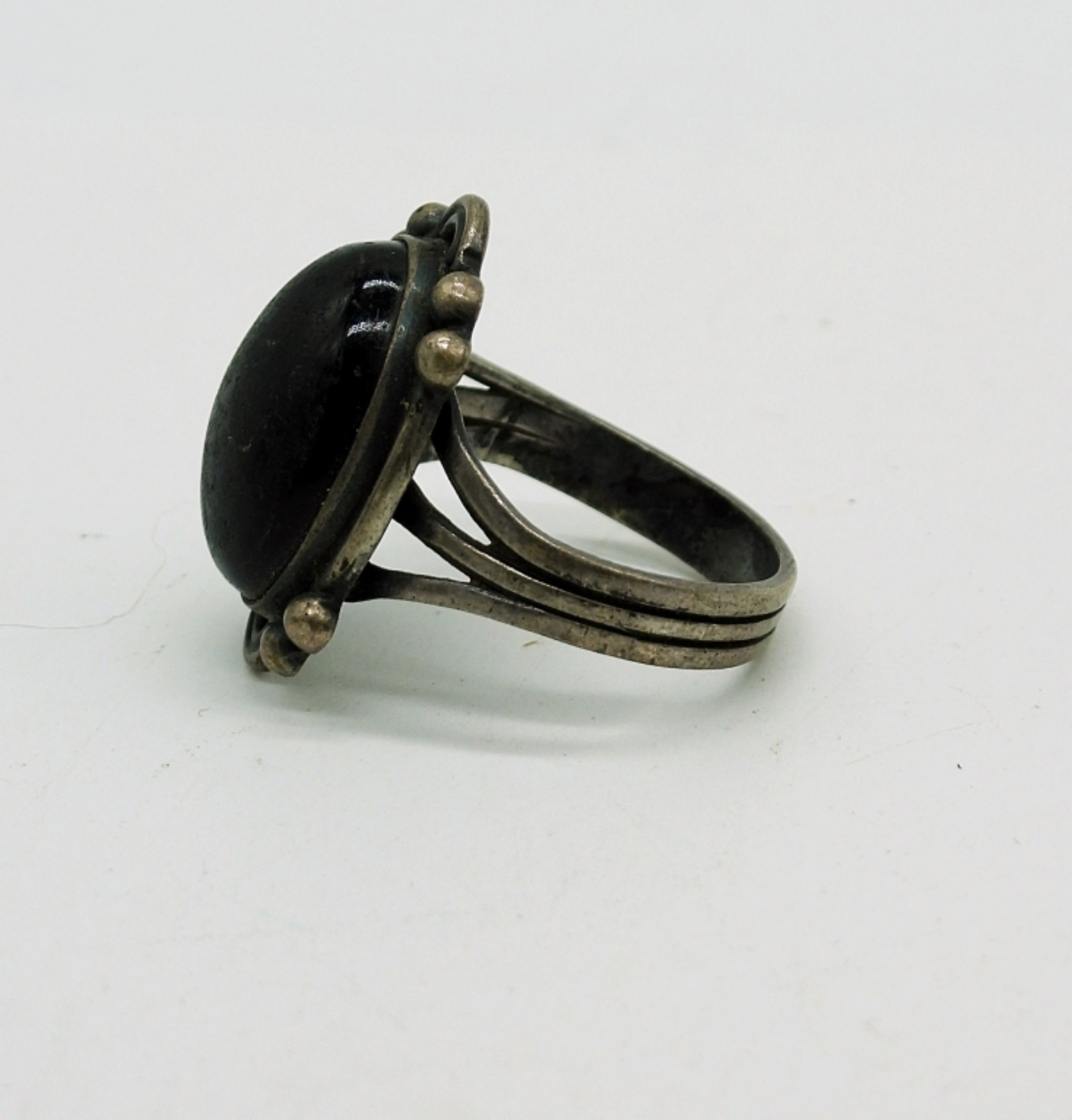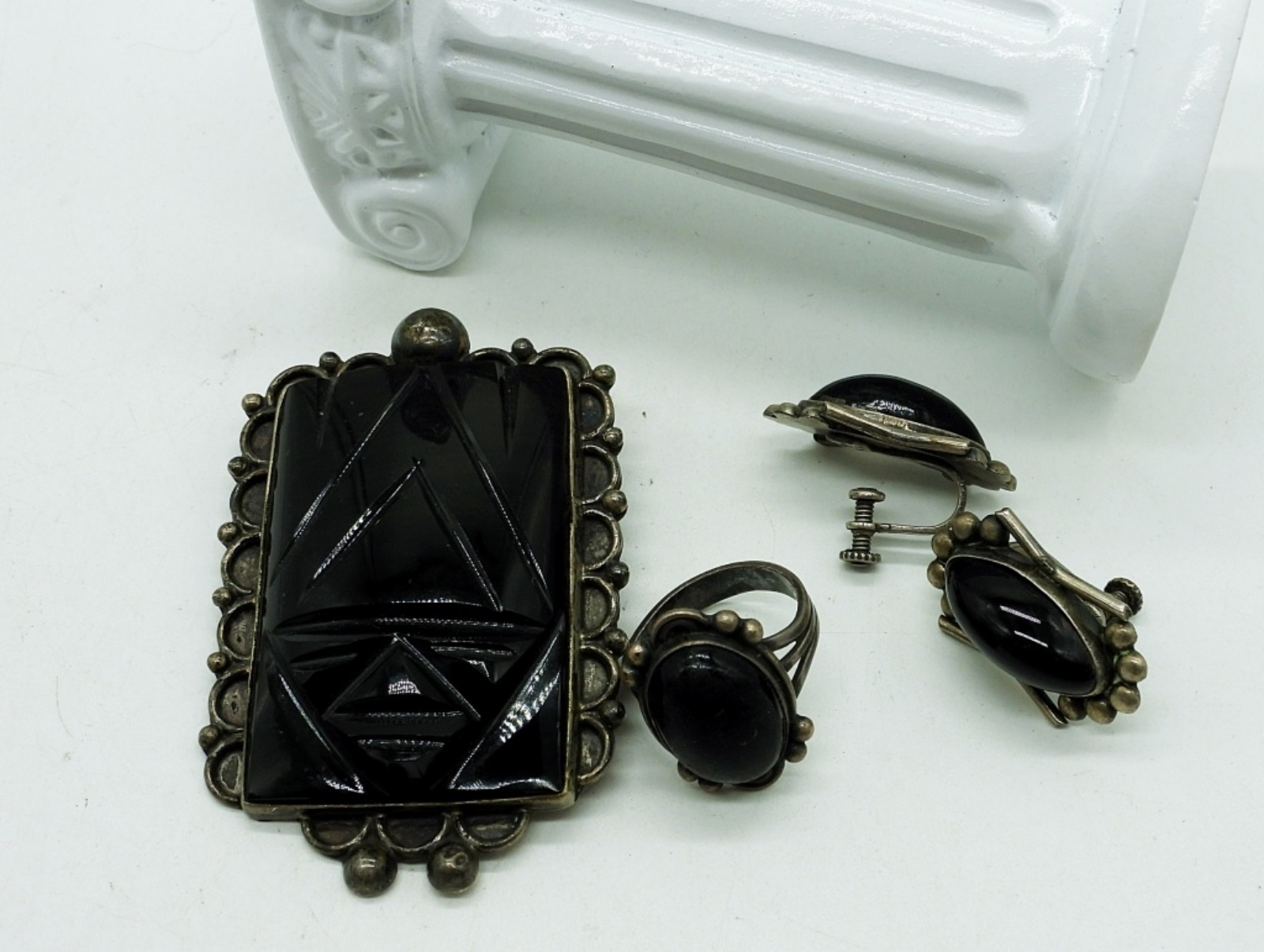 Vintage Sterling Silver Taxco Onyx Broach, 2.5″x 1.5″. Matching Screw Back Earrings and Ring, Size 6. 26.5 DWT