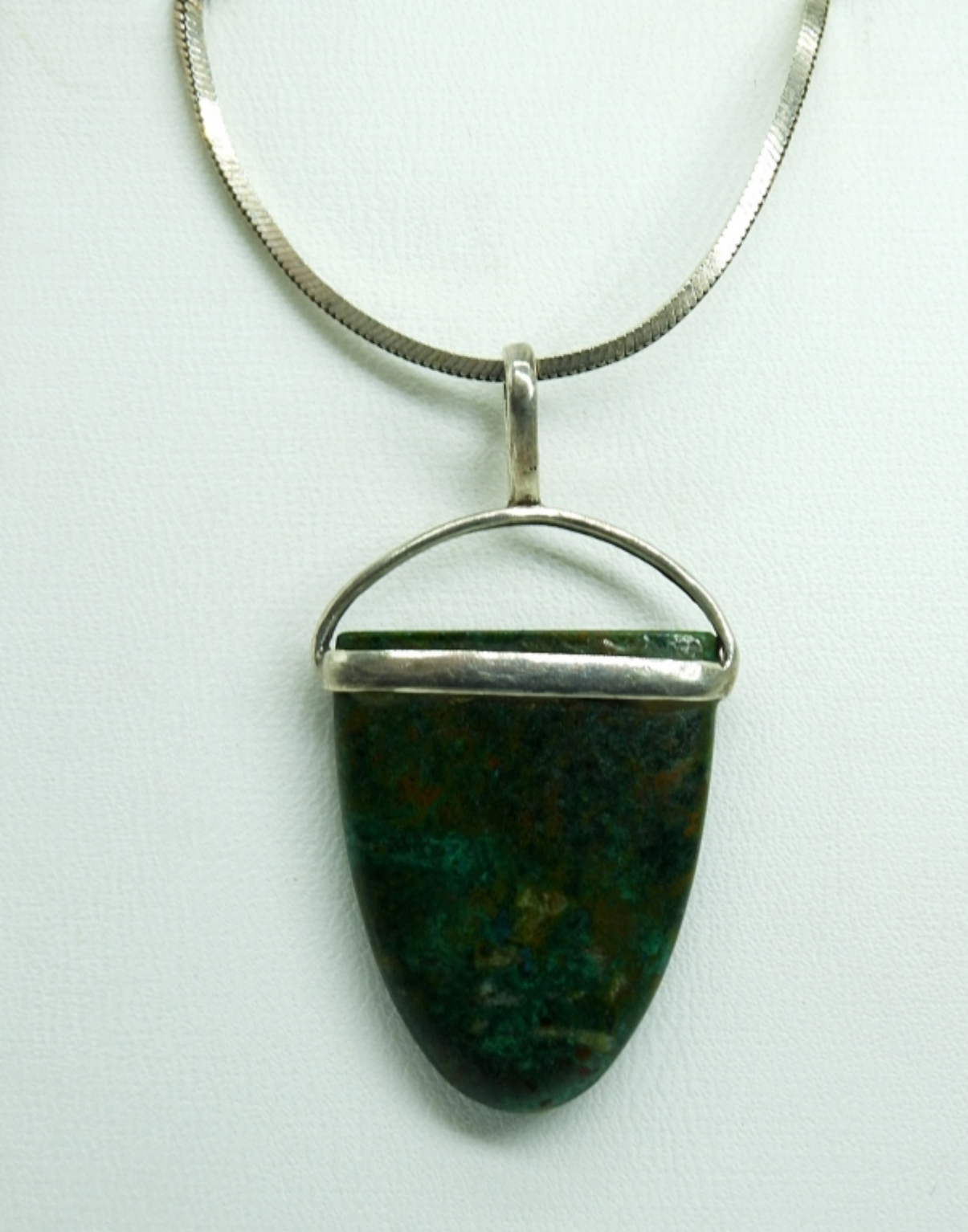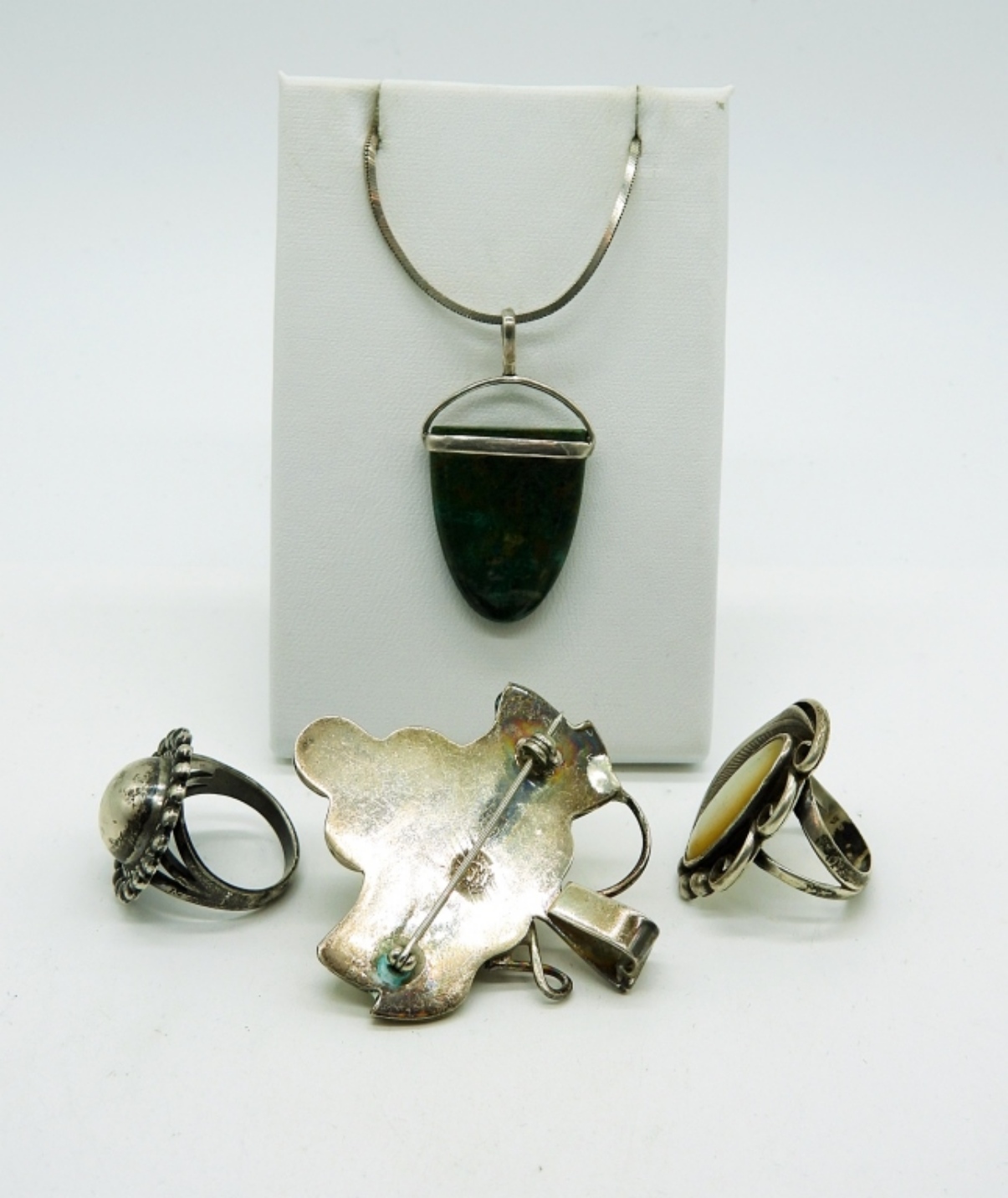 Taxco Sterling Grape Brooch / Pendant, Two Tone, Mexico 925. Two Sterling Rings, Size 7, Domed Design & Southwestern Mother of Pearl. 16 inch Sterling Chain with Green Gemstone. 34.2 DWT