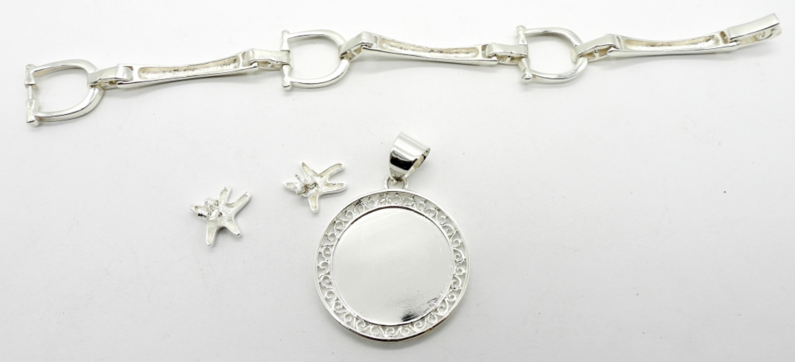 22.9DWT, CIRCLE PENDANT 2IN LONG, STAMPED 925, PAIR OF 925 STARFISH PIERCED EARRINGS, 8IN LONG BRACELET WITH OPEN BOX CLASP STAMPED 925
