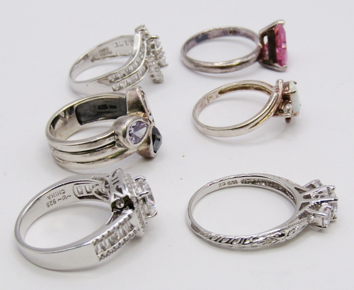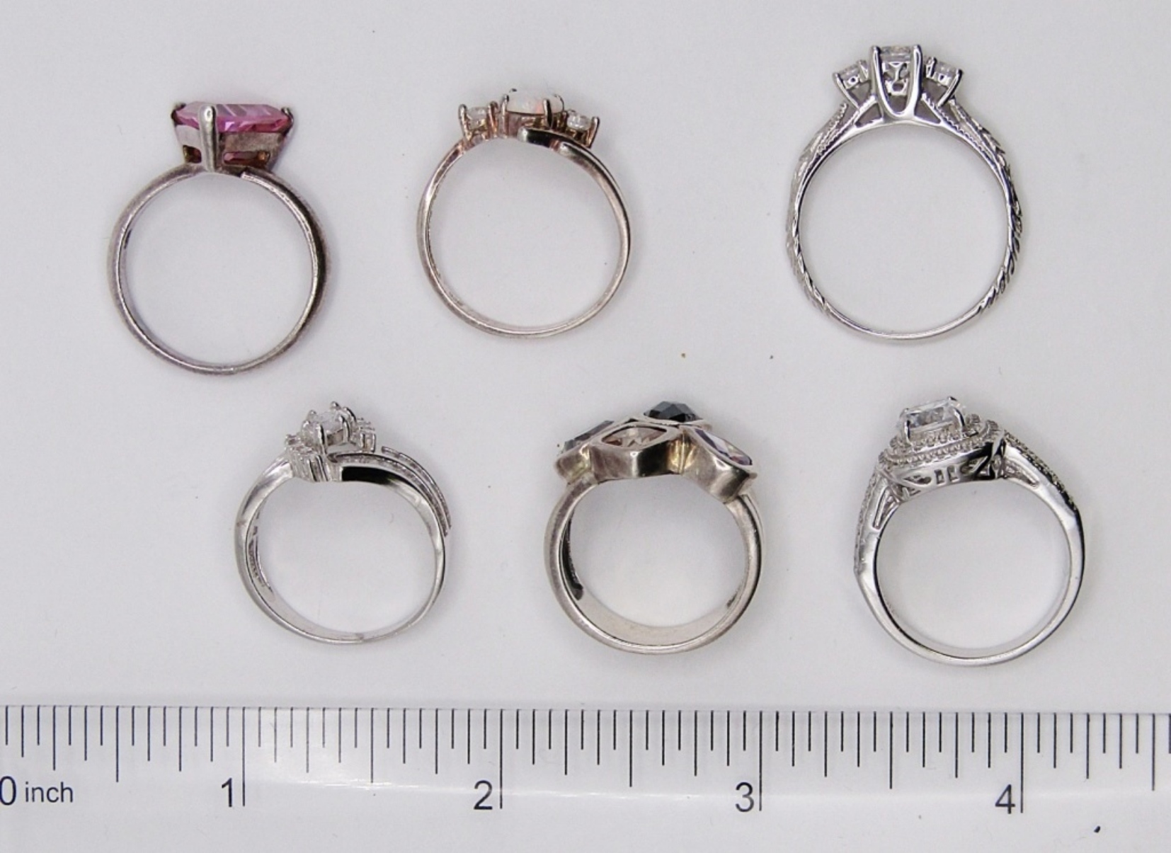 STERLING SILVER SPARKLY BLING FASHION RINGS WITH CLEAR & PINK GEMSTONES, OPALESCENCE, SMOKY QUARTZ STONES; SIZES 5.5-10; STAMPED 925, CHINA (30.3 DWT)