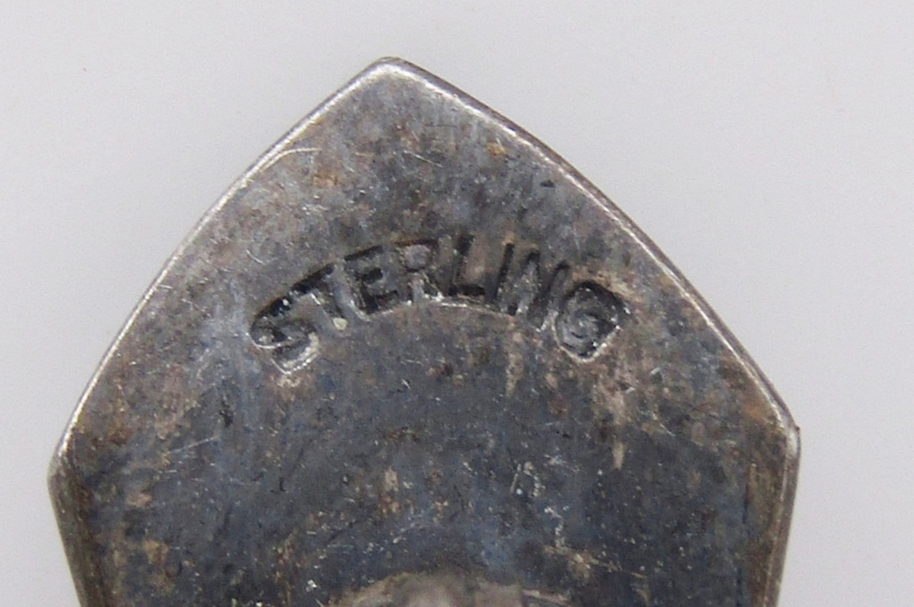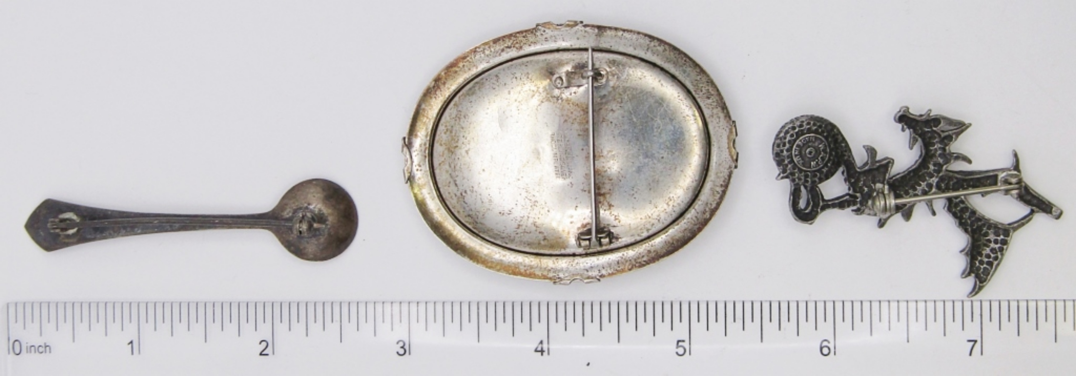 18.5 DWT. RHODIUM PLATED STERLING BEZEL, PEWTER DRAGON WITH GEM, & VINTAGE STERLING SPOON