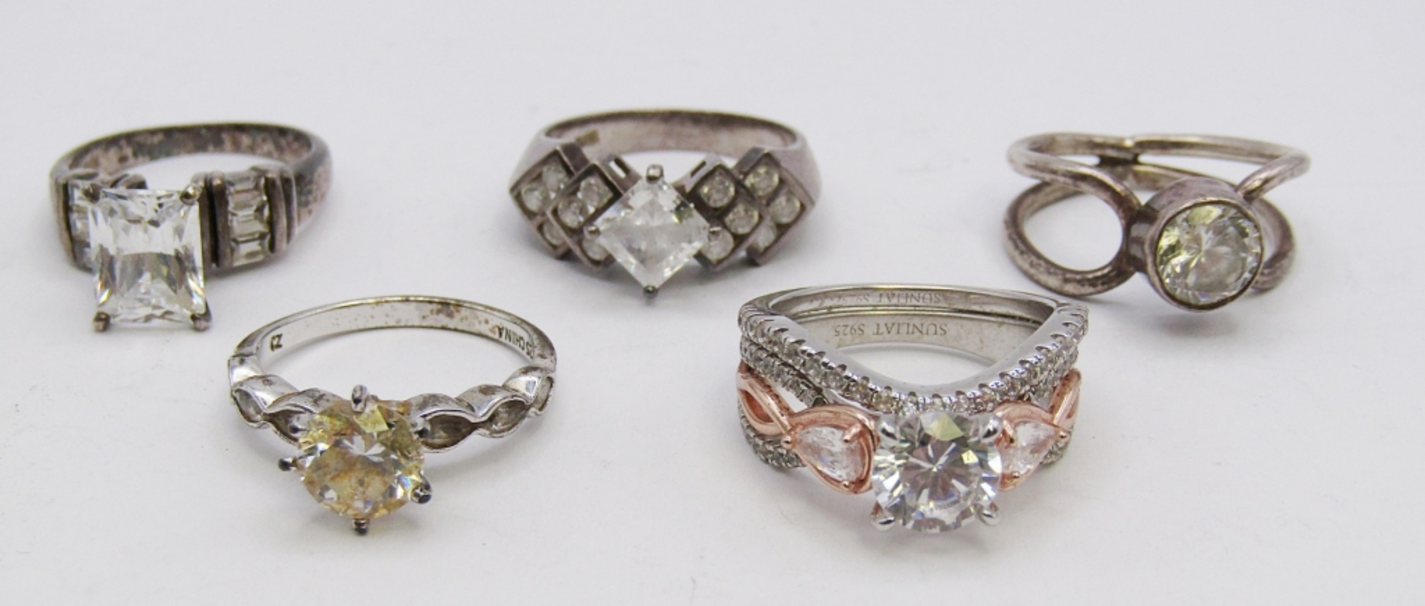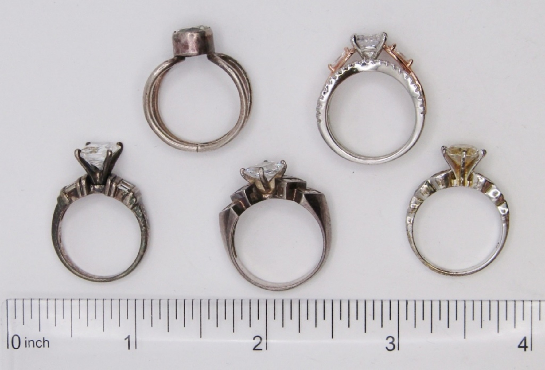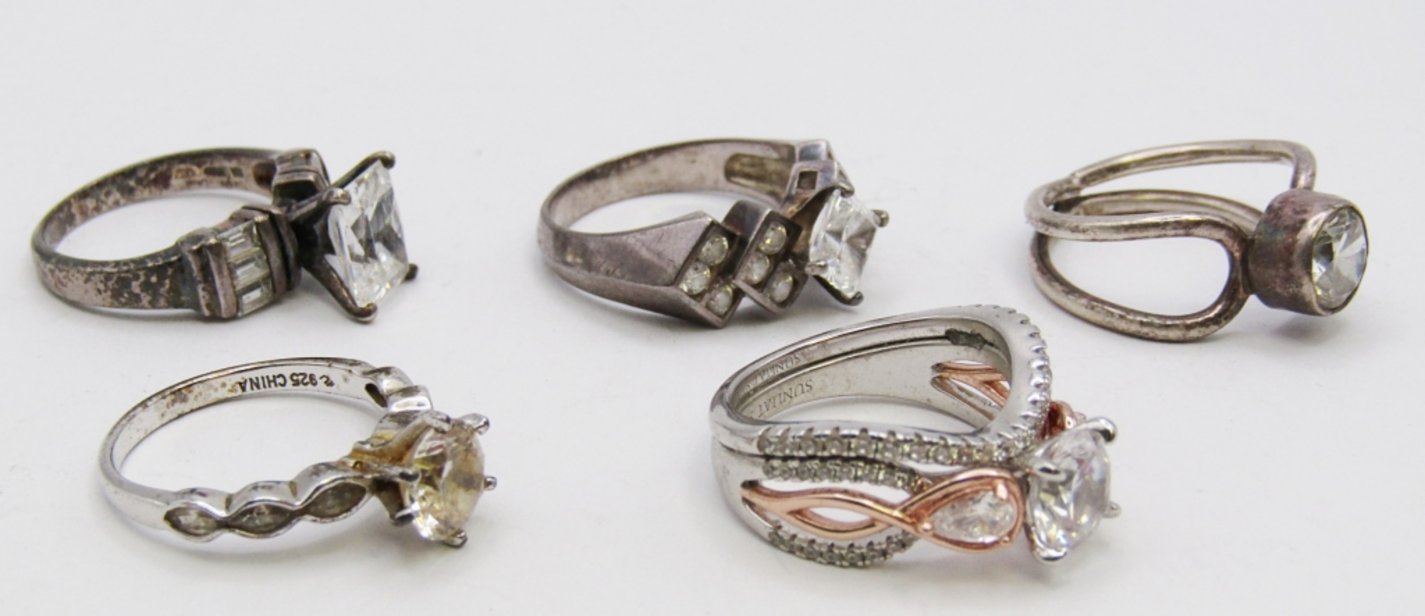 13 DWT. (4) CUBIC ZIRCONIA. (1) MEXICO. ALL STAMPED.SIZES: 6, 6, 6.5, 7, 6. SUNLIAT CUBIC ZIRCONIA ROSE GOLD PLATED SET IS SAUTERED TOGETHER.