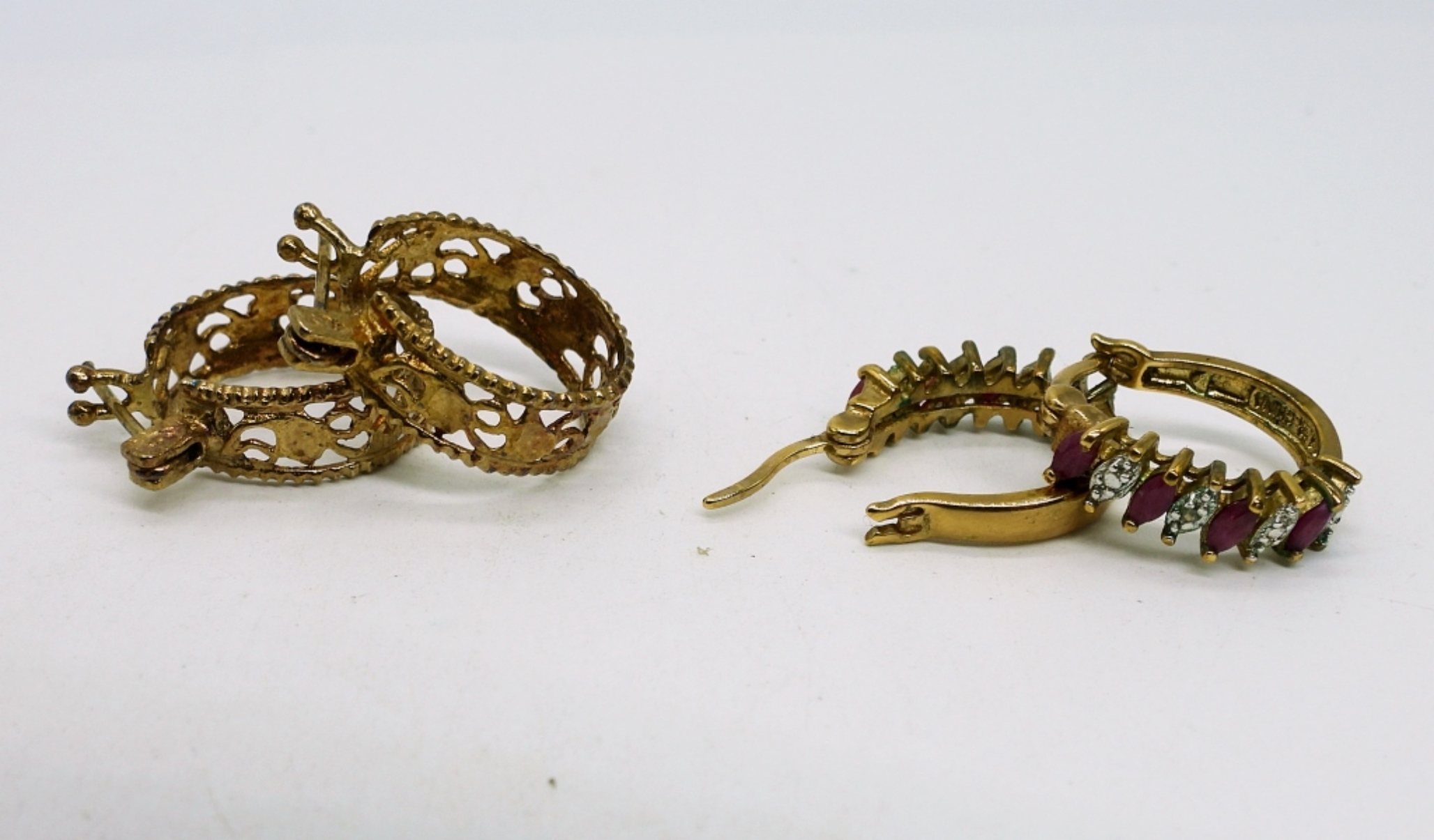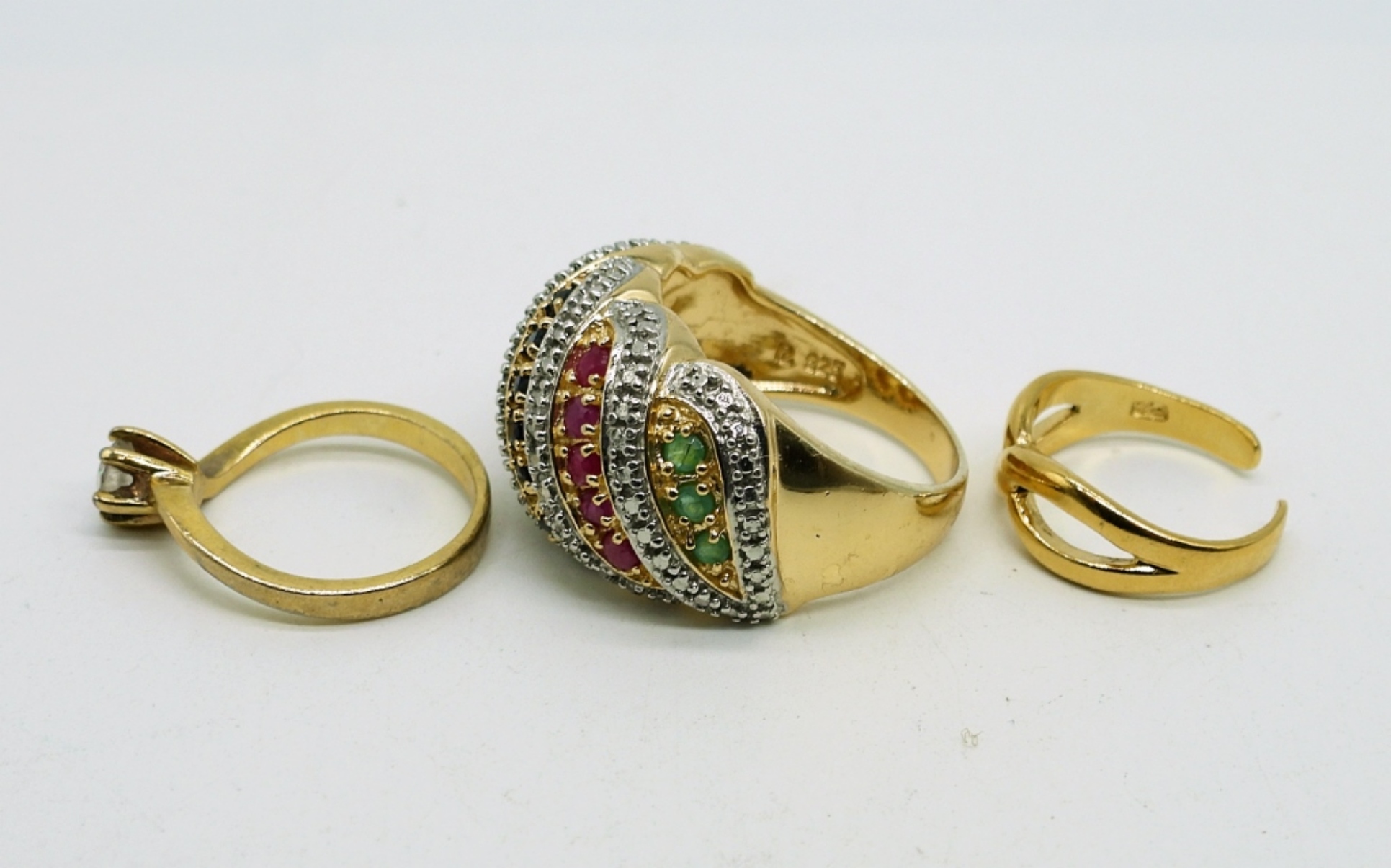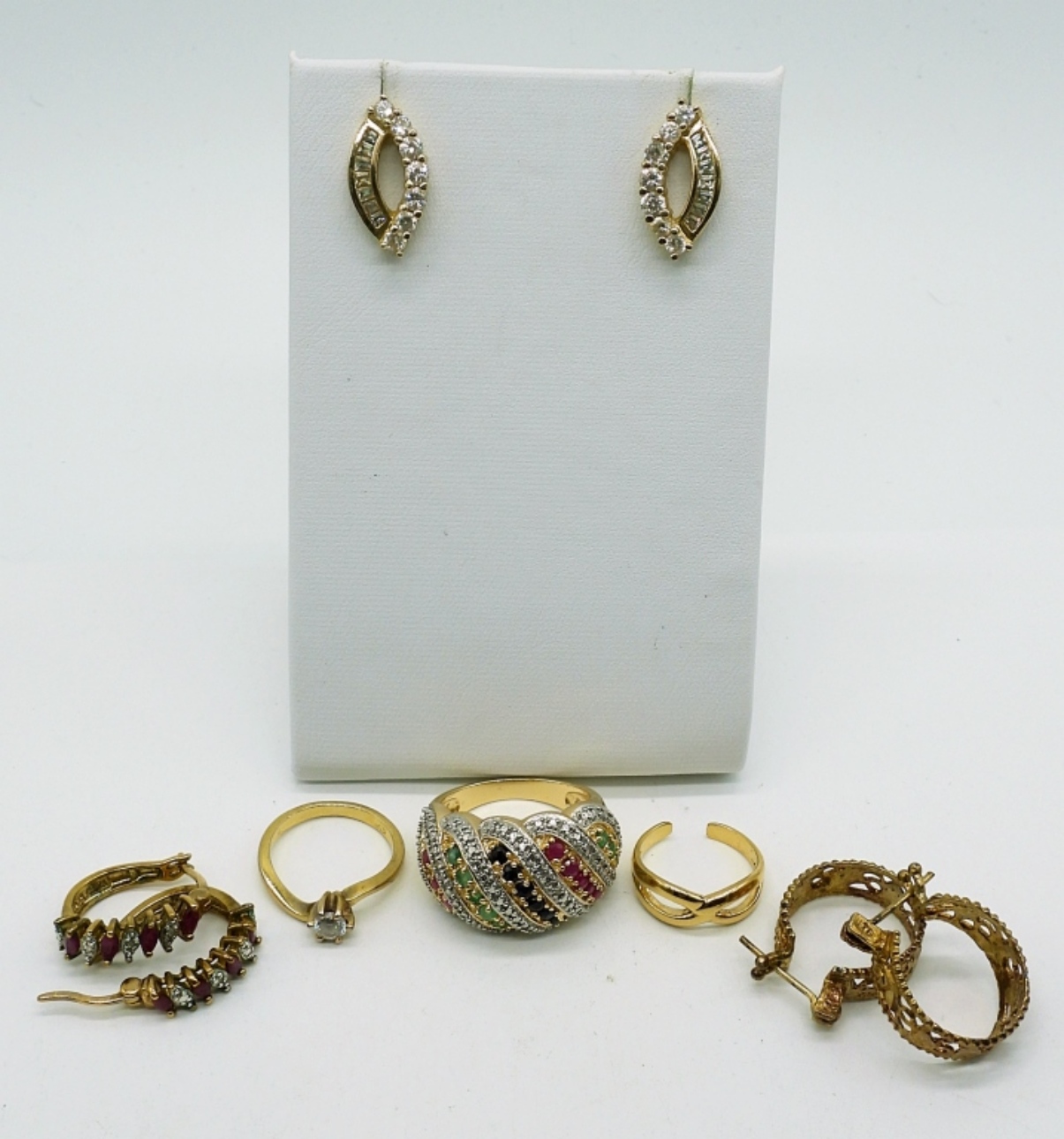 Everything is Gold Tone Sterling Silver. Ring with Ruby, Emerald & Sapphire Gemstones, Size 8. Gold Tone Ring with clear gemstone, Size 4. Tiny size 3 gold tone ring. Three pair of gold tone earrings with gemstones. 15.6 DWT