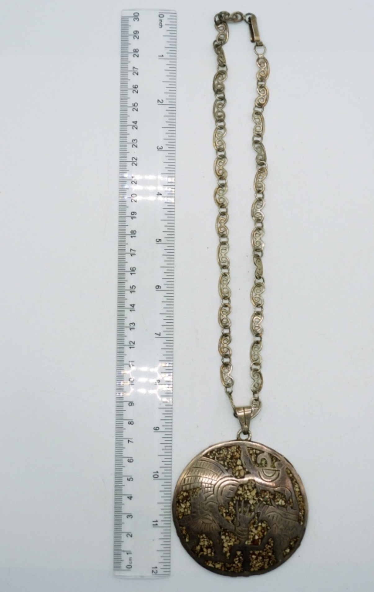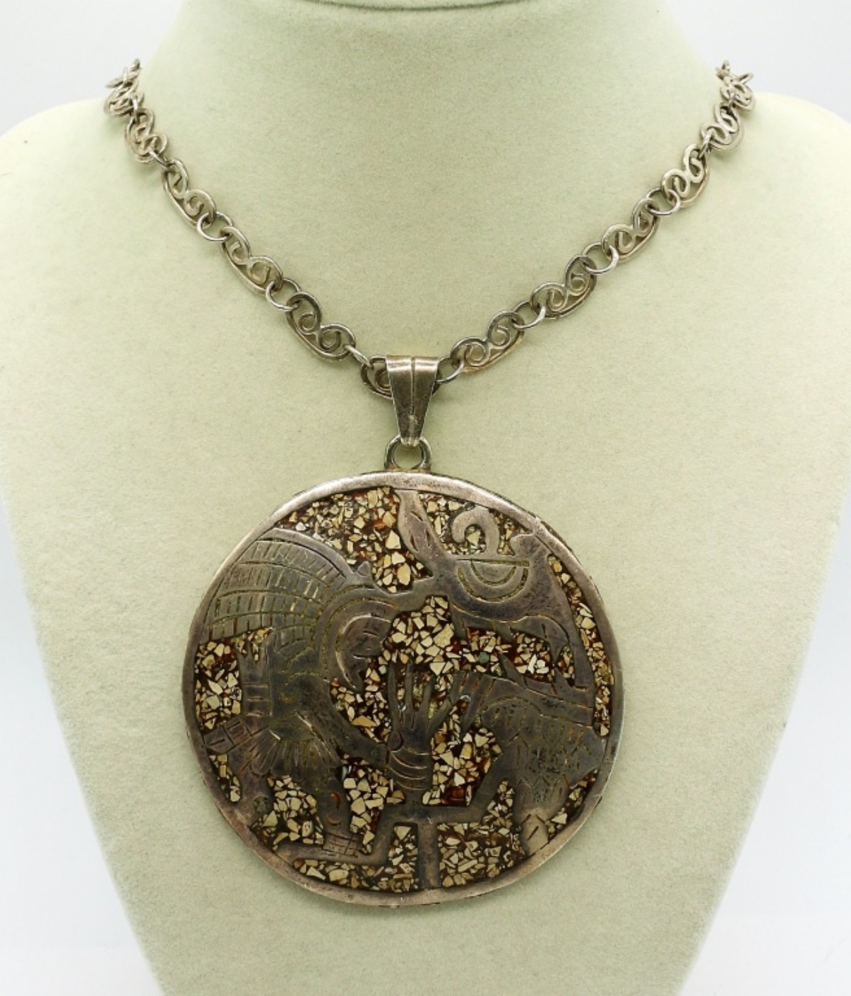 Vintage “Made in Mexico” Sterling Silver Inlaid Pendant with a very decorative chain! 18″ chain, 3″ Round Pendant. 50 DWT