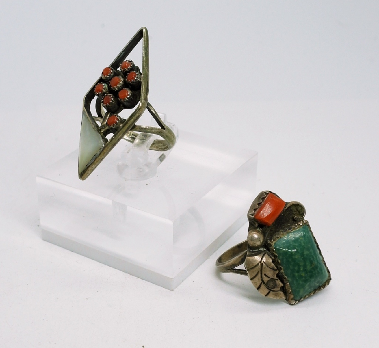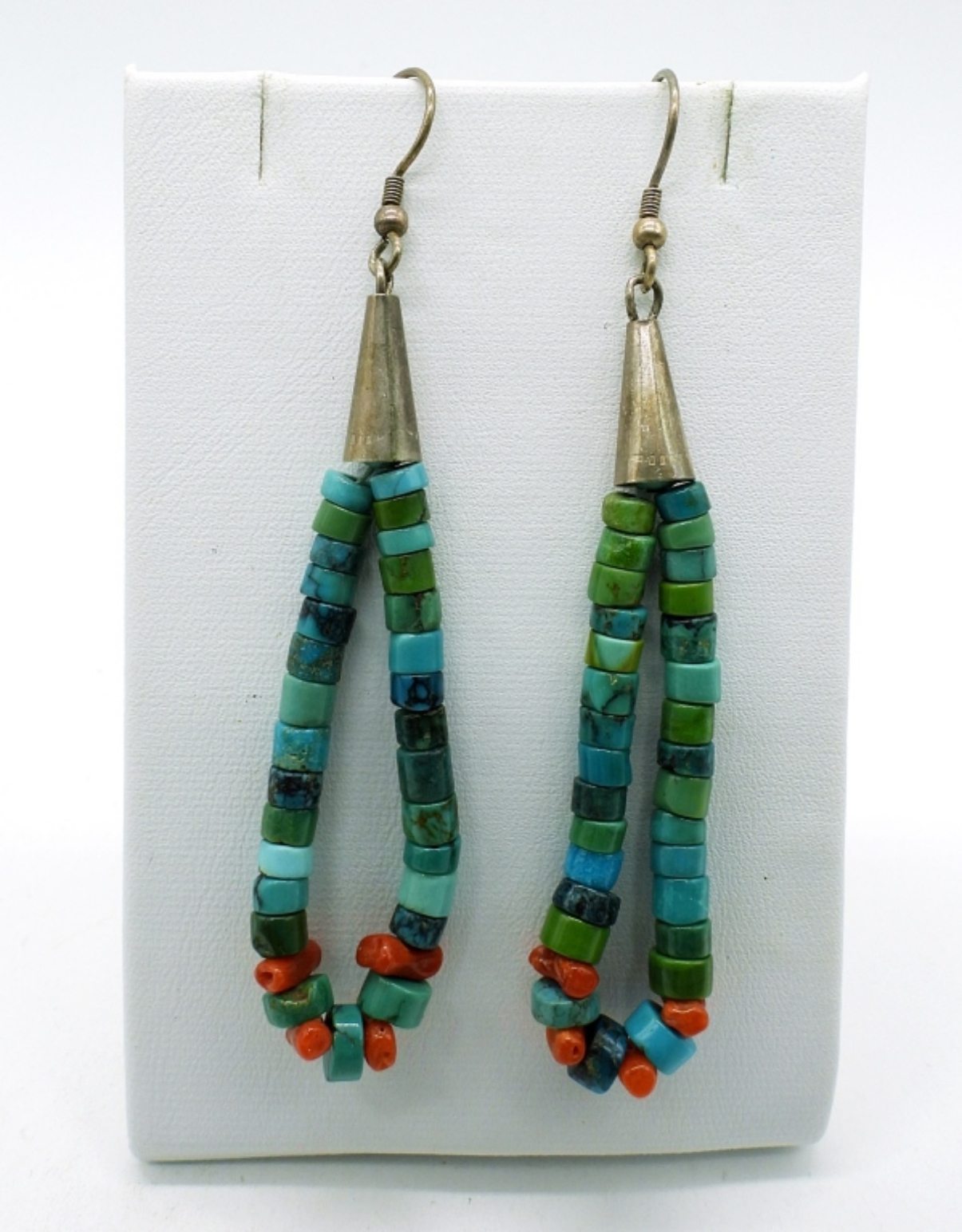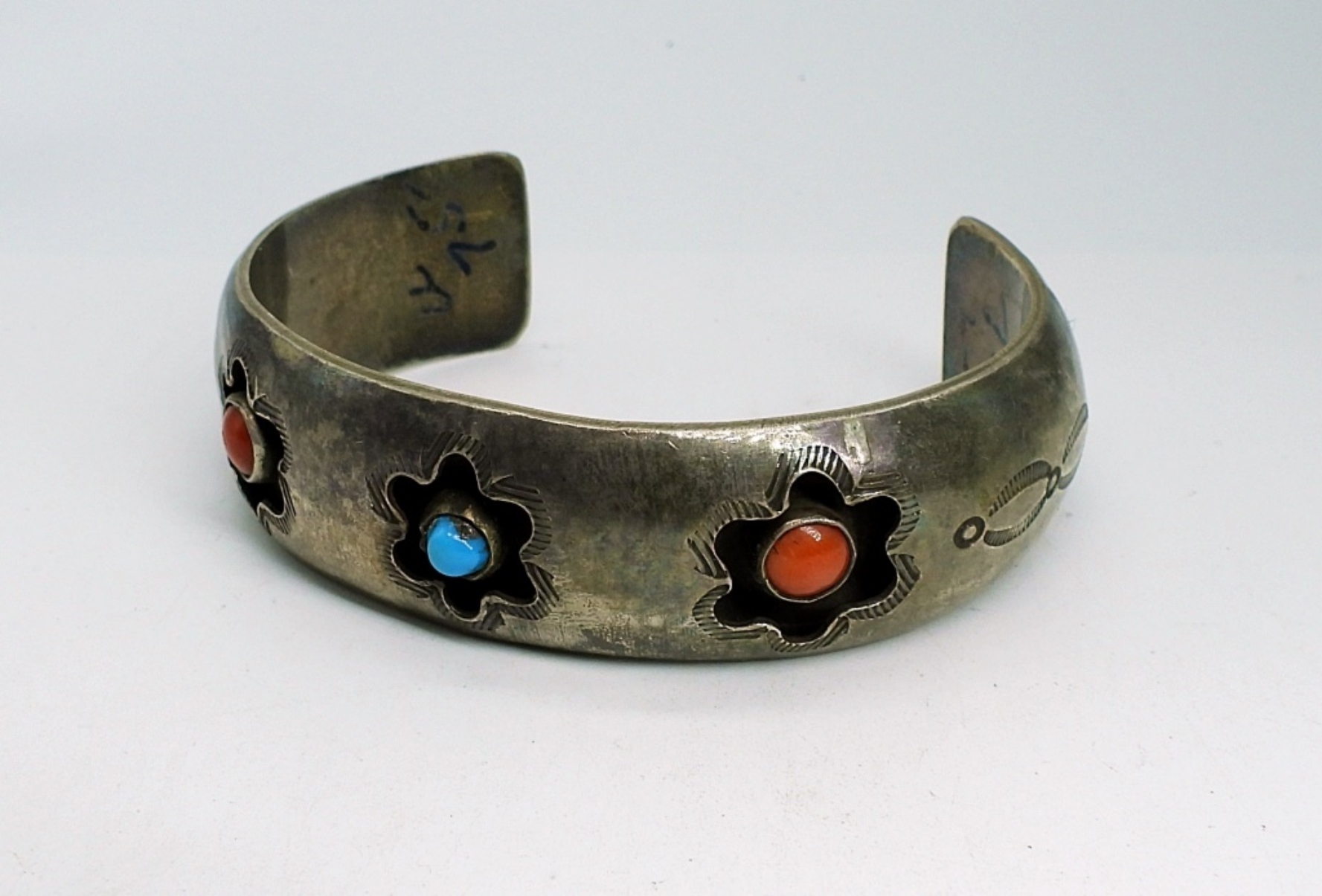 Sterling Silver Zuni Ring (Stamped: Zuni W&V Sanchez) size 5. Pretty red turquoise shaped into flower with Mother of Pearl inlay. Red and Blue Turquoise Cuff Bracelet, 5″. Beaded Turquoise Earrings and Turquoise Ring Size 5.5. 29 DWT