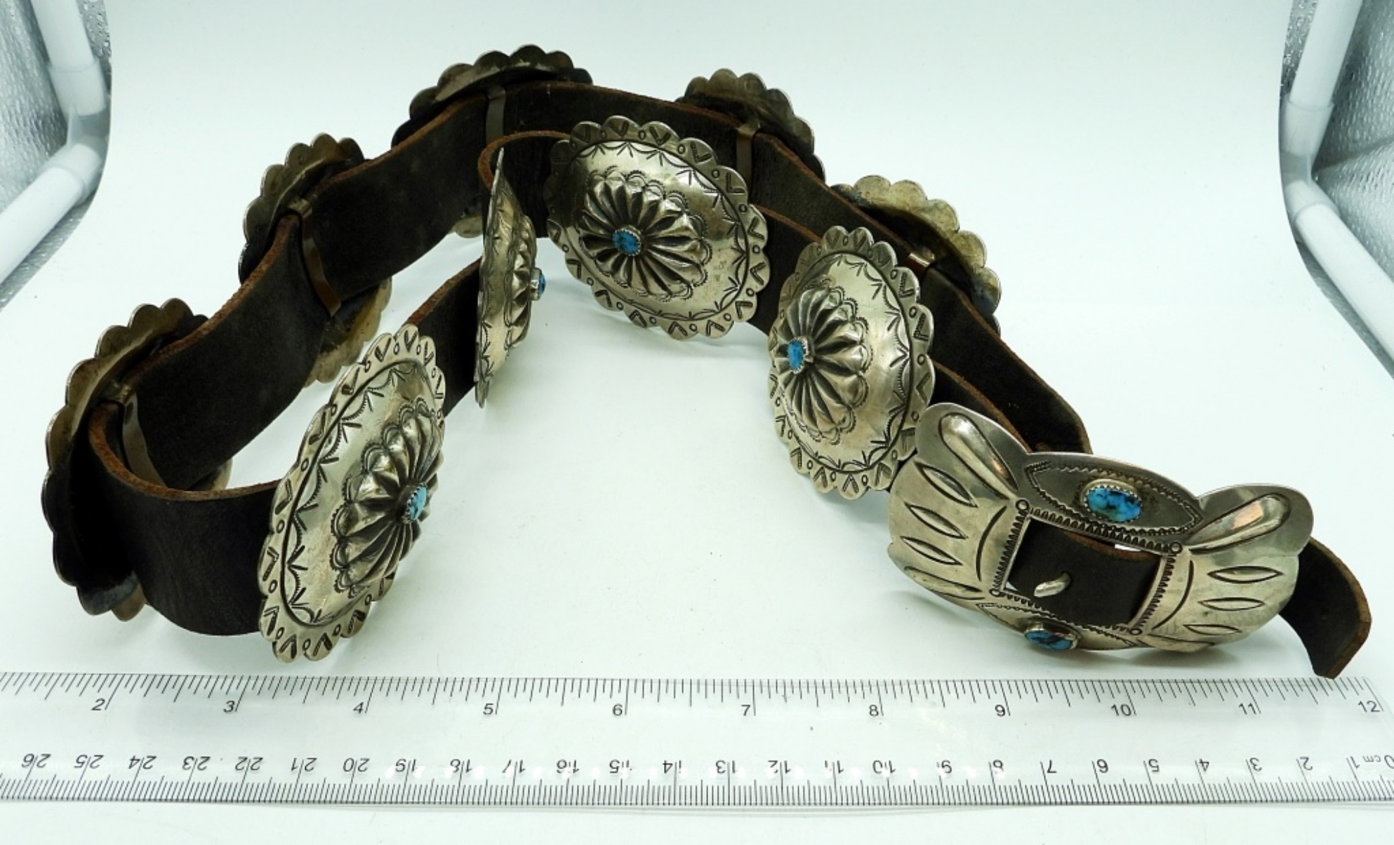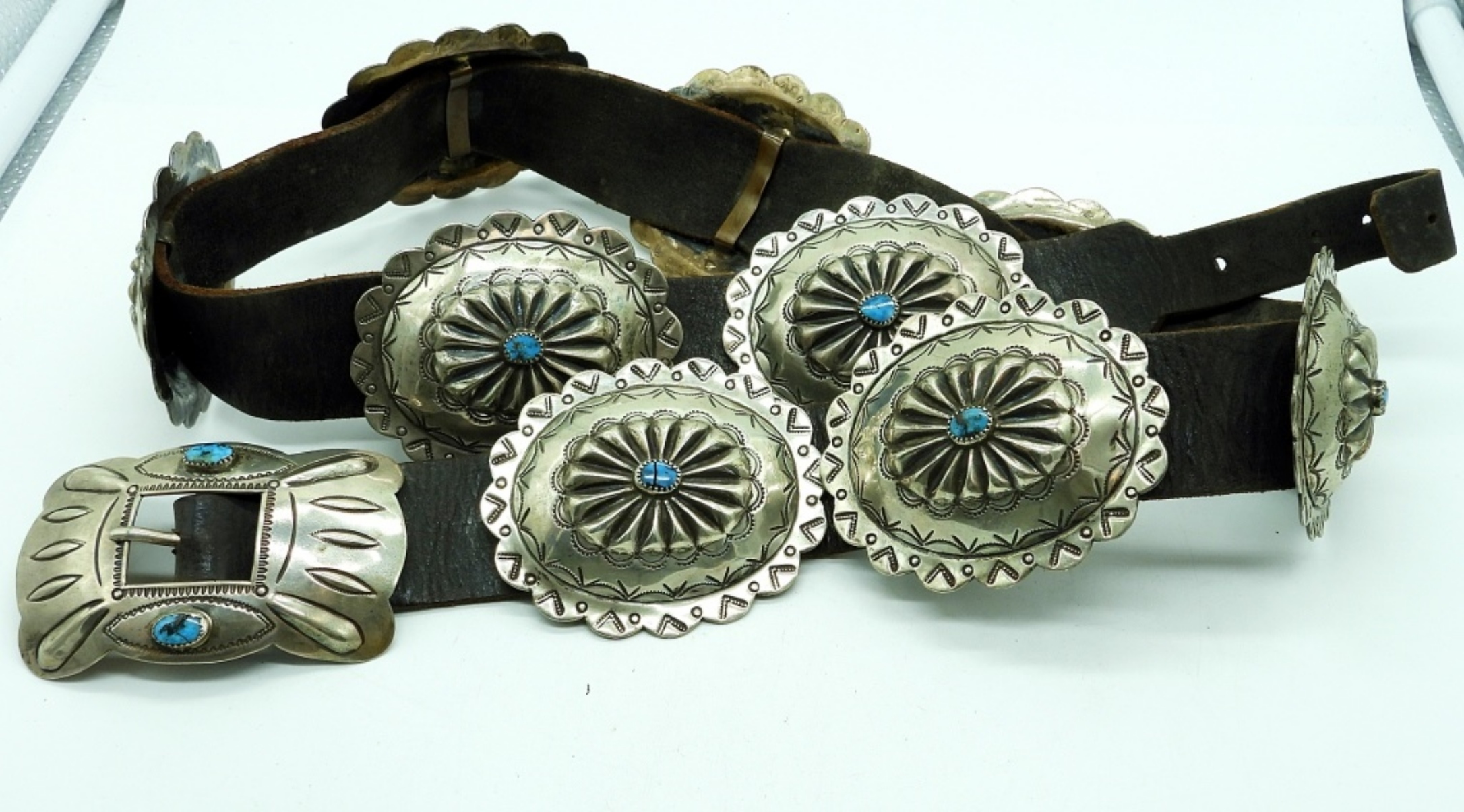 Handmade Leather Belt with large Sterling Silver/Turquoise Décor. Belt measures 37″. Each Silver piece is 3″x 2.5″ with a small turquoise gem in the center. This Belt is in good condition, but obviously used. It is very heavy!
