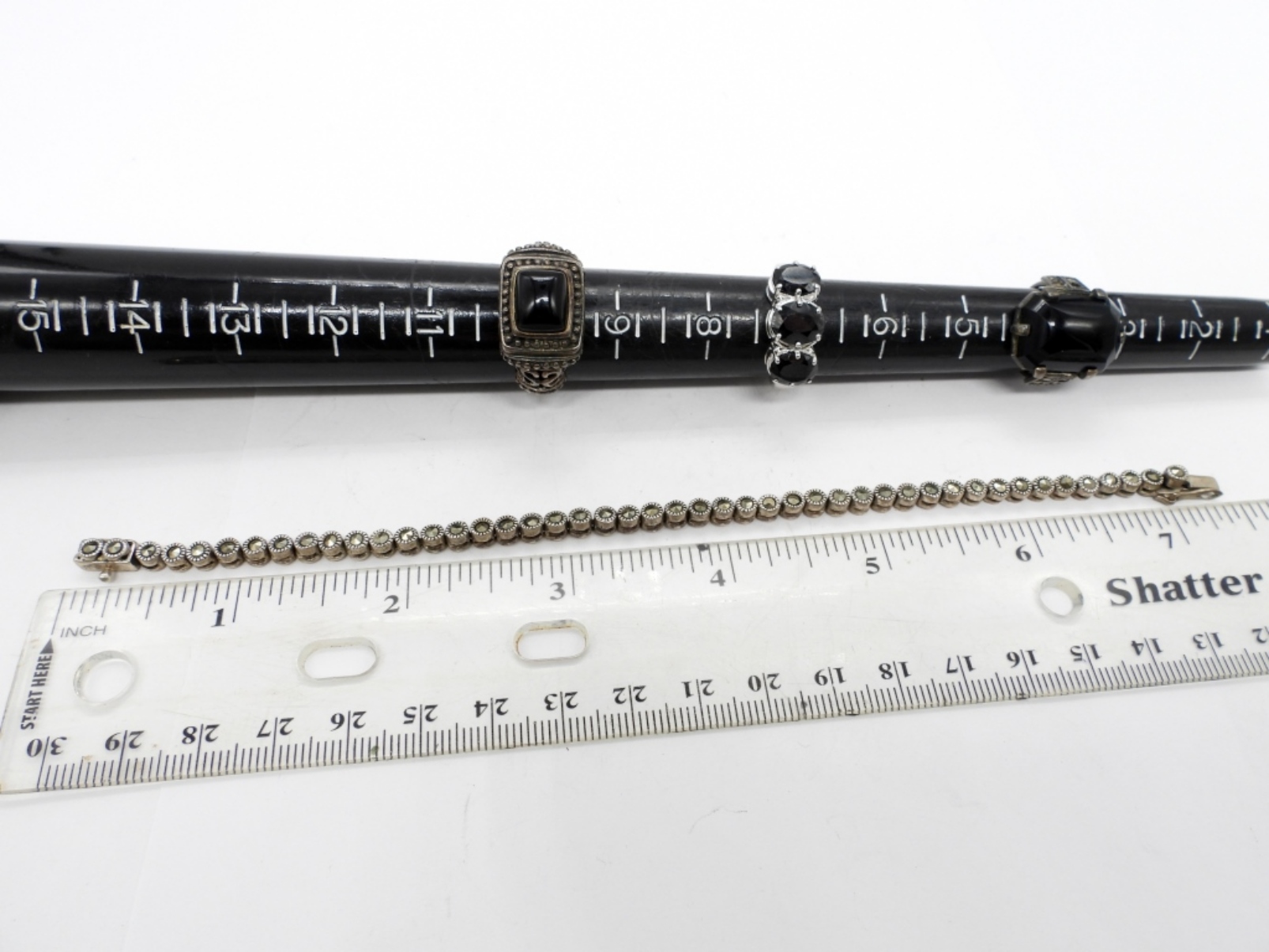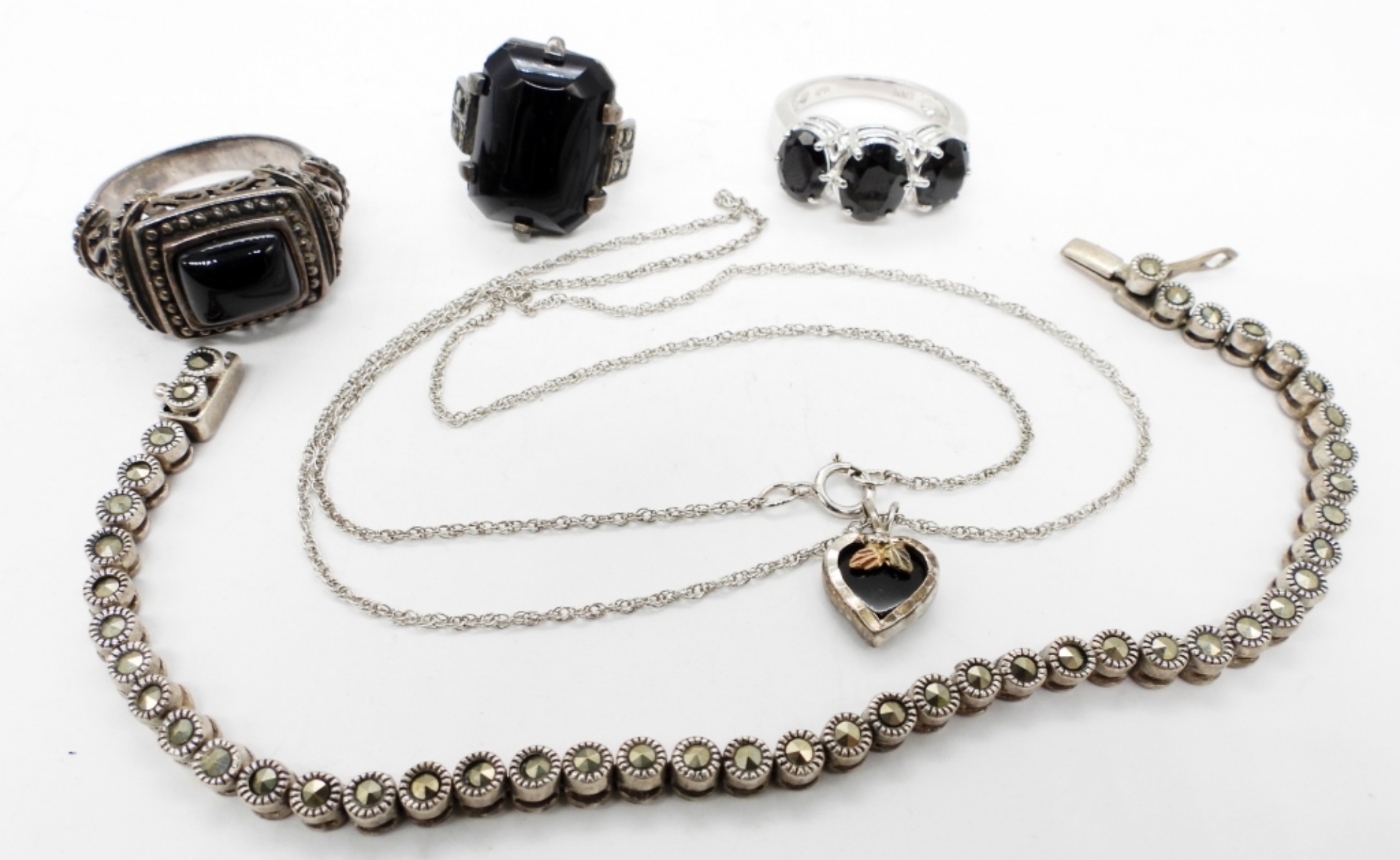 21 DWT. ALL STAMPED. 7″ BRACELET, 18″ NECKLACE, (3) RINGS SIZES: 4.5, 7.25, 10