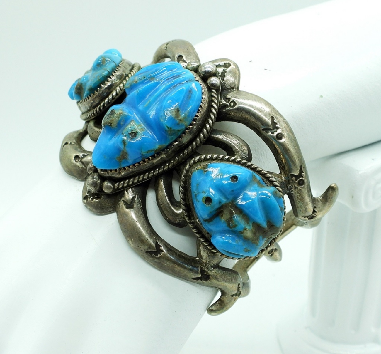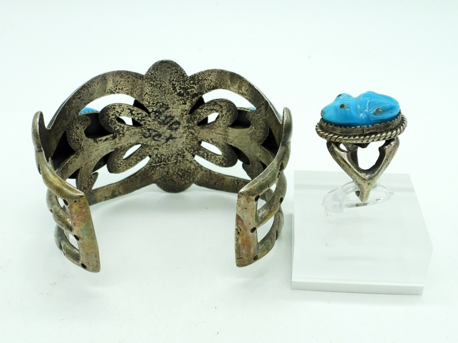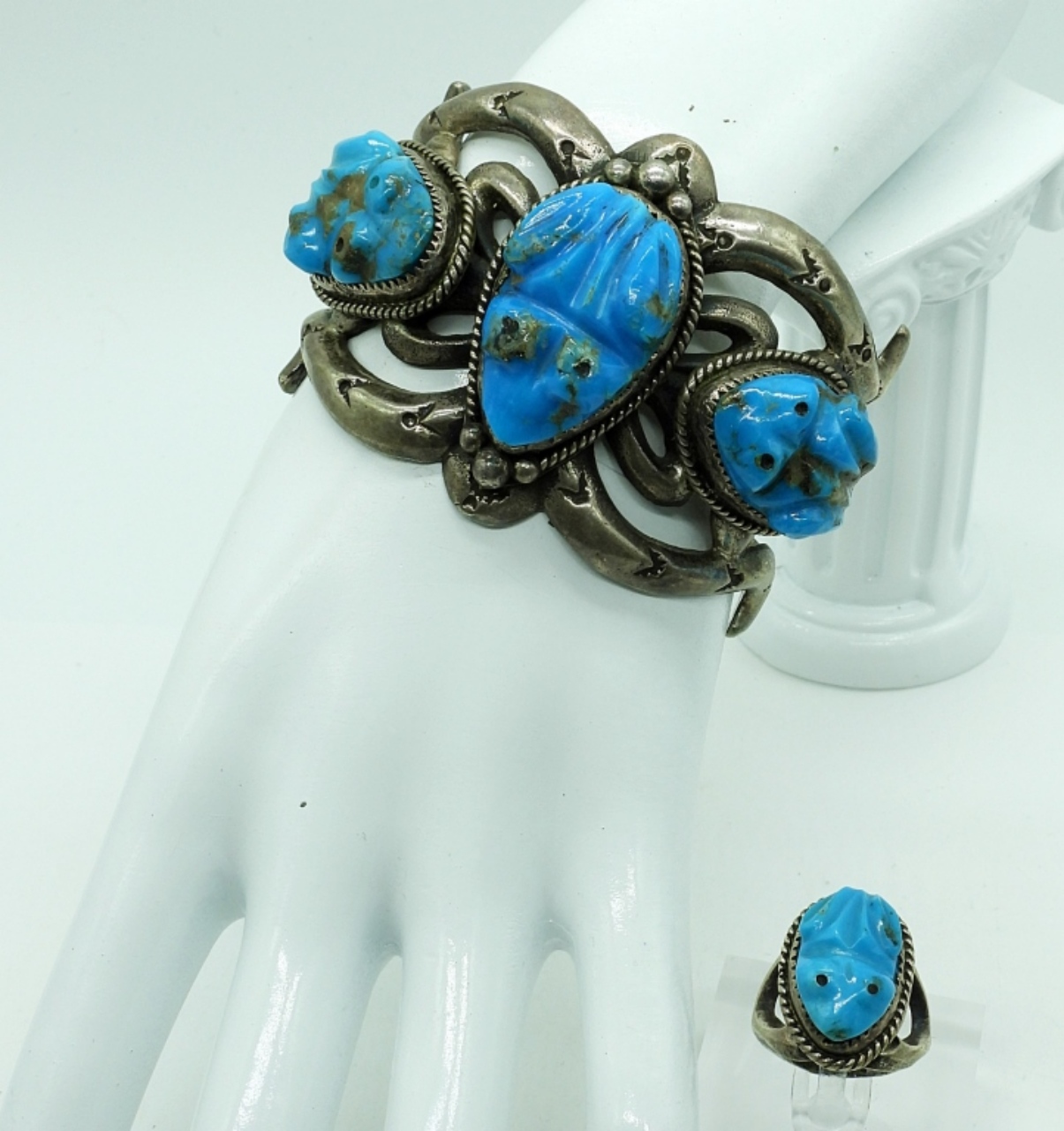 Vintage Sterling Silver & Turquoise Carved Figural Frogs Cuff Bracelet (5.5″)& Matching Ring. Size 6 3/4 83 DWT
