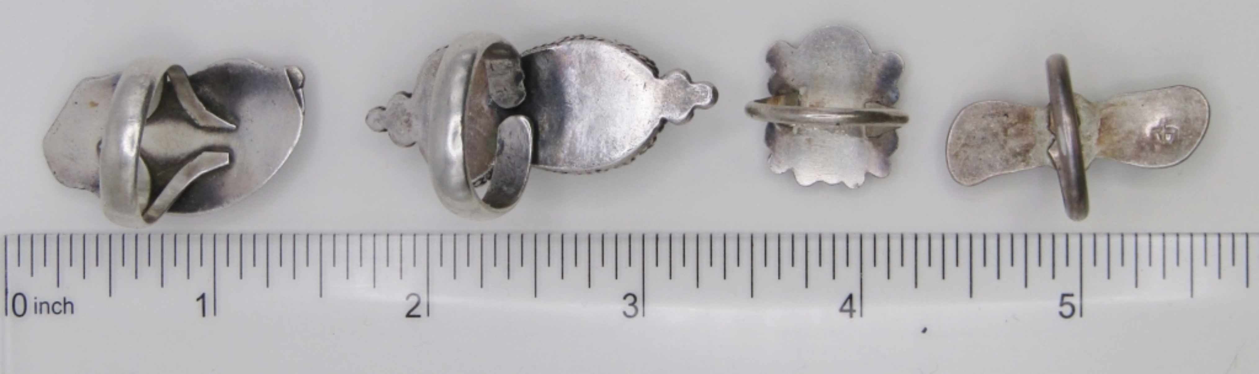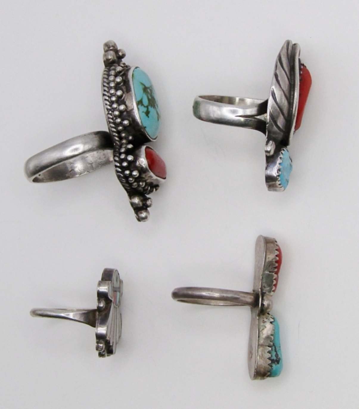 18.6 DWT. FEATURING TURQUOISE, CORAL, & MOTHER OF PEARL COLORED STONES & INLAYS. (1) STAMPED 925. SIZES: 8, 7, 5, 5.5