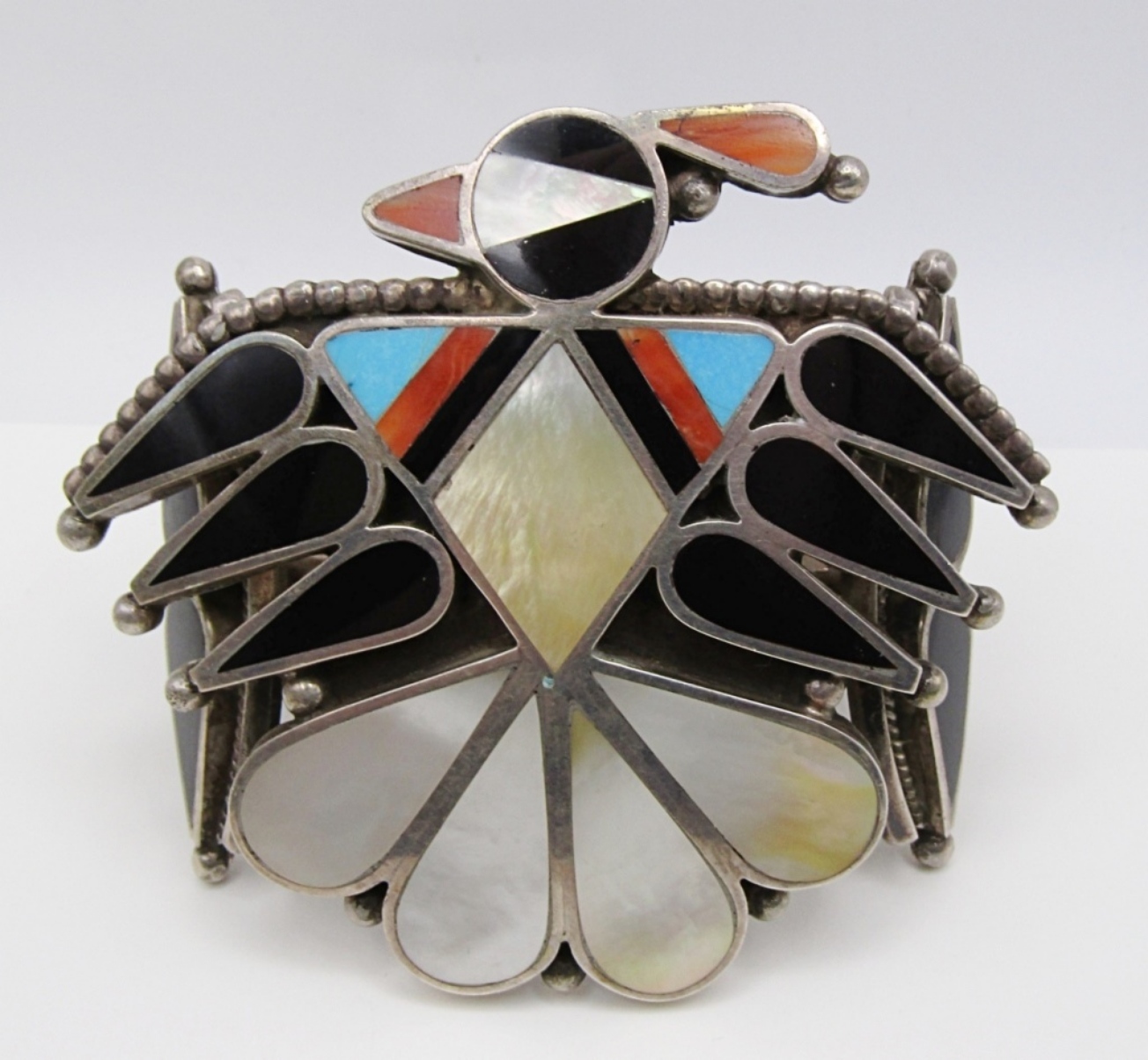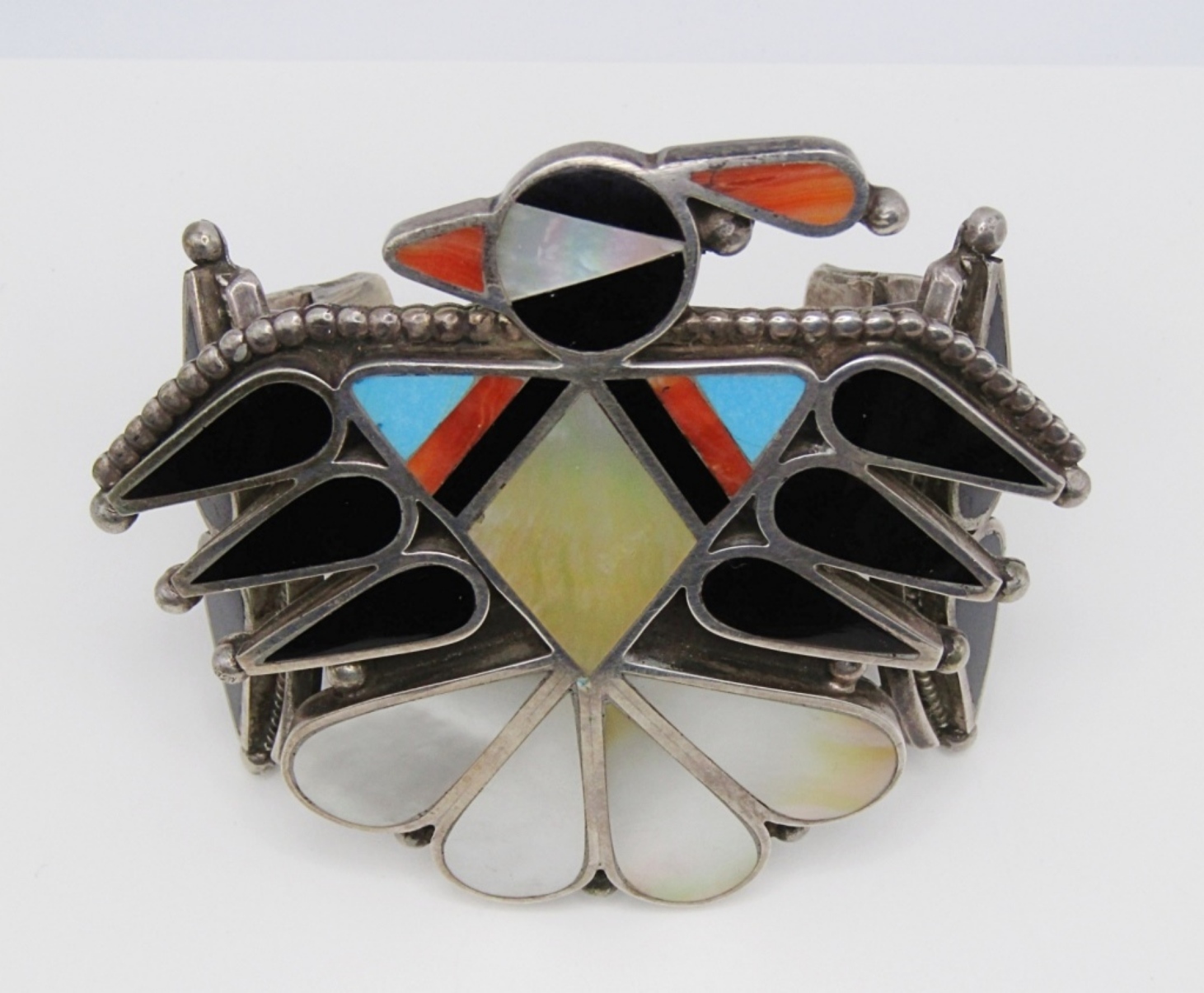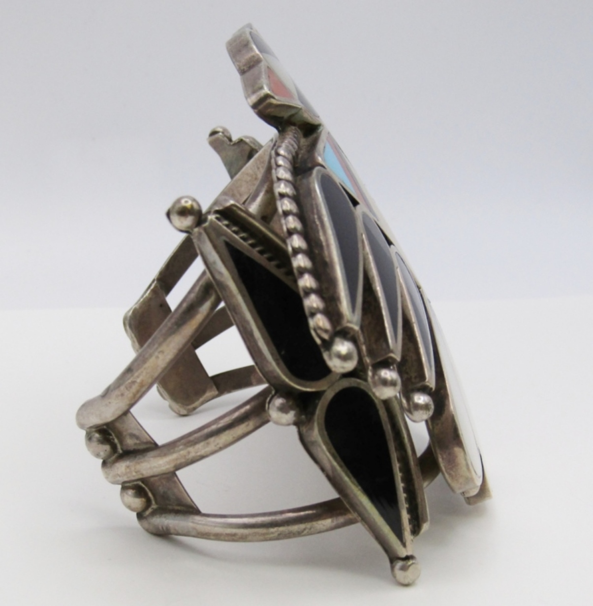 90.9 DWT. 2.5″ CUFF WITH MOTHER OF PEARL, ONYX, TURQUOISE, & CORAL INLAY.