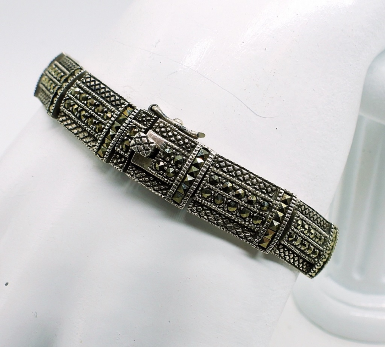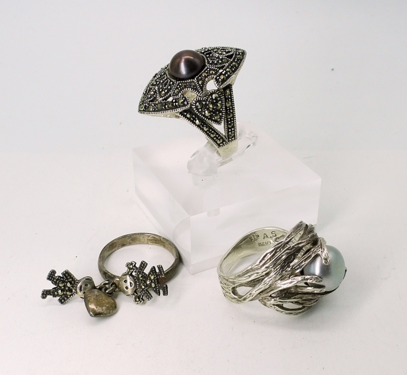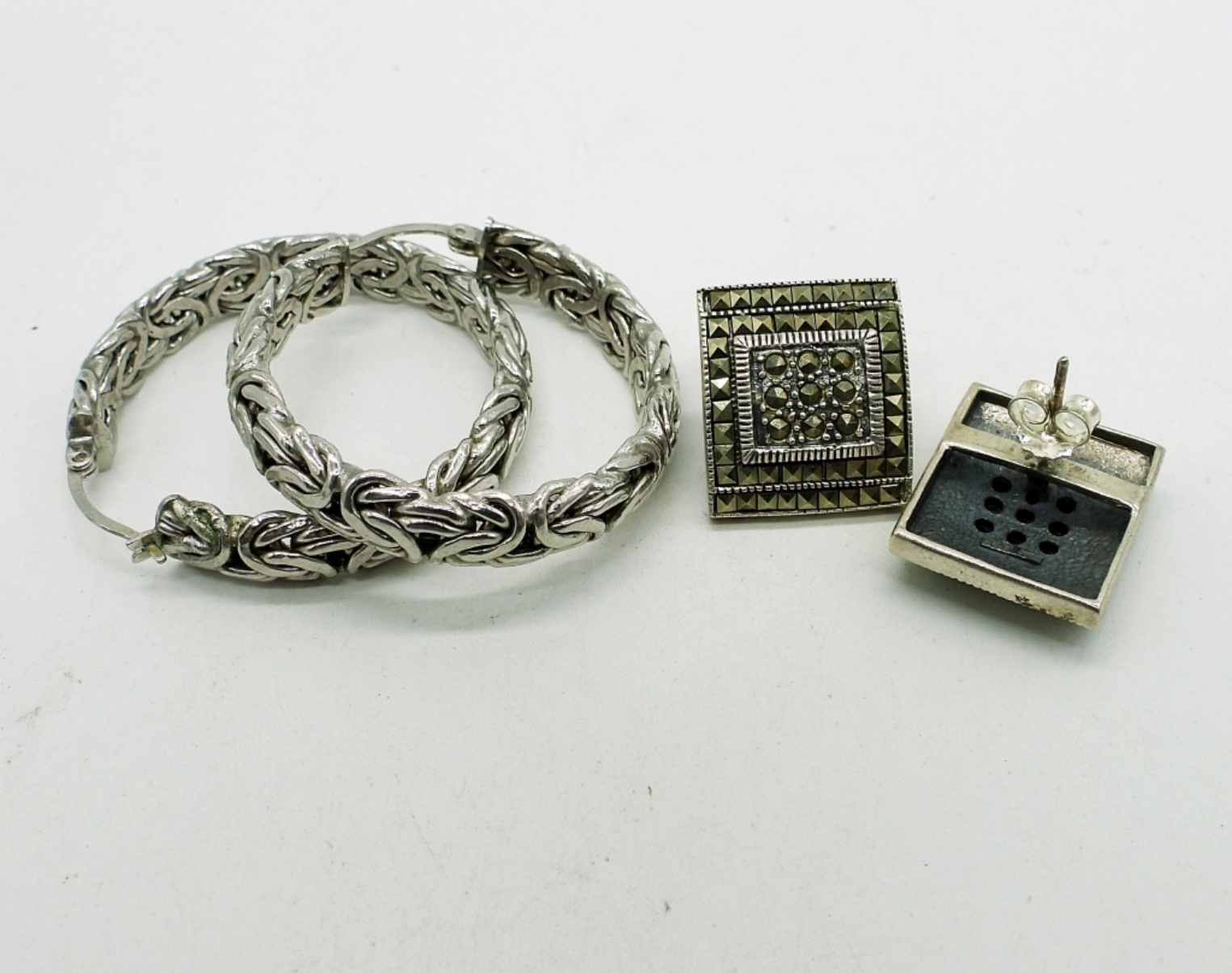 Sterling Silver 7″ Marcasite Bracelet with matching post earrings. Three Sterling Rings, Sizes 9 & 6.5, Sterling hoop earrings. 42.1 DWT