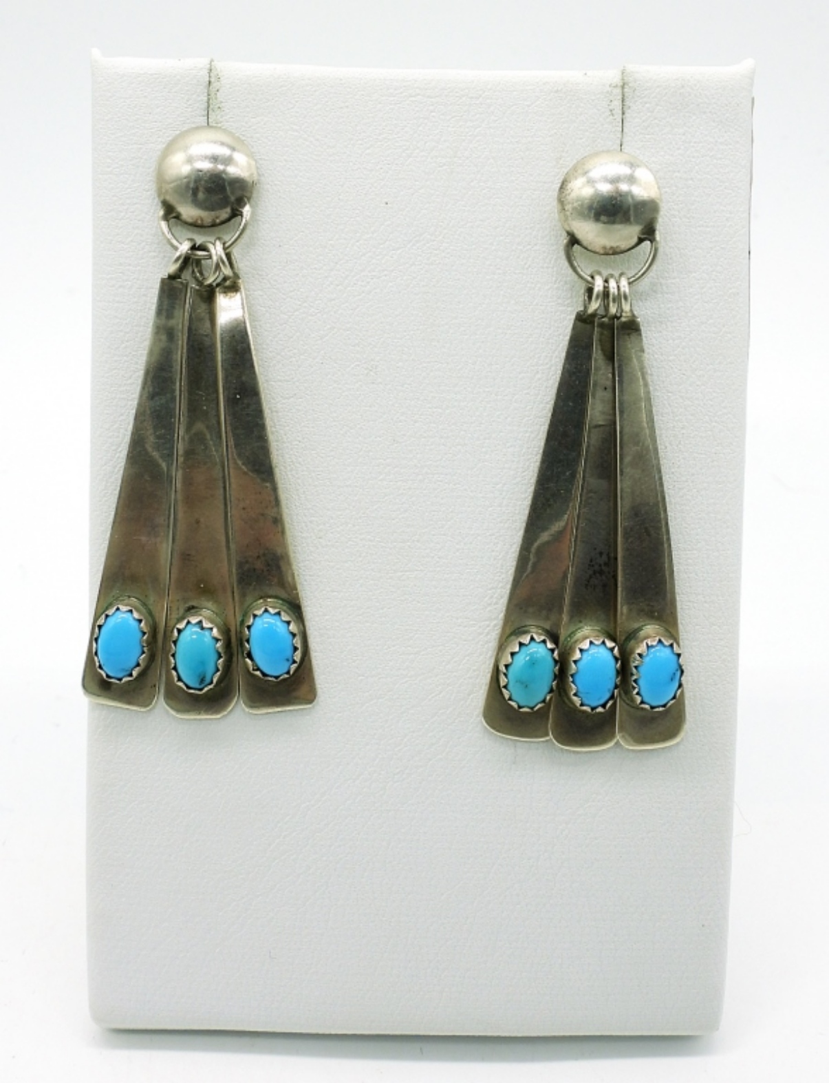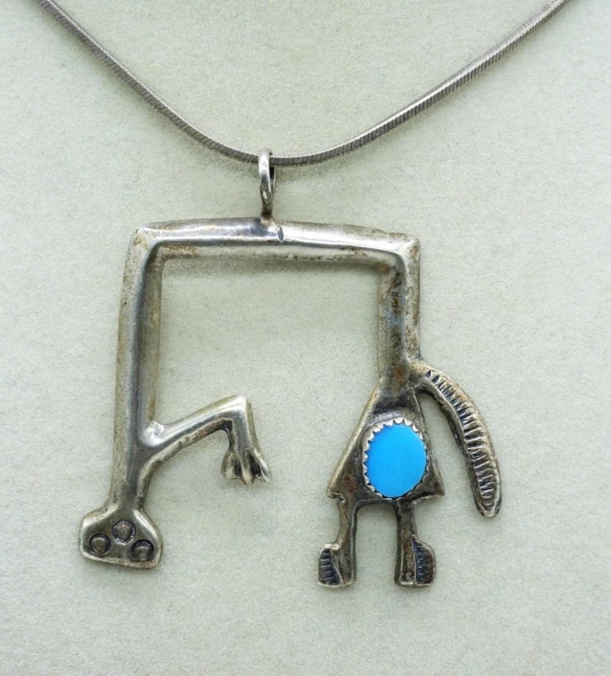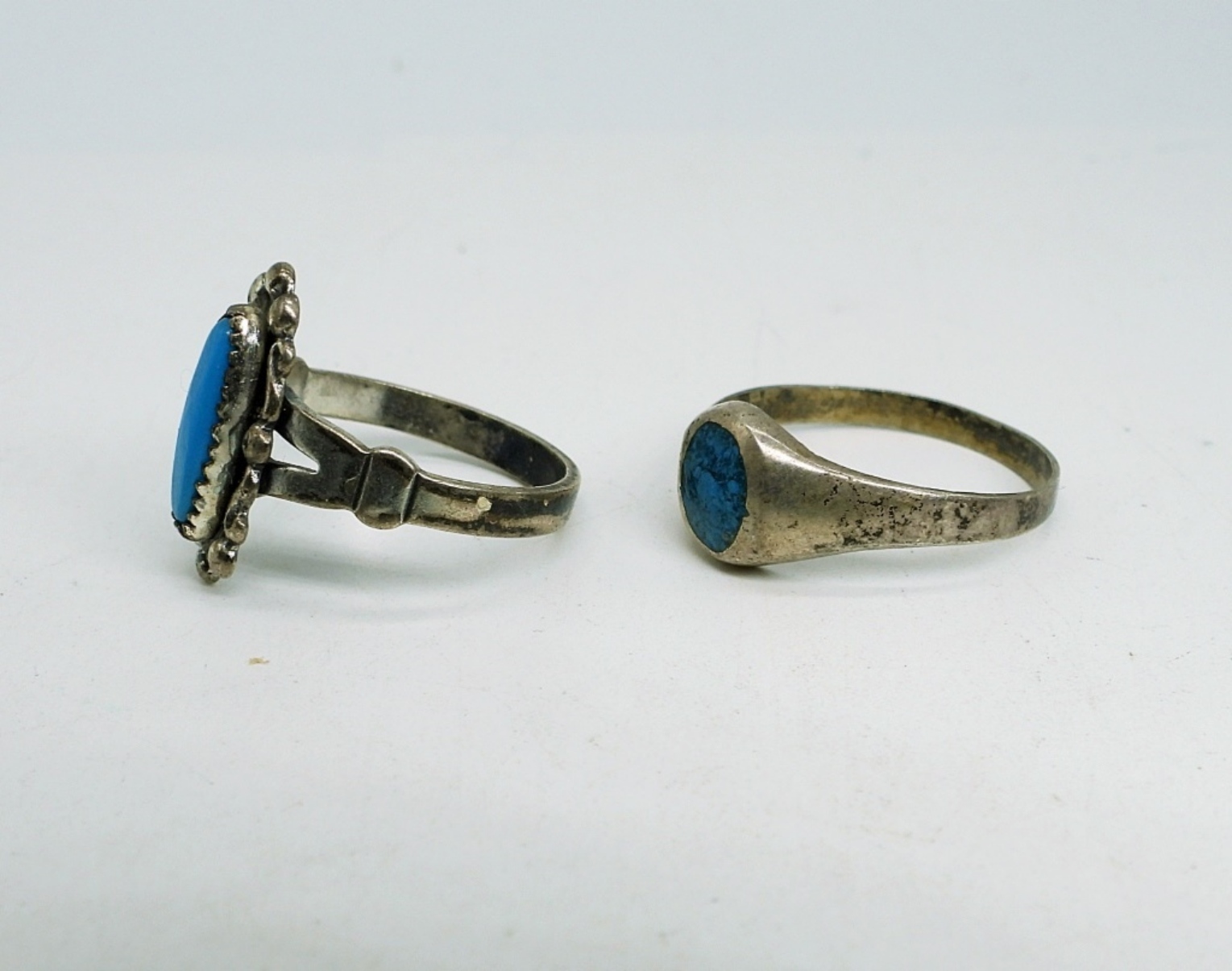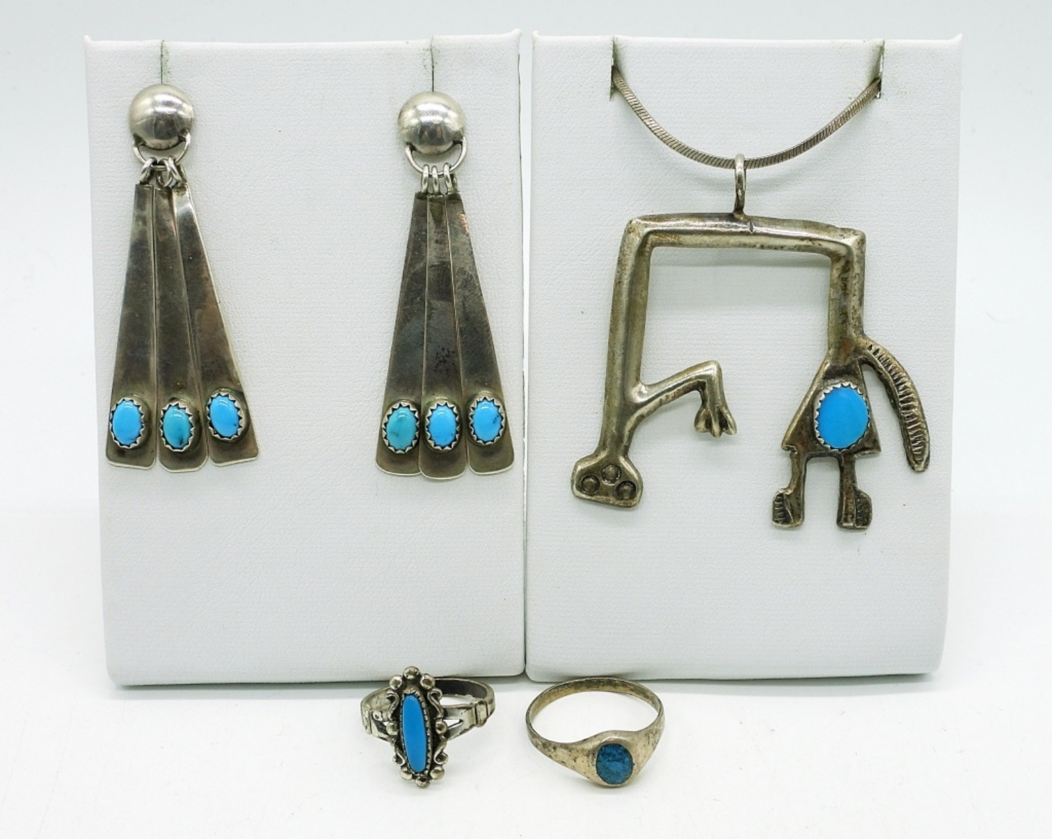 Vintage Sterling Silver, Handmade Yeibichei Pendant on a 23″ Sterling Chain. Pierced Sterling Vintage Earrings with Turquoise. Two Sterling & Turquoise Rings, Sizes 5 & 7. 22 DWT