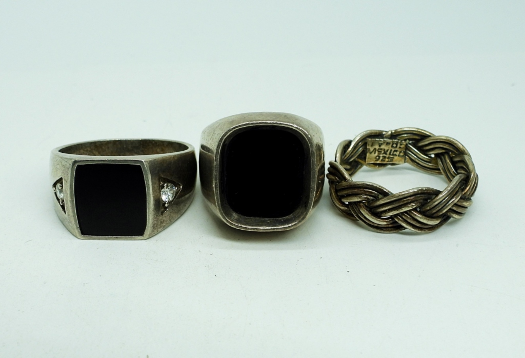 Three Sterling Silver Men’s Rings with Black Gemstones. Two Vintage Sterling Silver Rings, Made in Mexico. One braided, One with Black gemstone. One “AVON” Sterling Silver Ring with Black Gemstone and Clear Side Gemstones. (Sizes 8.5, 10, 13.5). 19.3 DWT