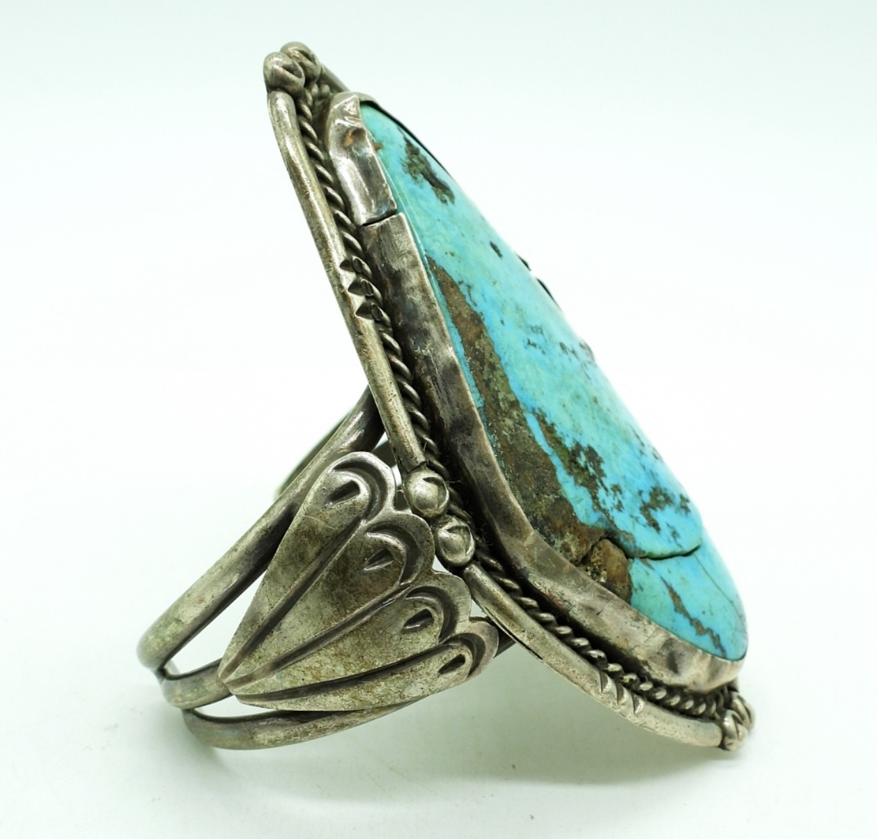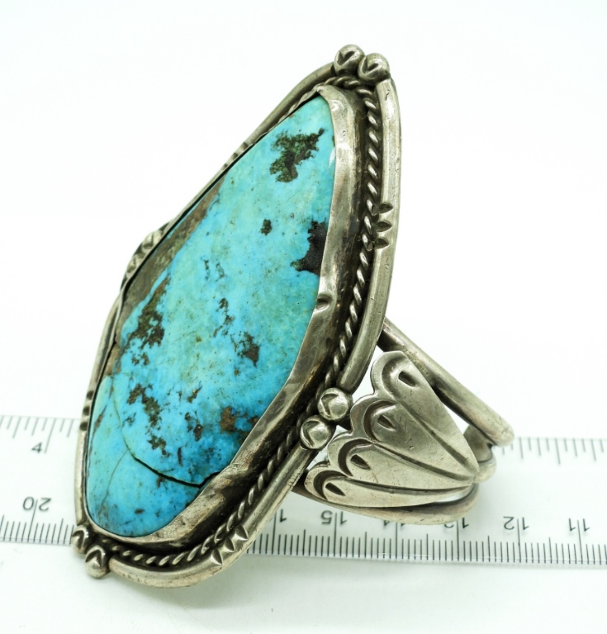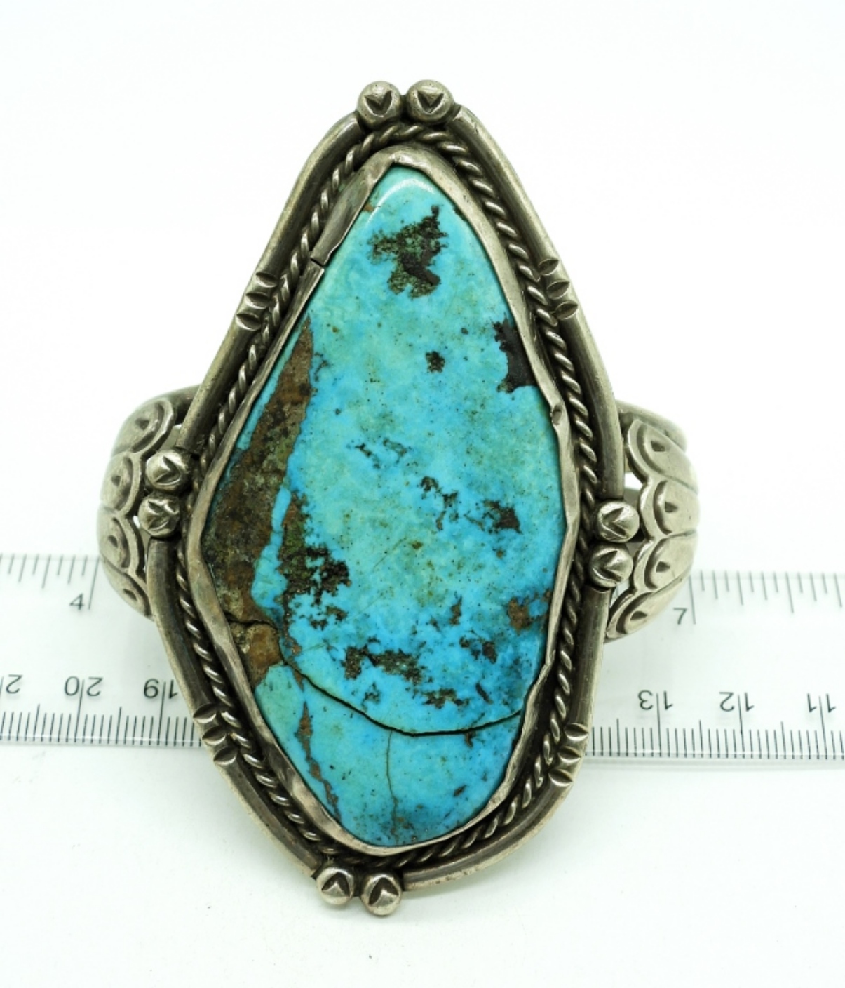 Vintage Handmade Sterling Silver Cuff Bracelet with a giant chunk of Turquoise! The turquoise chunk is cracked, but still very secure in its setting. 3″x 1.5″ Turquoise. Cuff measures 5.5″. 72.6 DWT