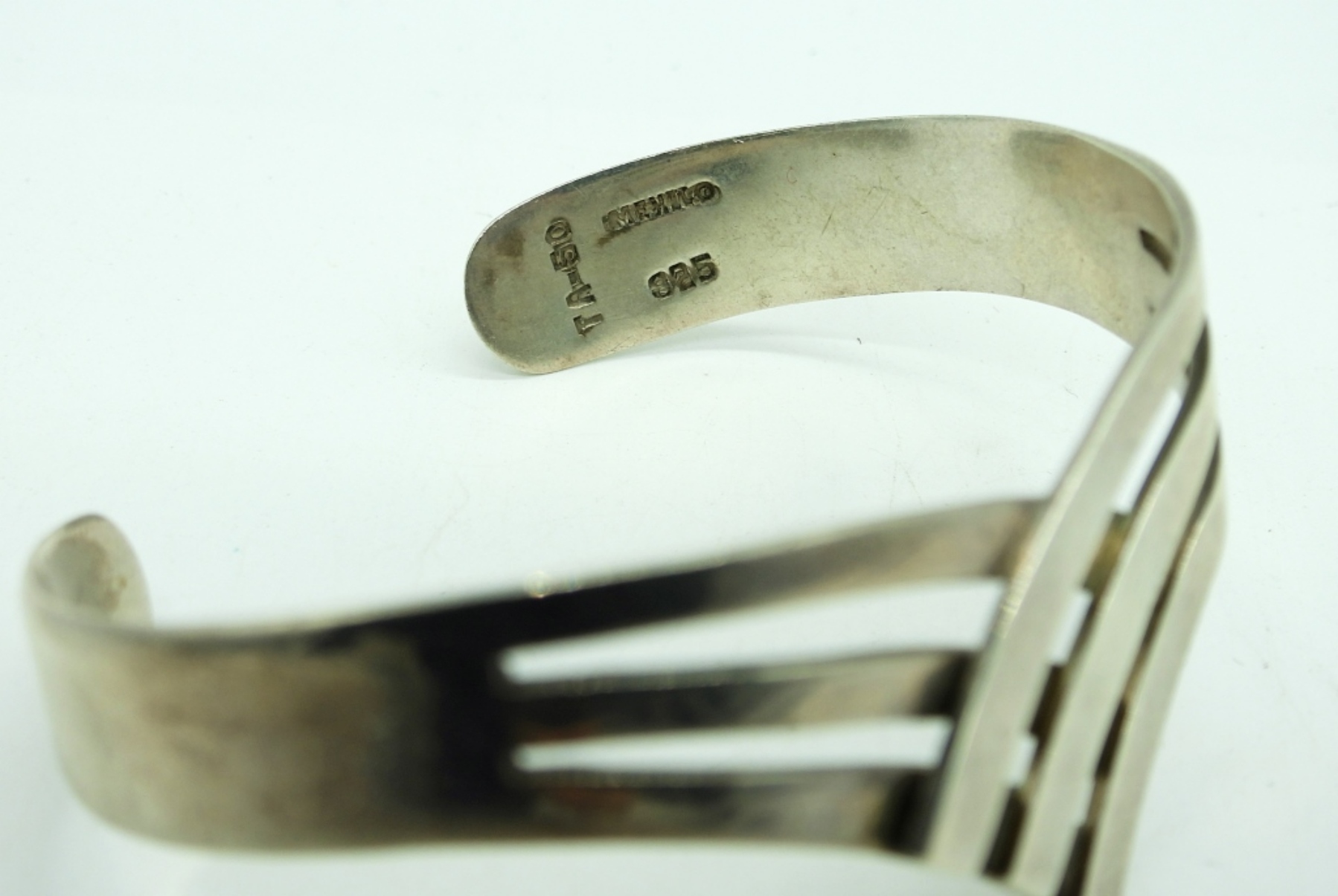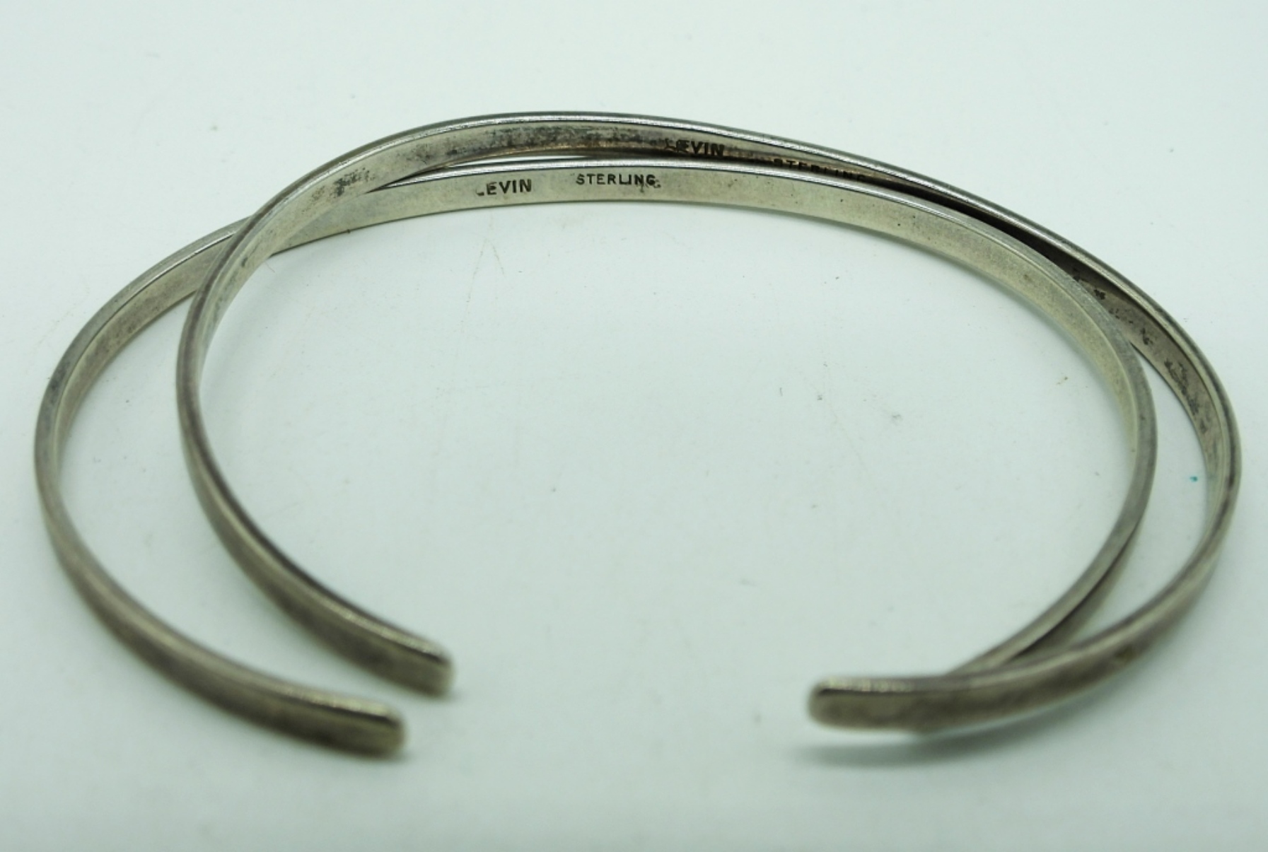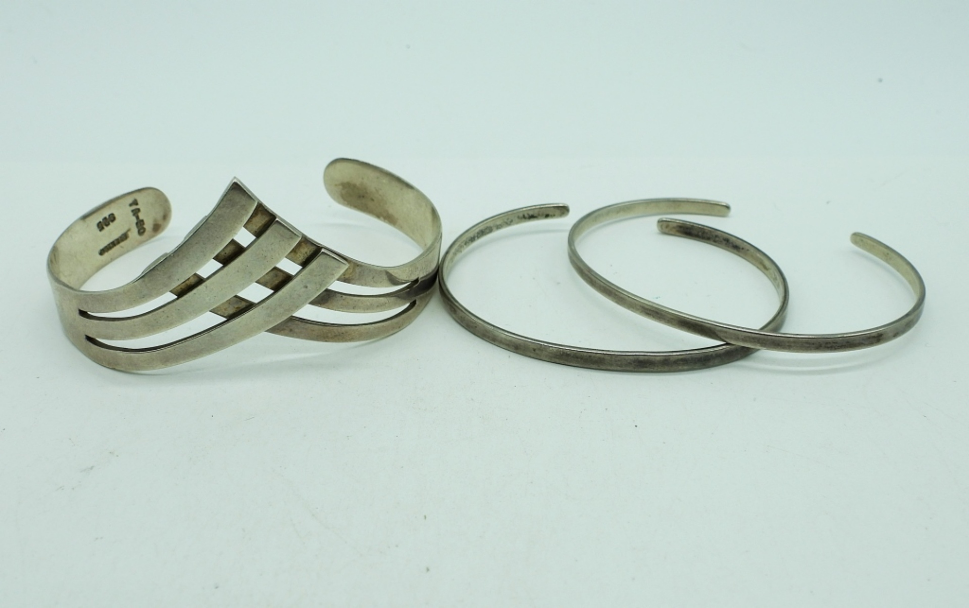 Three Sterling Silver Cuff Style Bracelets. Two thin “Levin Sterling” Bracelets, 5″. Chevron style bracelet is marked “Mexico 925″, 5”. 21 DWT