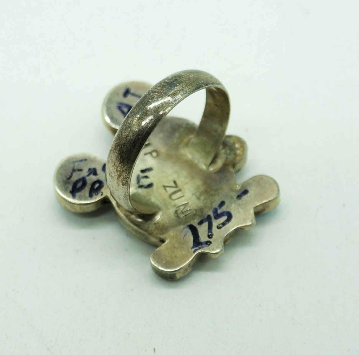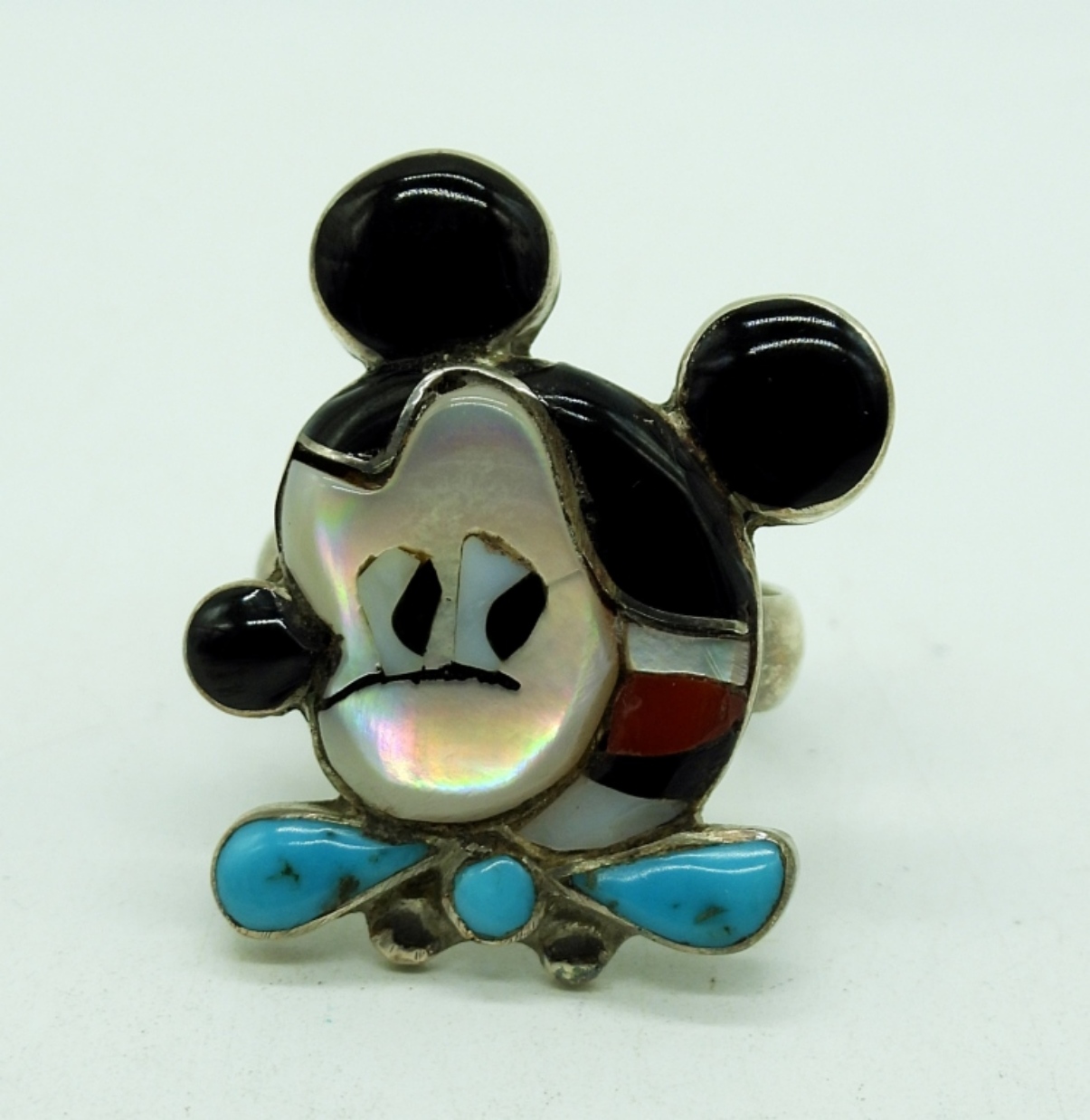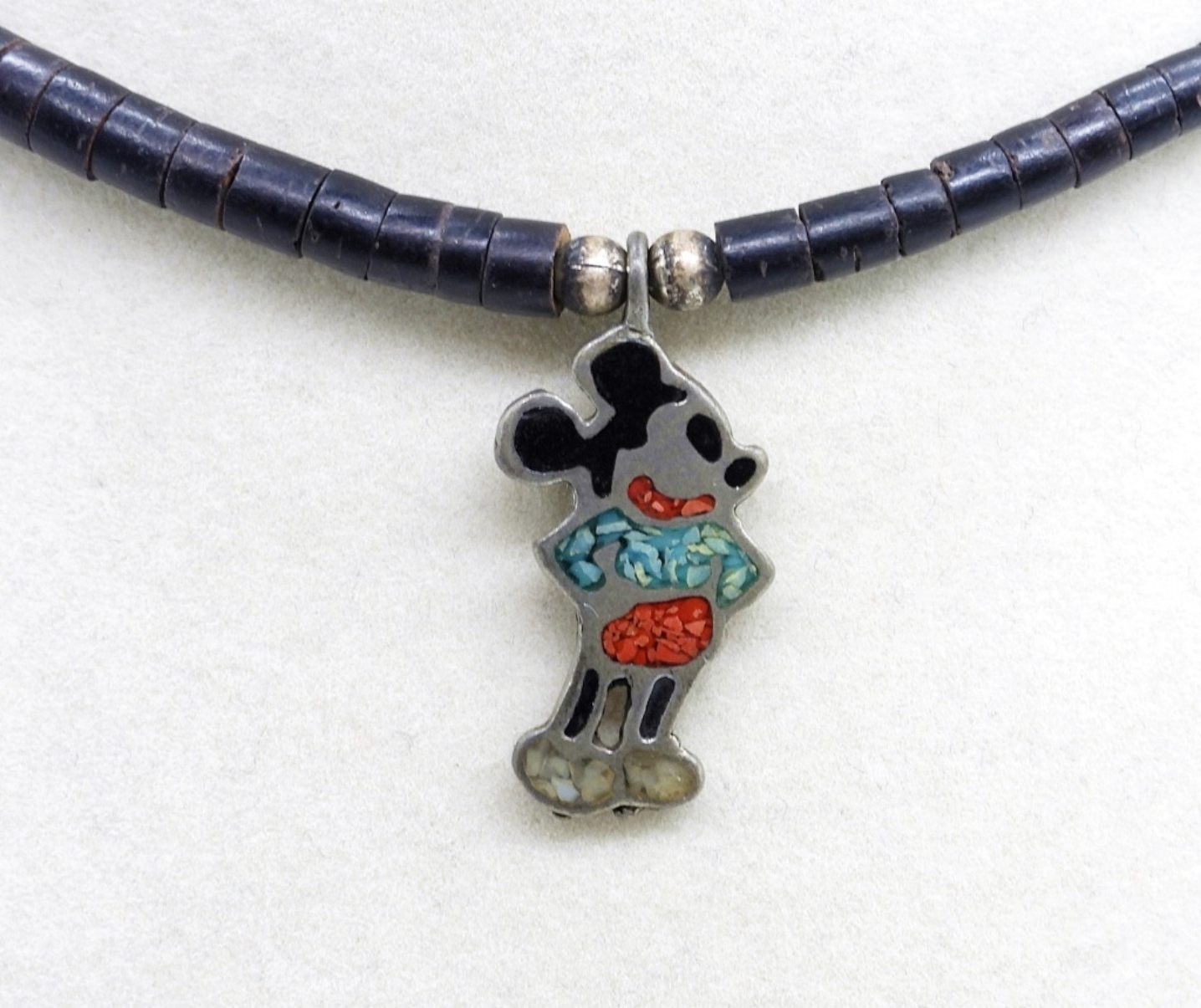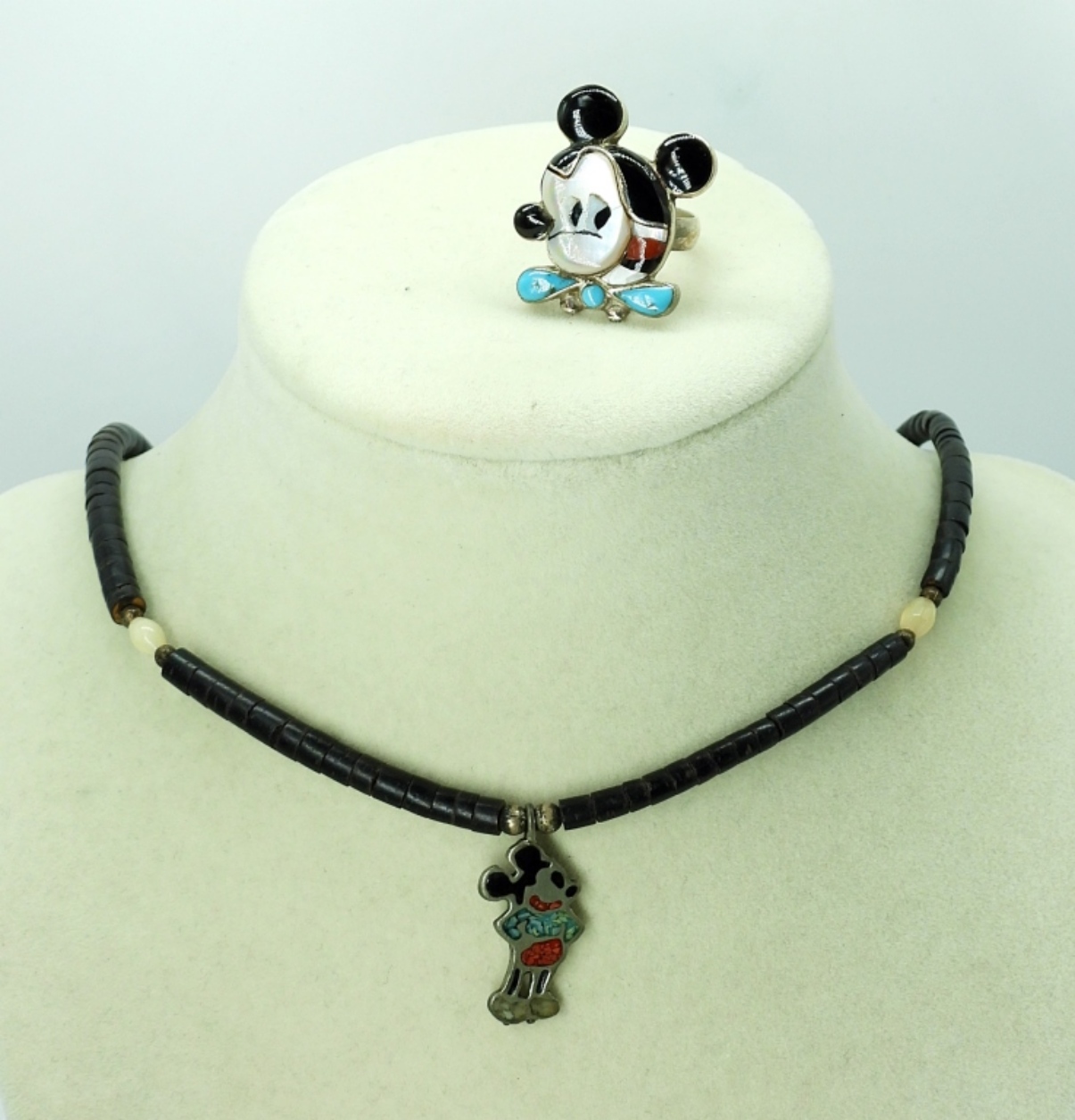 Vintage Sterling Silver, Zuni Mickey Mouse Ring, Size 6.5. (MARKED CMP – ZUNI). Black beaded necklace with sterling clasp and Mickey Mouse Pendant with inlaid turquoise. 12.4 DWT