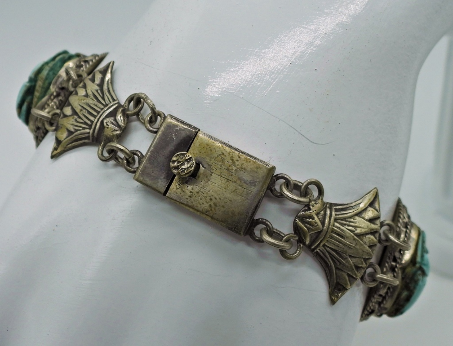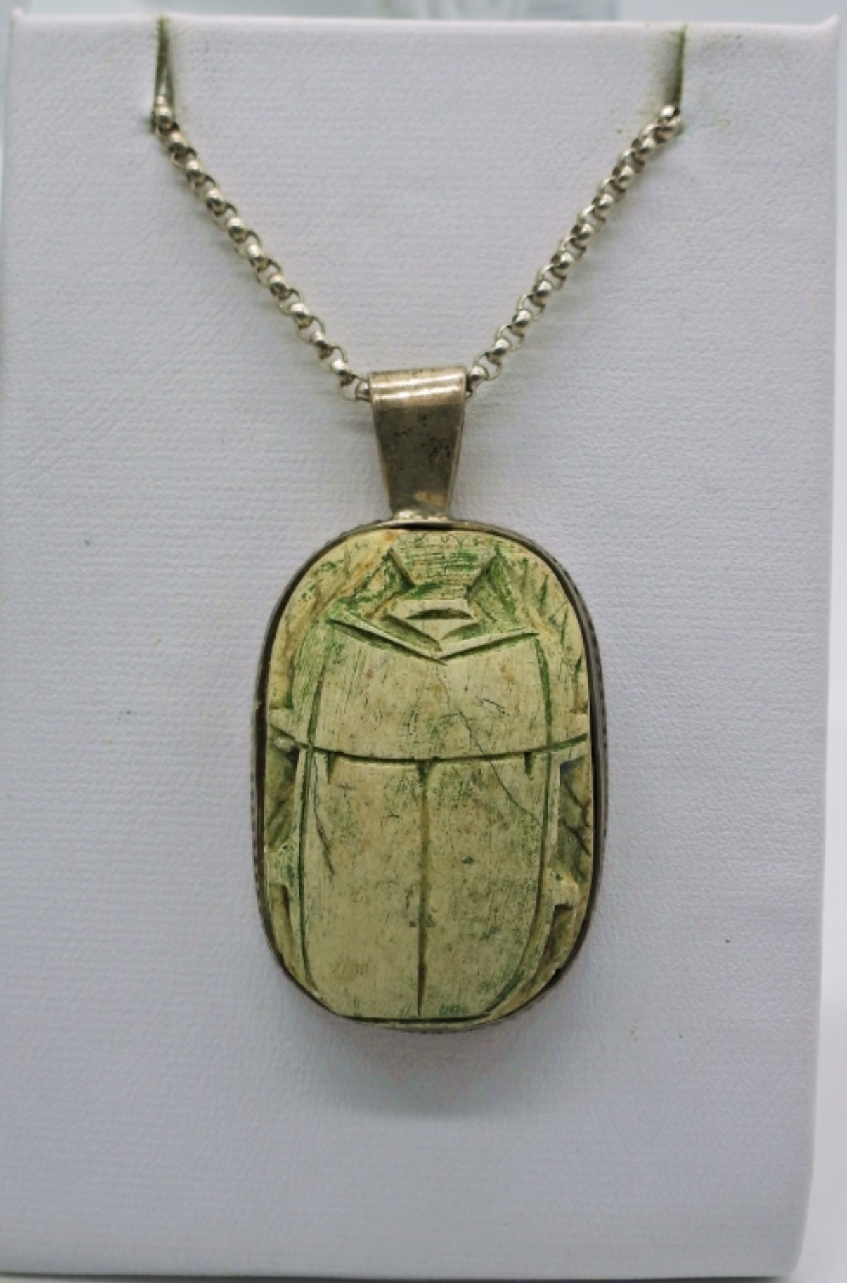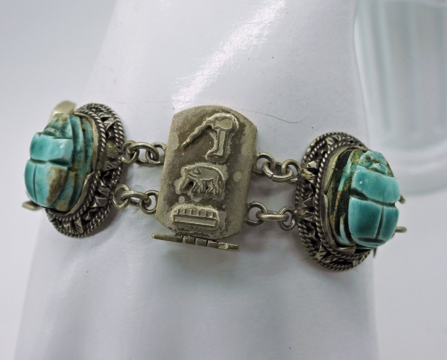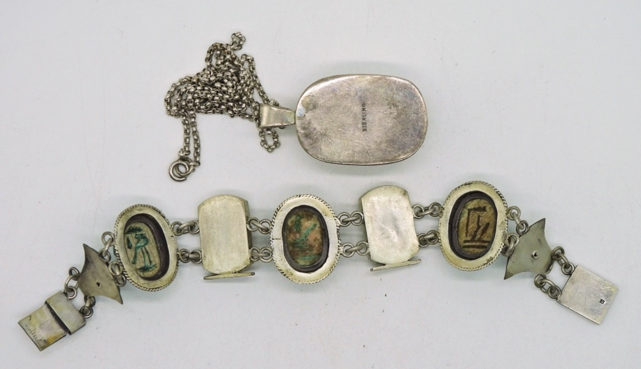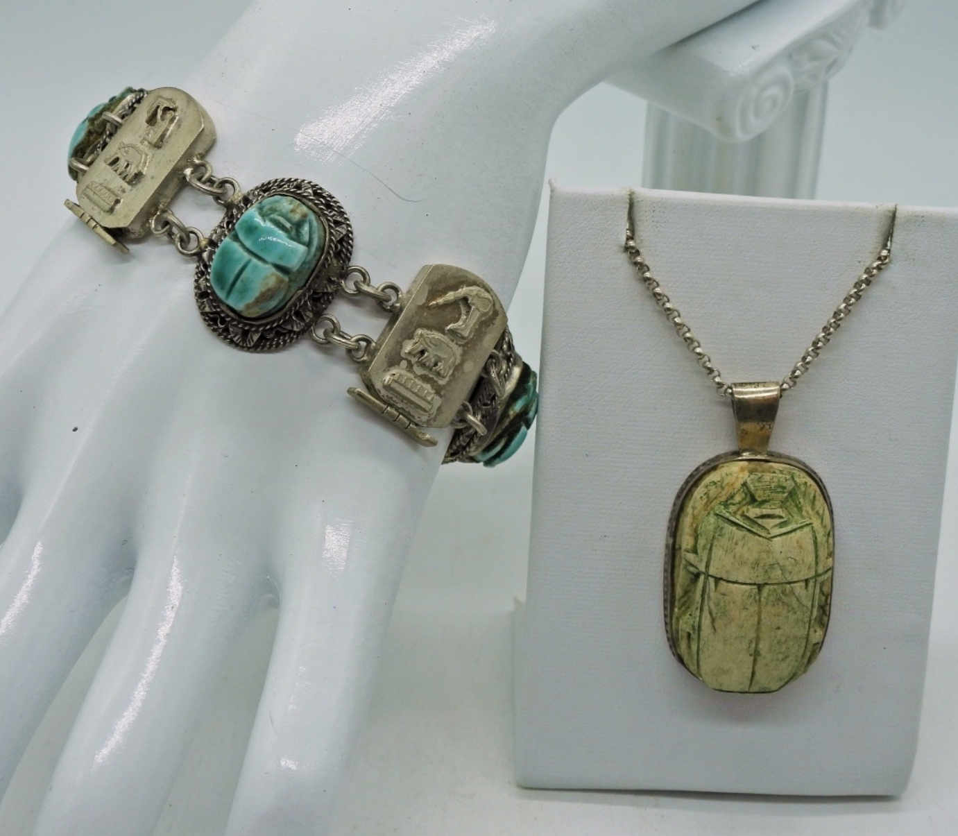 Sterling Silver, Vintage, Egyptian Revival Scarab Bracelet & Necklace. Scarabs carved out of stone/gemstone, Unknown what type. All is set in Sterling Silver, Sterling chain is 20″. 36 DWT
