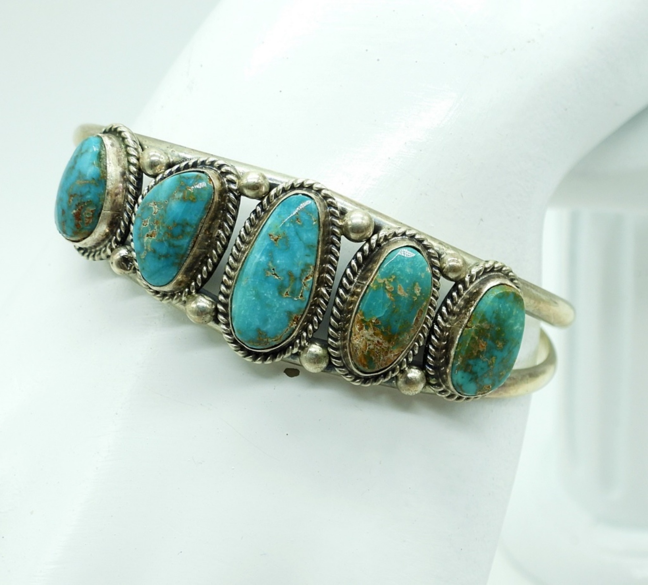 Sterling Silver Bracelet with 5 Turquoise Gemstones, 7″. Two Sterling Silver Rings with Turquoise Gemstones, Size 6. 20.1 DWT