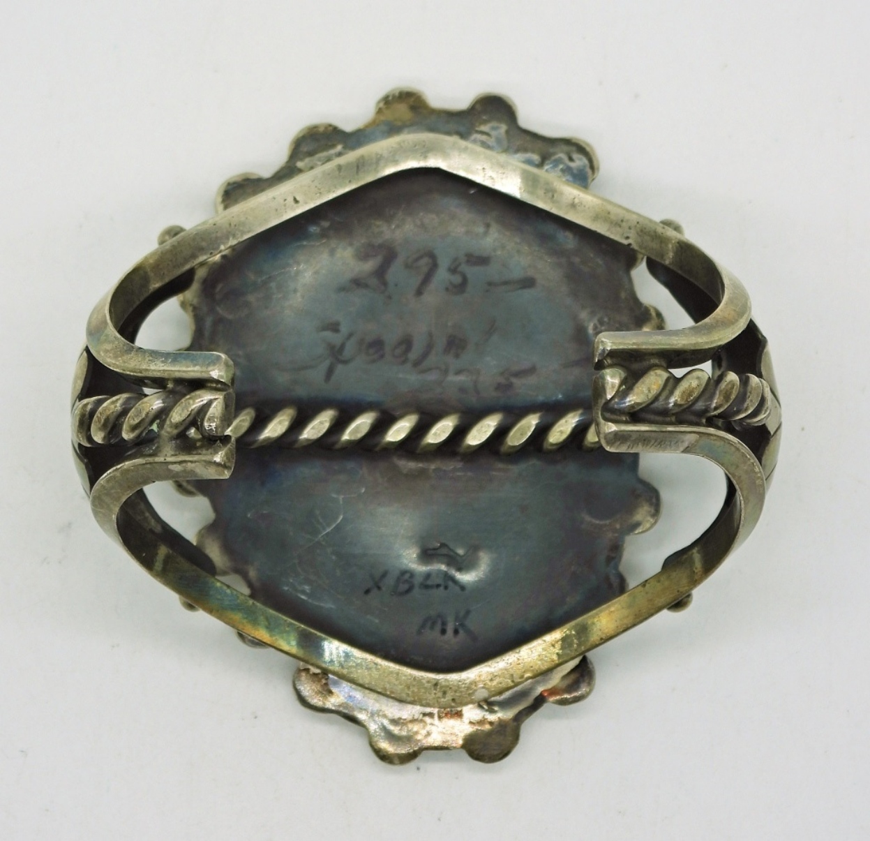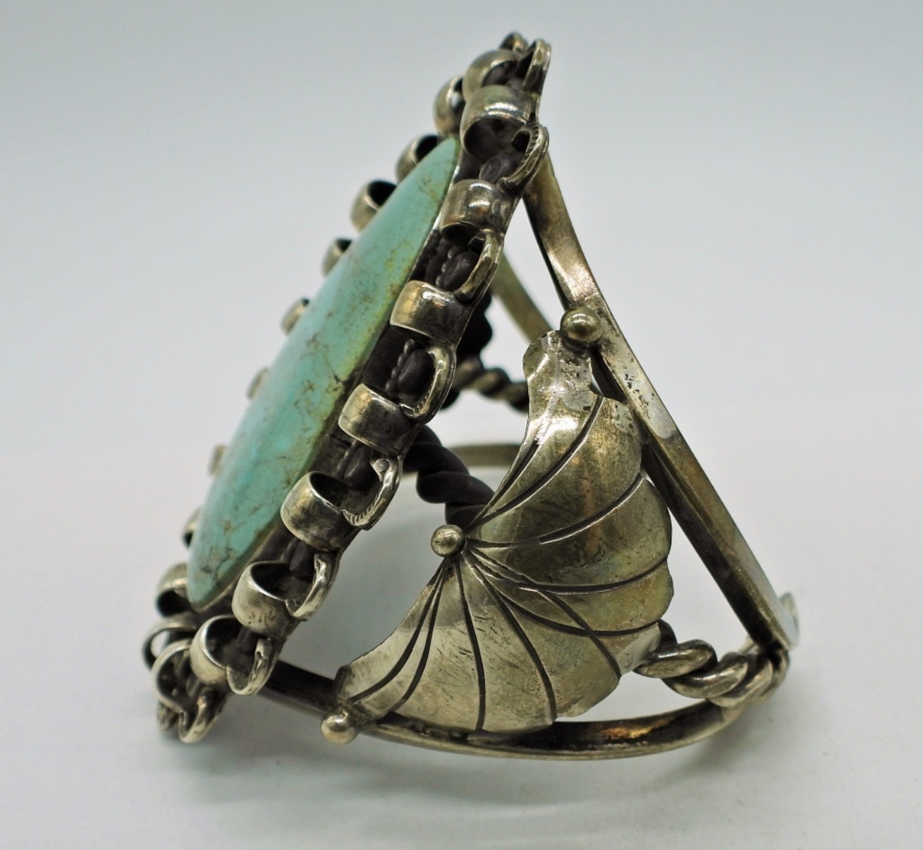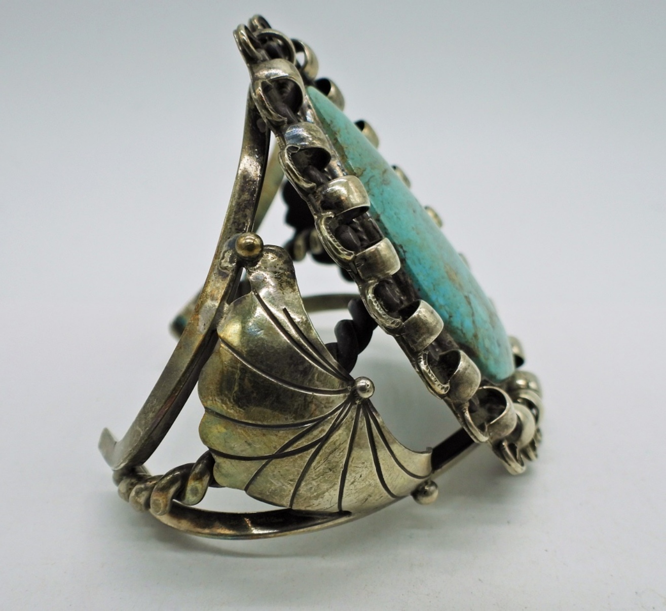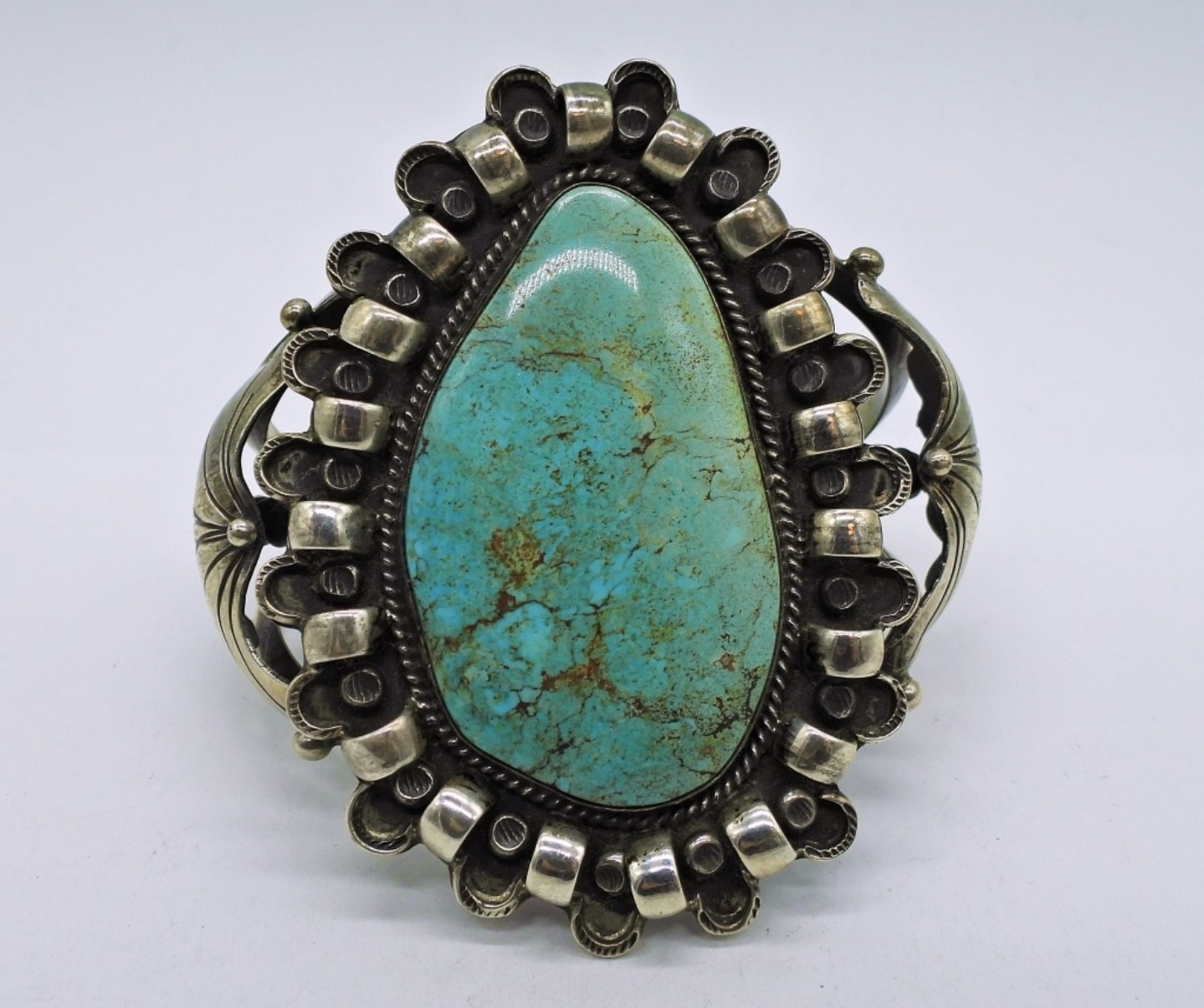 Vintage Sterling Silver Native American Turquoise Cuff Bracelet. 5″ bracelet, Turquoise measures 2″x 1″ roughly. A very Stunning Piece. 60.2 DWT