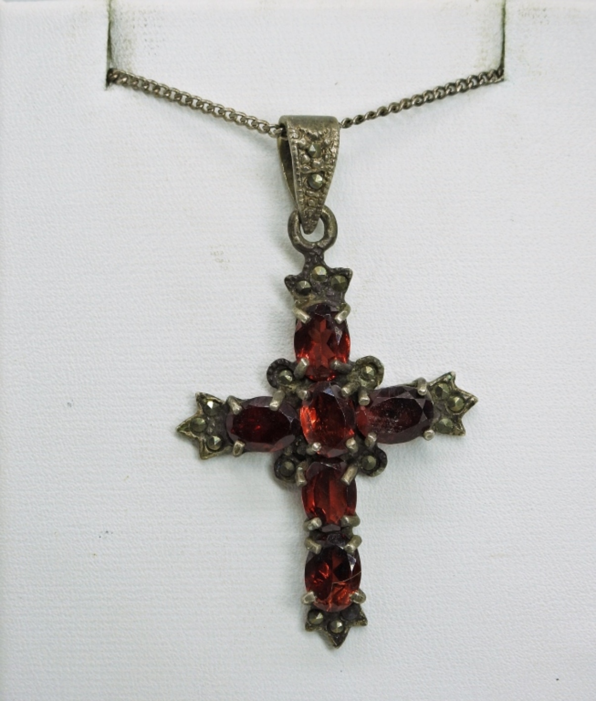 Sterling Silver, 2 Gemstone Crosses (Amber & Garnet). Sterling chain 18″. Five Sterling Saint Pendants. 24.4 DWT