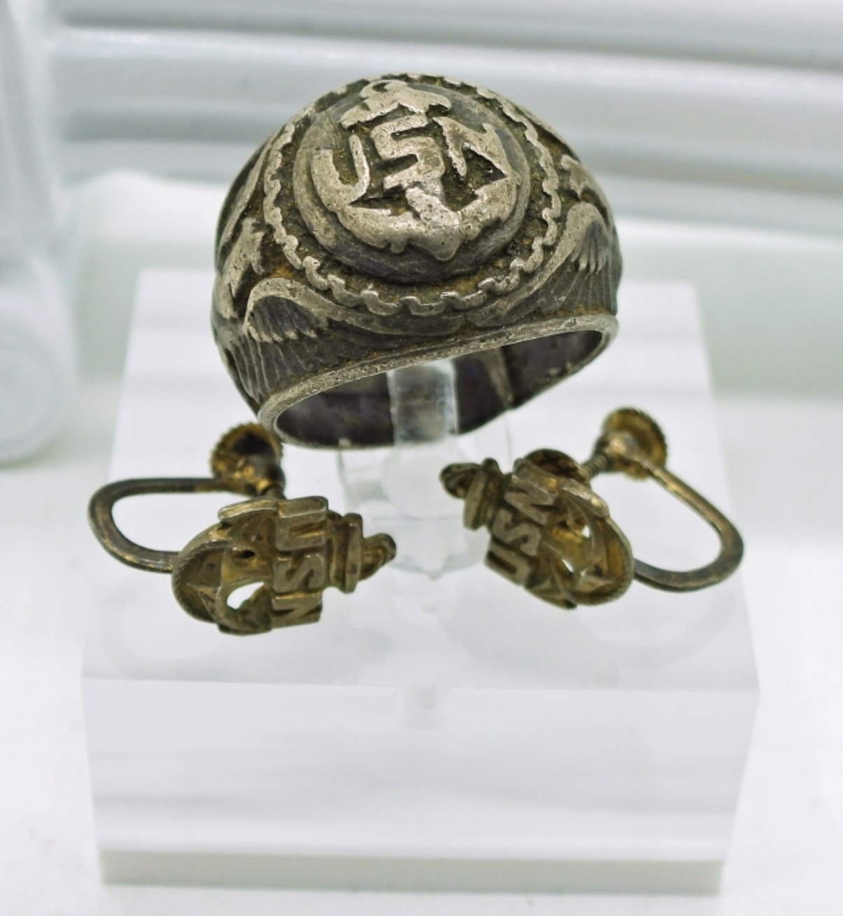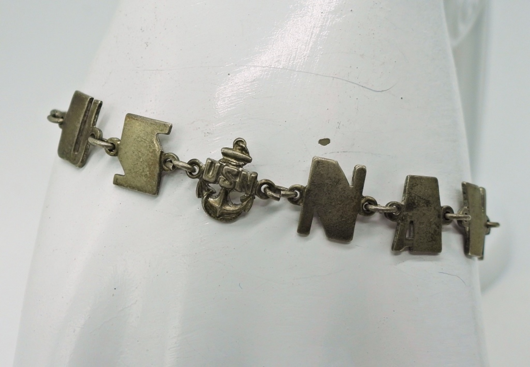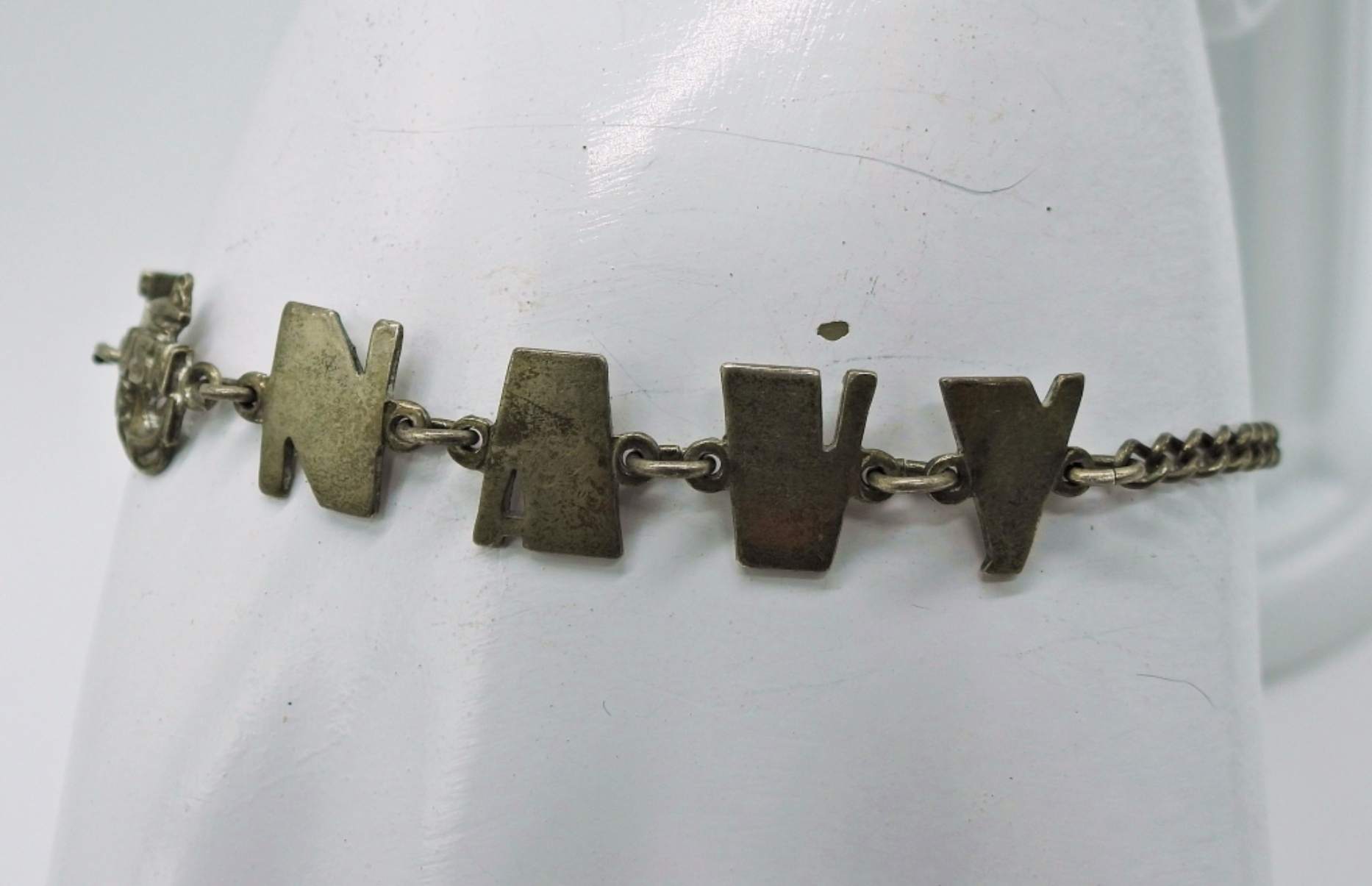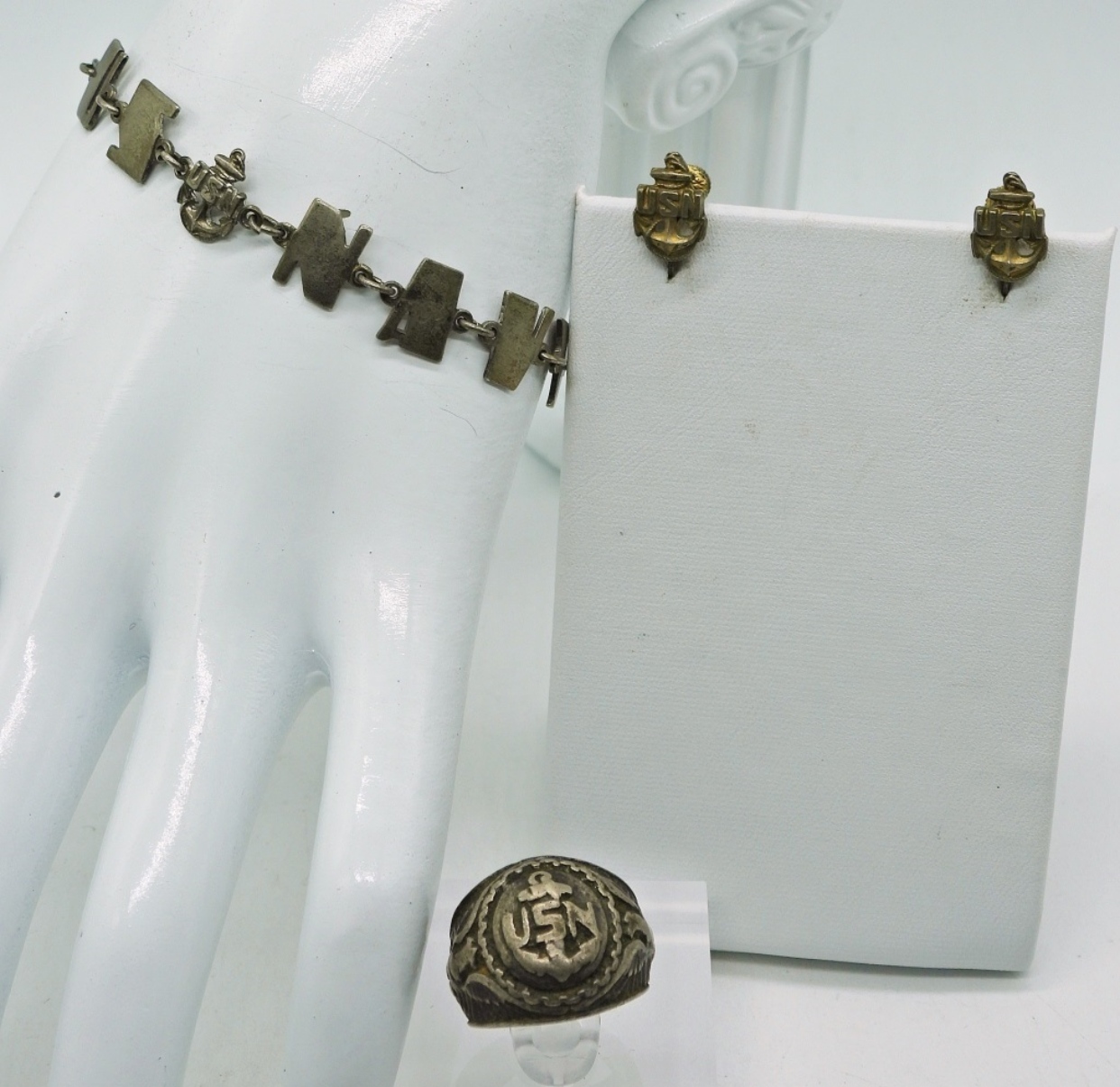 Vintage Sterling Silver U.S. Navy Women’s Jewelry. Bracelet is 7″. USN Sterling Silver Screw Back Earrings and a USN Sterling Ring (Band has been cut!), Size 6. 10.7 DWT