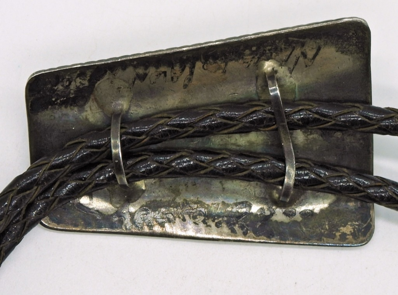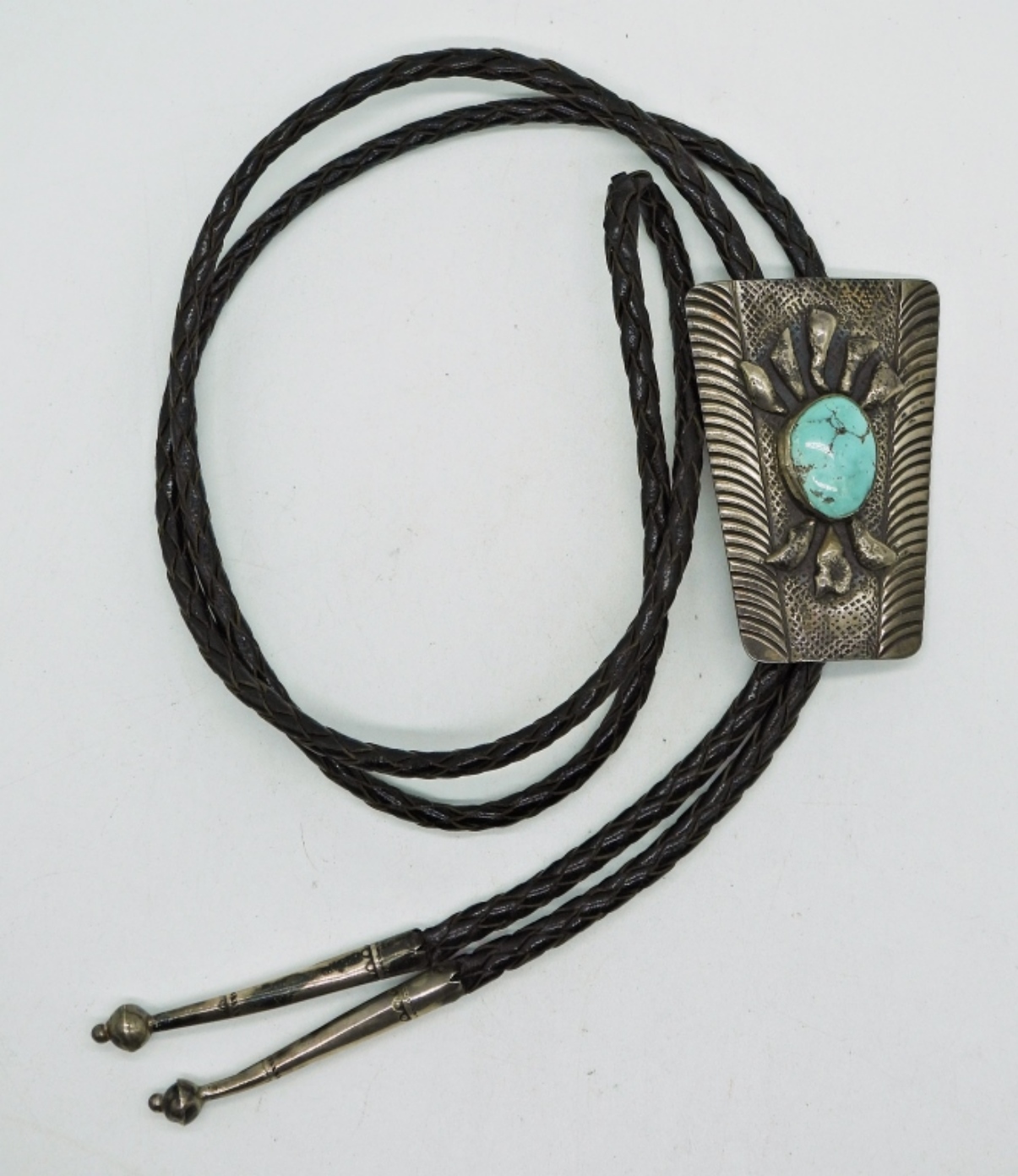 38″ Leather Bolo Tie with Sterling Silver Tips and Bolo Clip with Turquoise. Bolo clip is 2 1/4″x 1 1/4″. 27.1 DWT