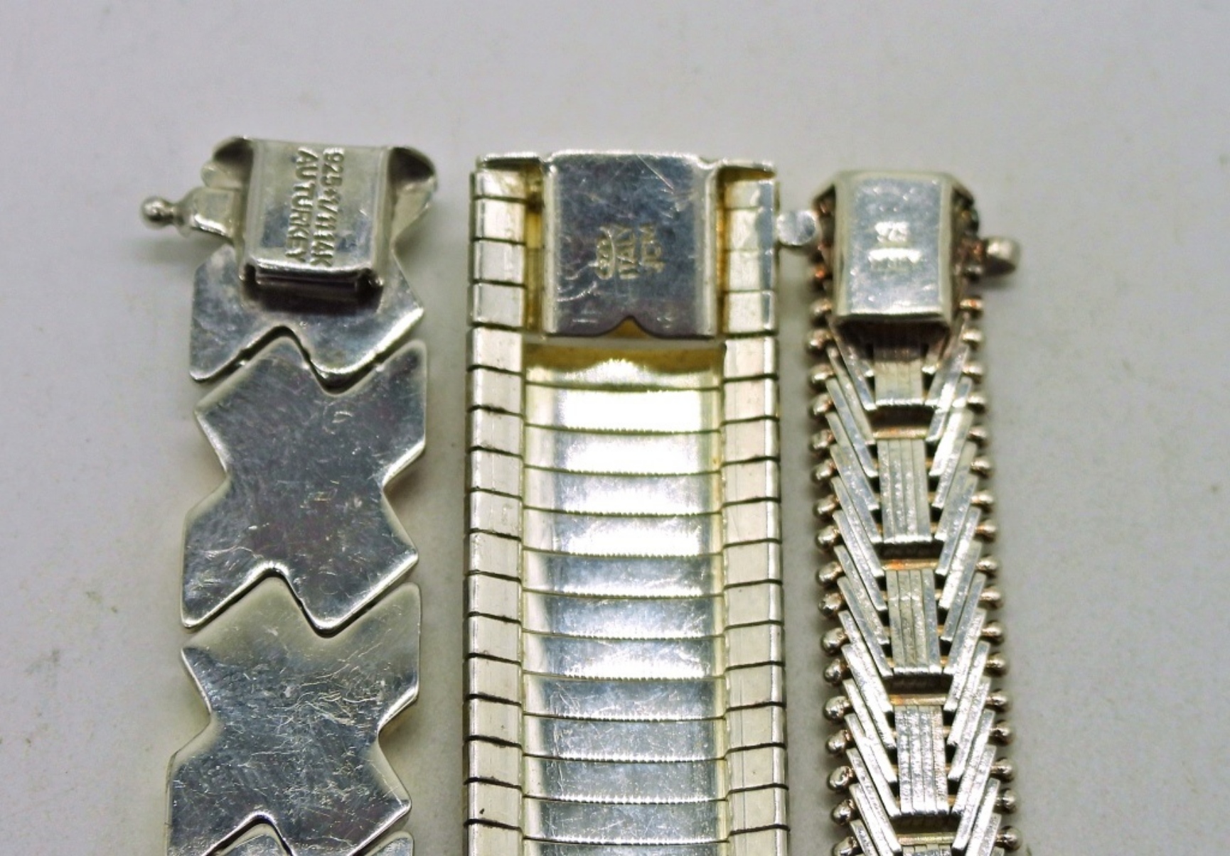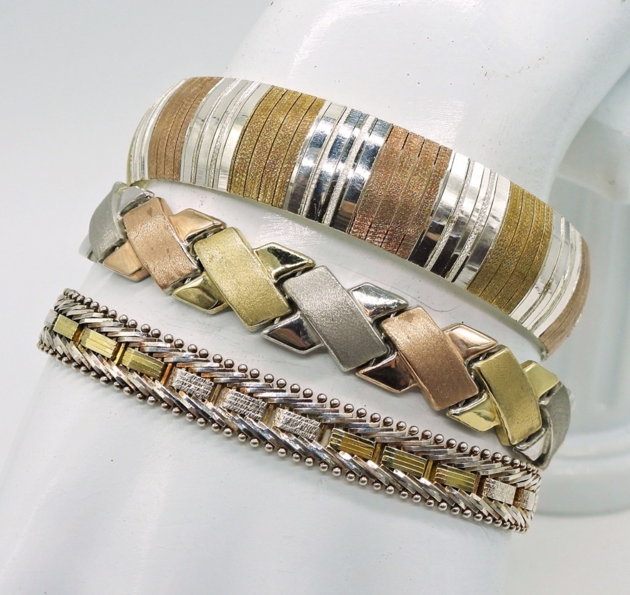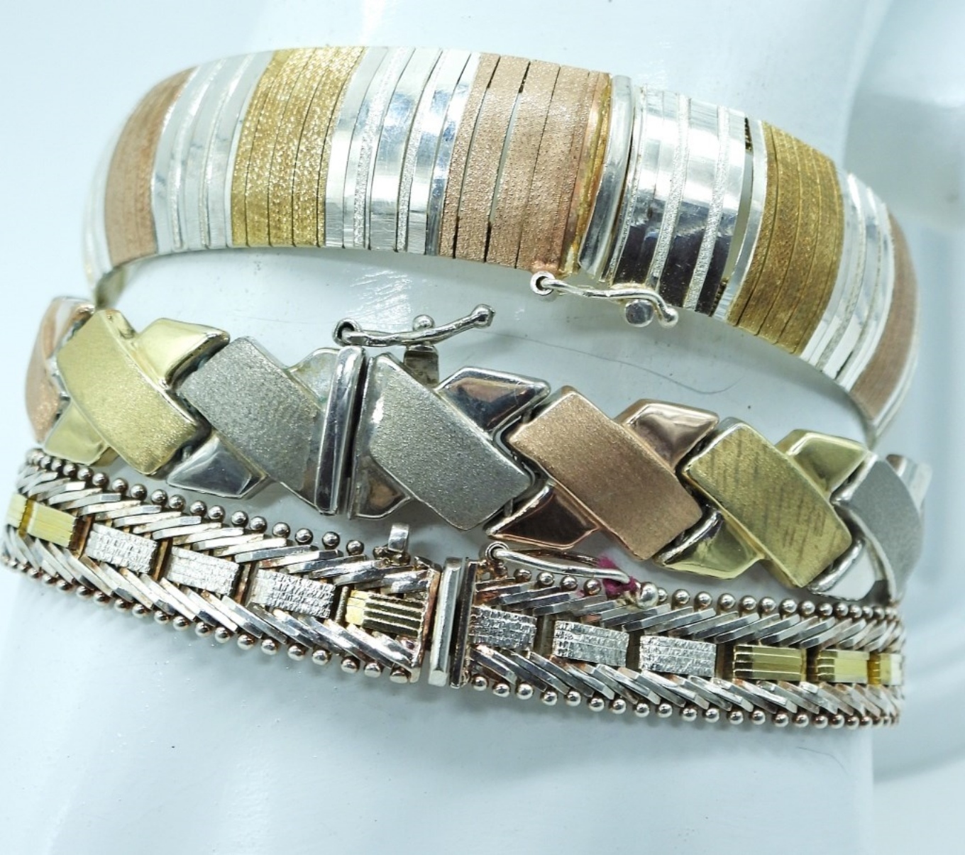 Three Sterling Silver Bracelets in Tri Tone. 7 – 7.5″. All Marked 925, X style bracelet marked “925+1/11 14k AUTURKEY”. 32.5 DWT