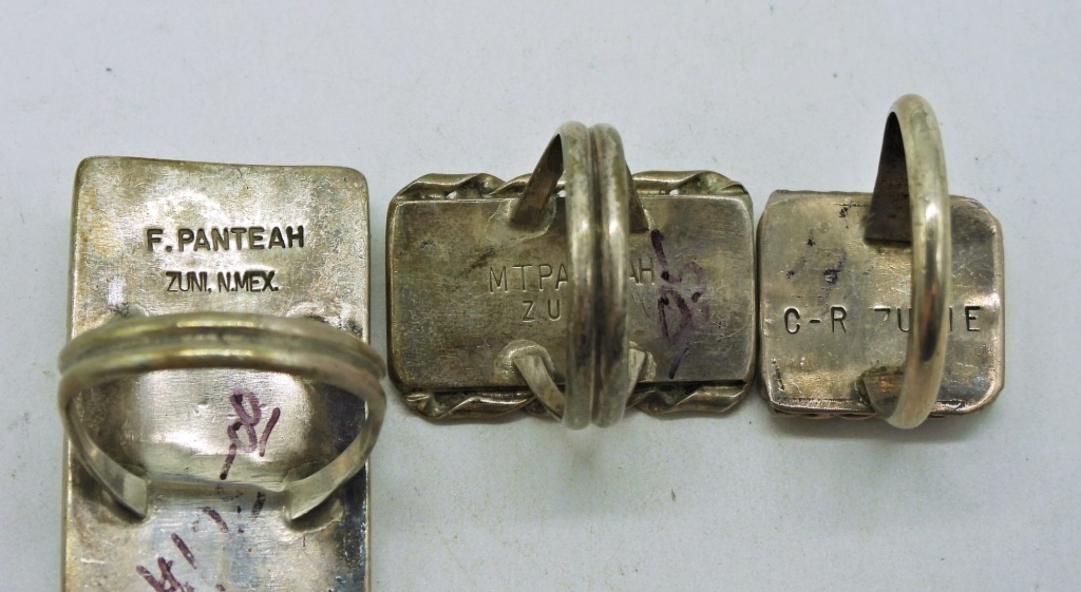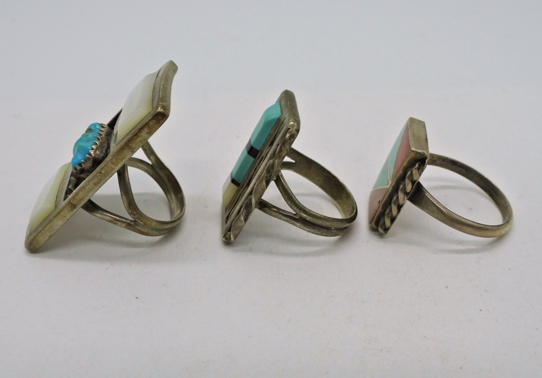 Three Sterling Silver ZUNI Rings. All 3 are marked ZUNI 925 as well as their makers mark. Mother of Pearl, Blue and Red Turquoise Gemstones. Sizes 6, 7 & 9.5. 17.5 DWT