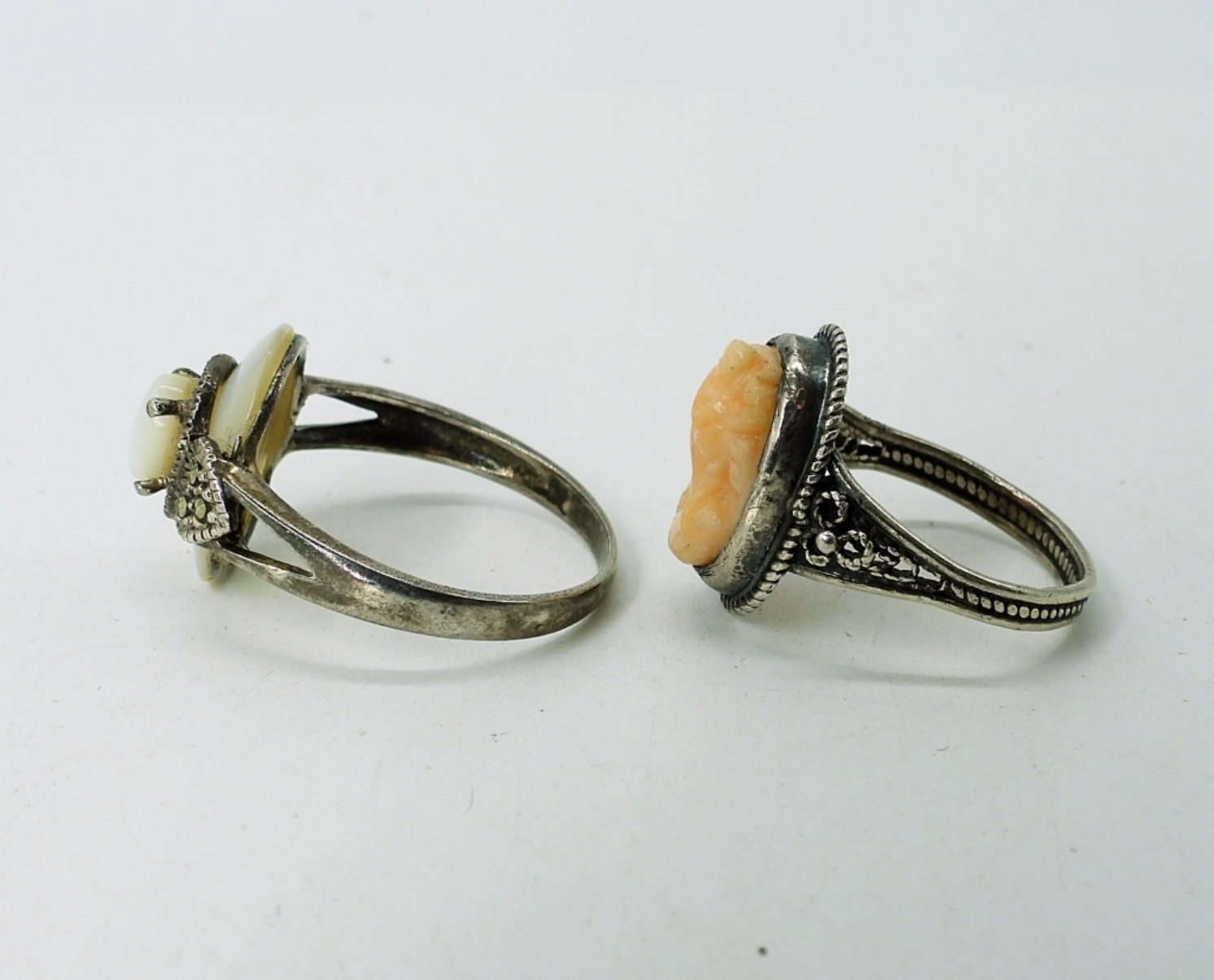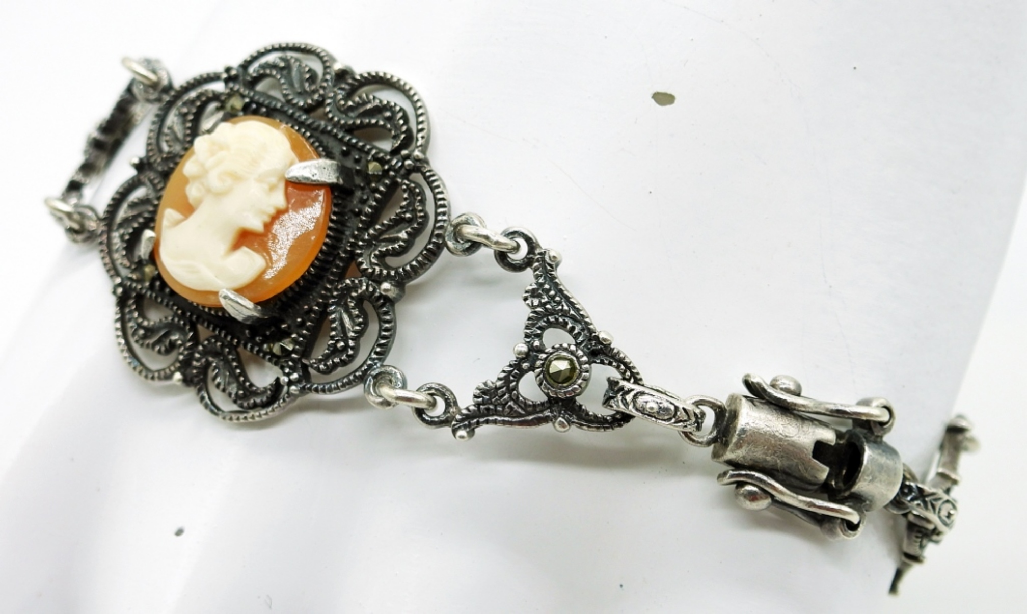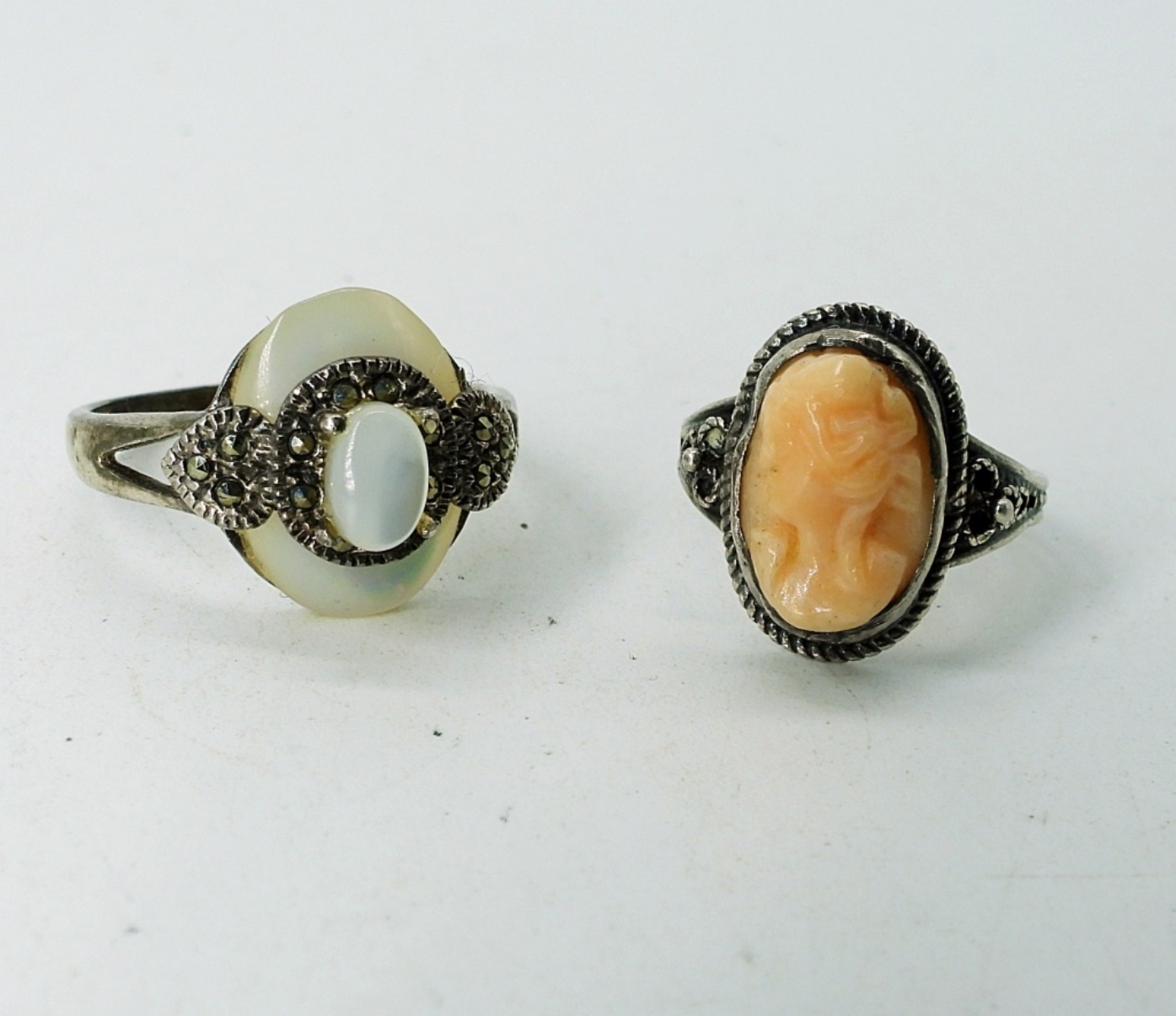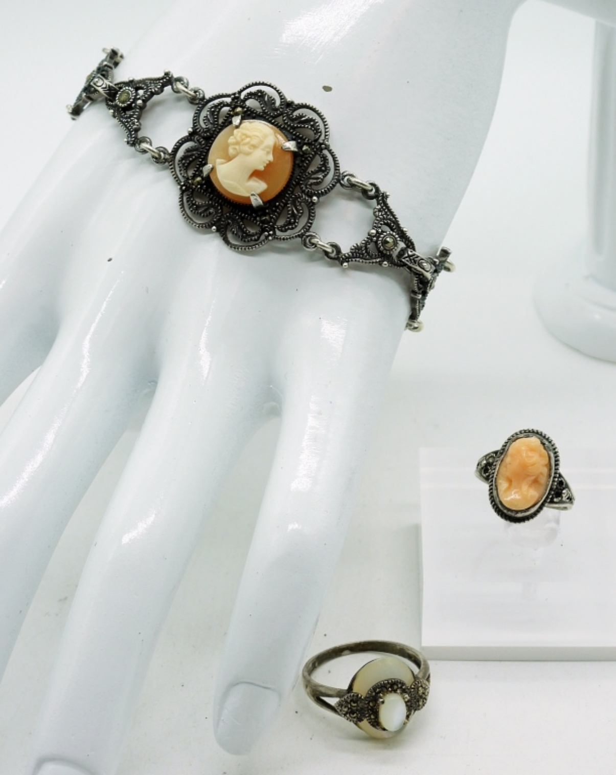 Gorgeous 3 Cameo Bracelet in Sterling Silver with Marcasite Accents, 7 3/4″. Cameo Ring in Sterling, Size 4. Mother of Pearl Ring, Size 7. 17.6 DWT