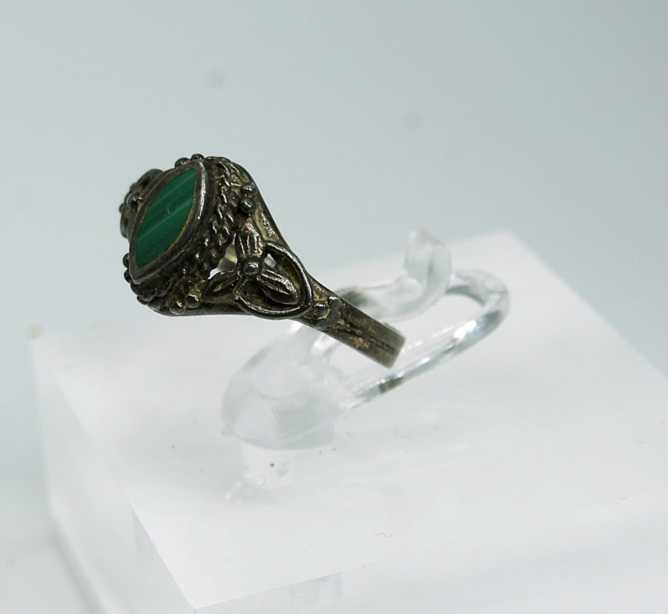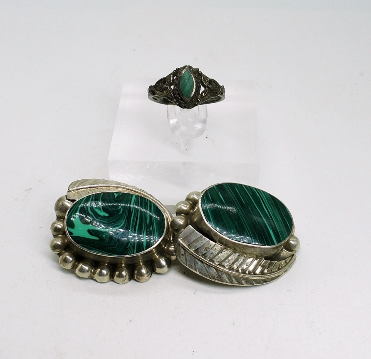 Vintage Malachite Clip On Earrings, 1 1/4″x 1″. Sterling Ring with Malachite Gemstone size 4.5. 16.4 DWT