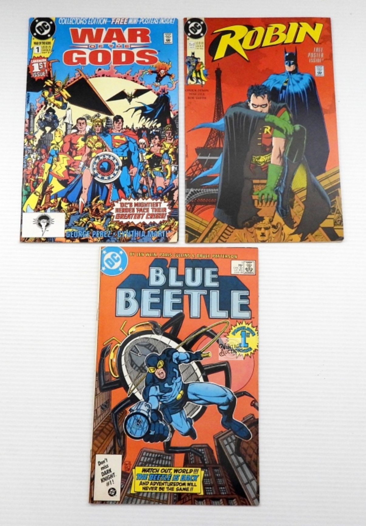 1986 BLUE BEETLE #1 ISSUE; 1990 ROBIN #1 ISSUE; 1991 WAR OF THE GOD #1 ISSUE – VERY GOOD CONDITION – SLEEVED/BOARDED